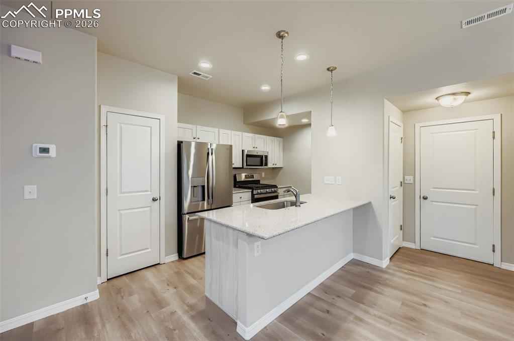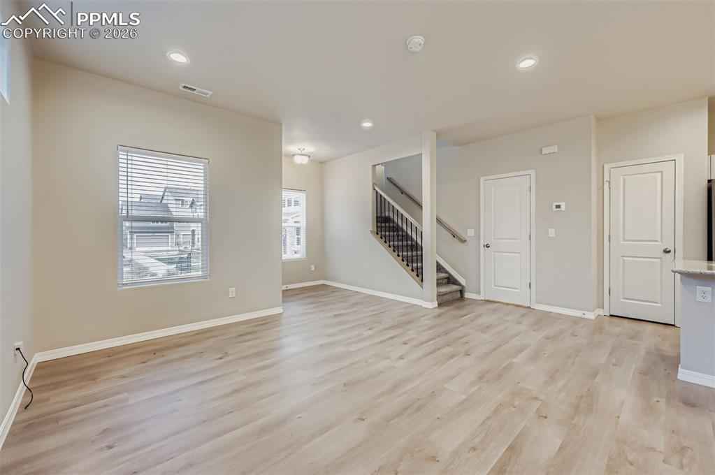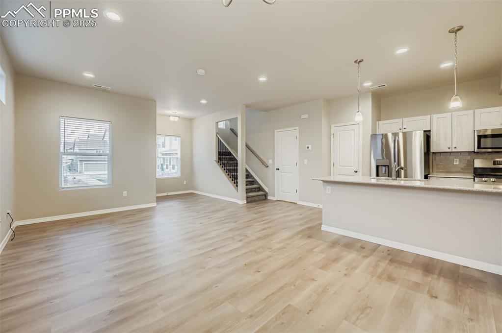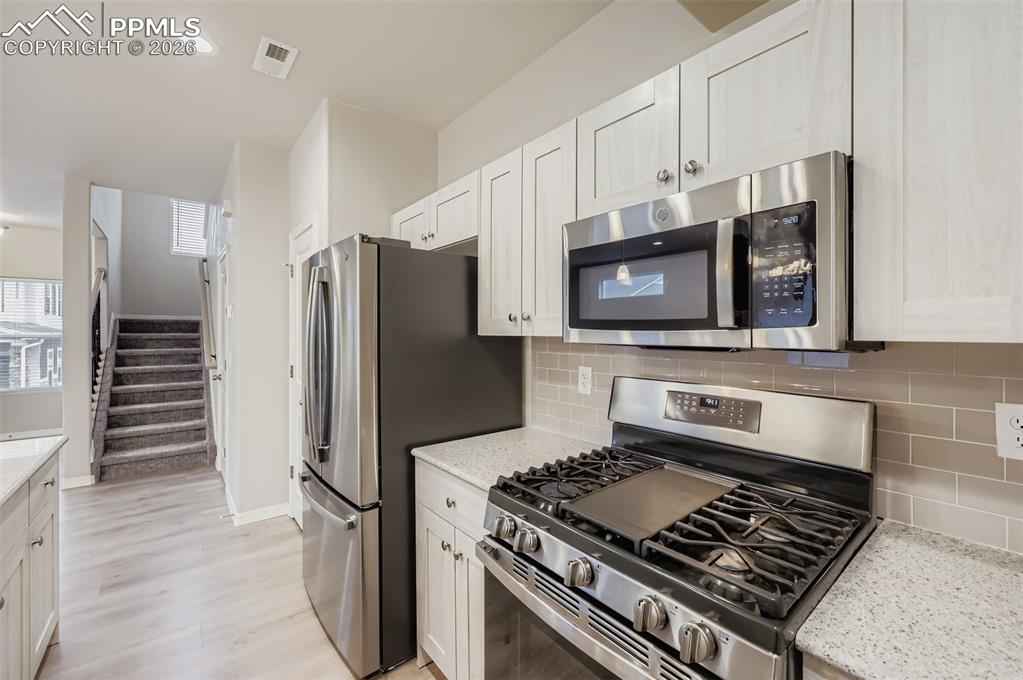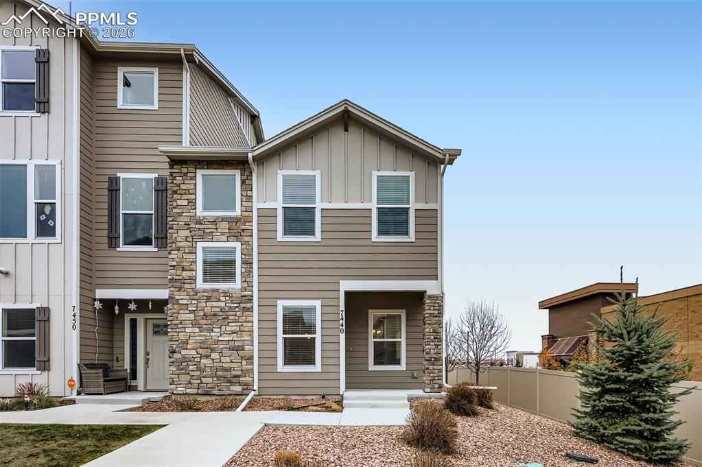 Desirable end-unit townhome located in District 49, offering extra privacy, natural light and a low-maintenance lifestyle! Walkable to nearby restaurants, coffee spots, nail salon and everyday services. This 3 bedroom, 2.5 bath home features an open and functional floor plan designed for everyday comfort and easy entertaining. The kitchen includes quartz countertops, modern tile backsplash, gas cooking and flows seamlessly into the dining and living areas. Upstairs, the spacious primary bedroom offers a relaxing retreat with a dual vanity bathroom, quartz countertops and walk in shower with built in seating. Two additional bedroom provide flexibility for a home office, a hobby room or guests. Recently replaced carpet and cordless blinds throughout. Washer and dryer located on the upper level convenient to all bedrooms. Lawn and sprinkler maintenance is taken care of by HOA.