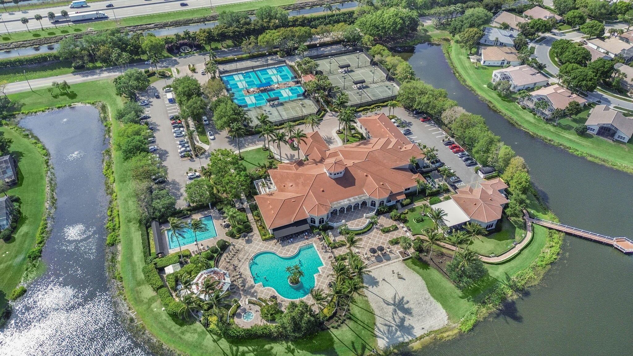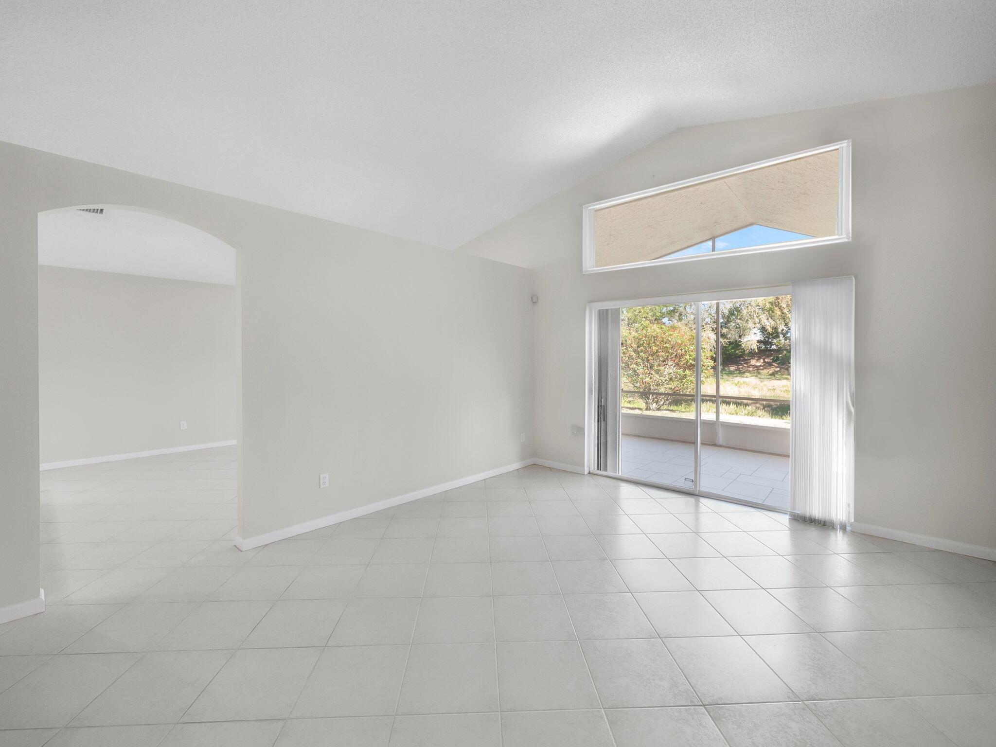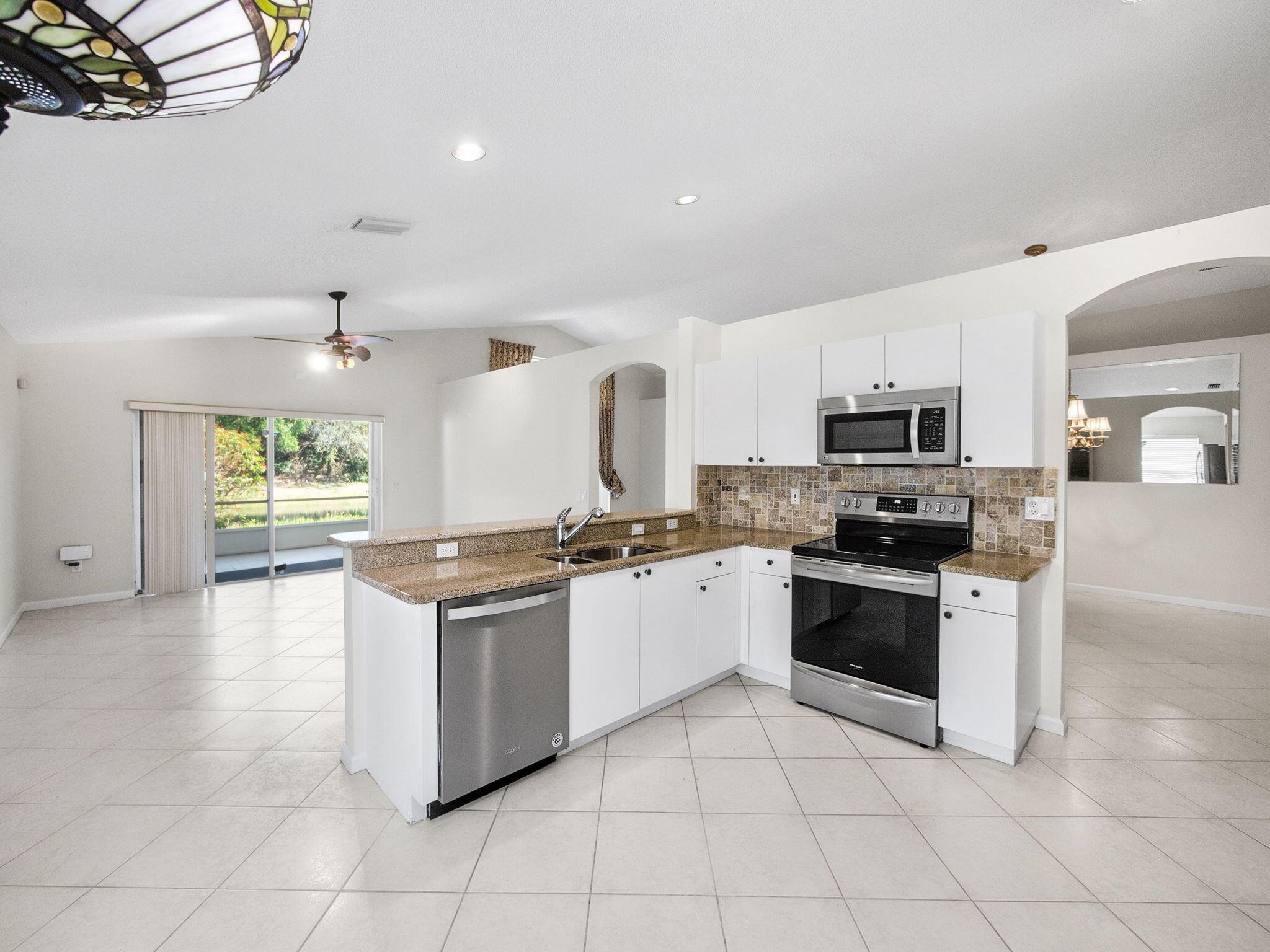 Coral model home in the highly sought-after 55+ community of Valencia Lakes, offering an unparalleled resort-style lifestyle. This spacious 3-bedroom home features a new roof (2023) and a desirable split-bedroom floor plan, with the third bedroom including a custom Murphy bed, providing versatility for guests or a home office. Nestled on a private lot with no rear neighbors, this waterfront home boasts breathtaking views and lush tropical landscaping. The open-concept eat-in kitchen is designed for both style and functionality, featuring granite countertops, upgraded cabinetry with plenty of storage, full backsplash, stainless steel appliances, & a family room just off the kitchen. The great room seamlessly connects the dining & living areas, creating an inviting space for entertainment