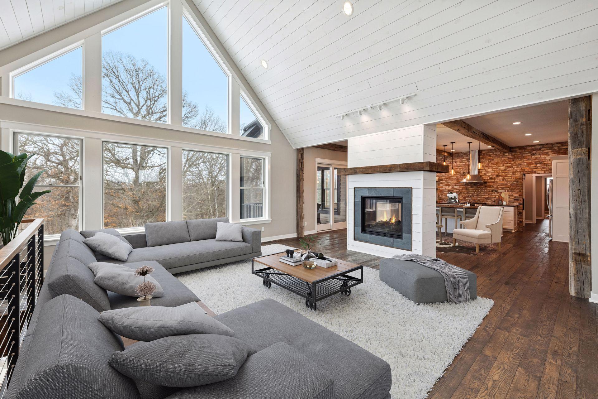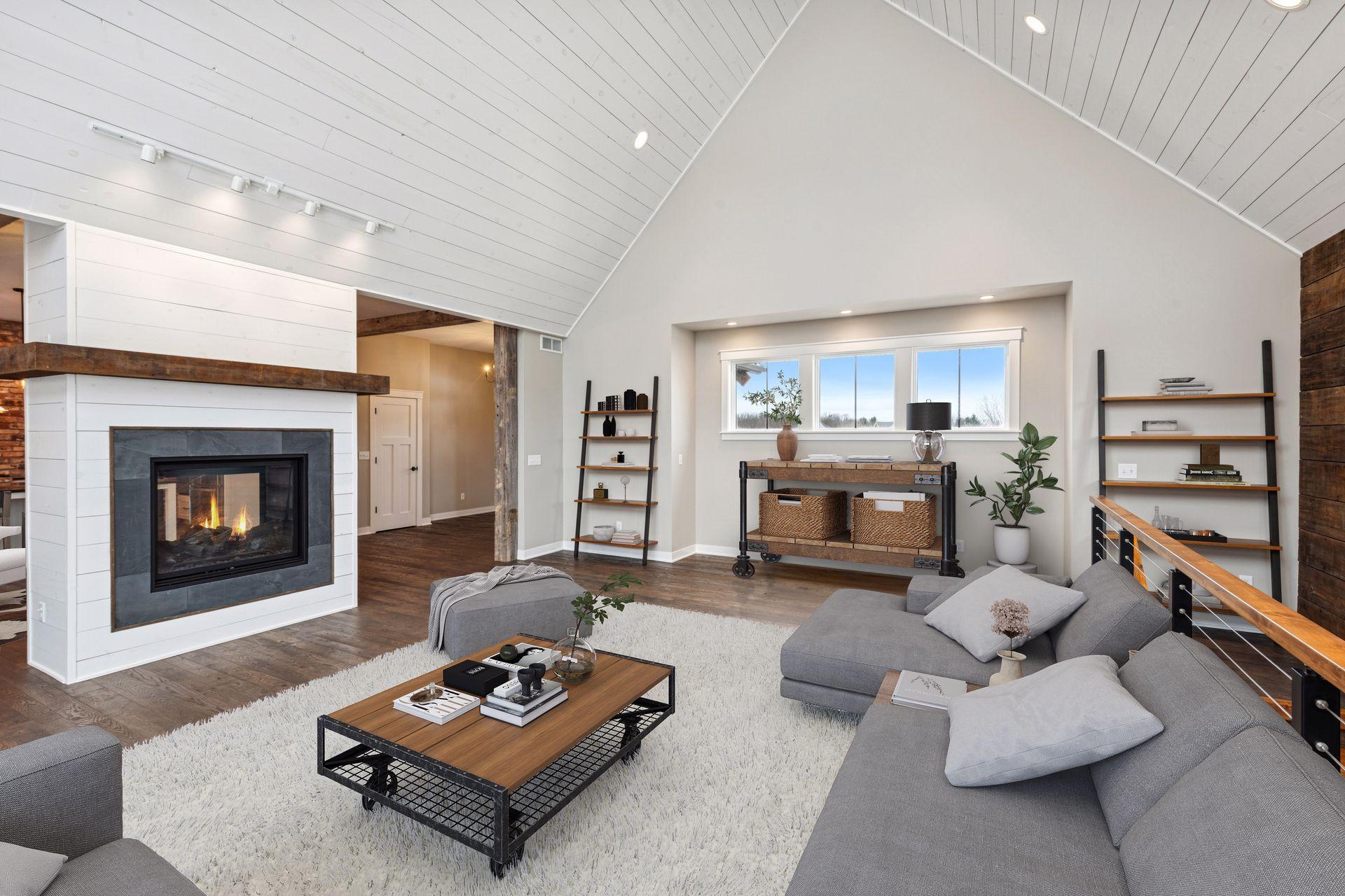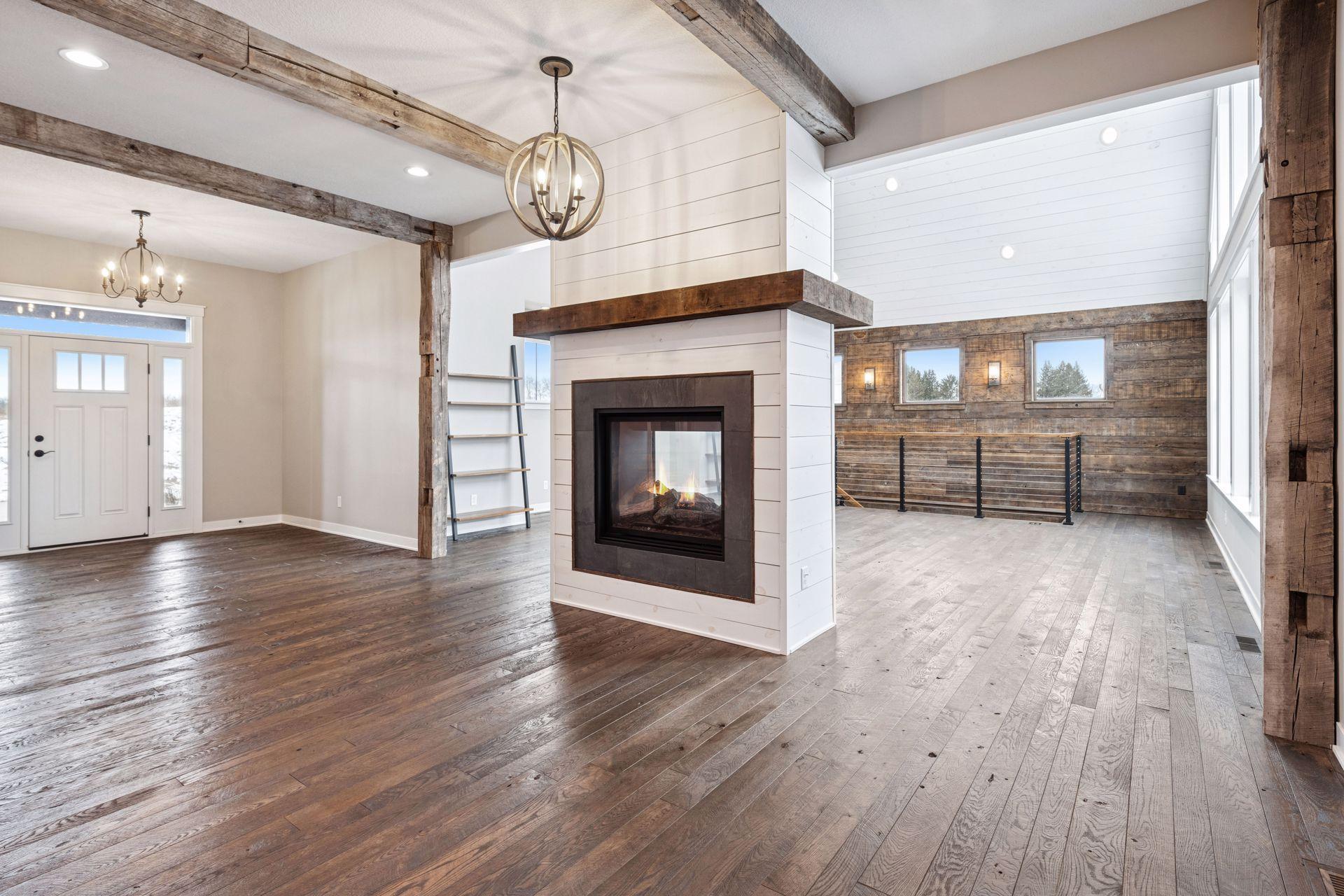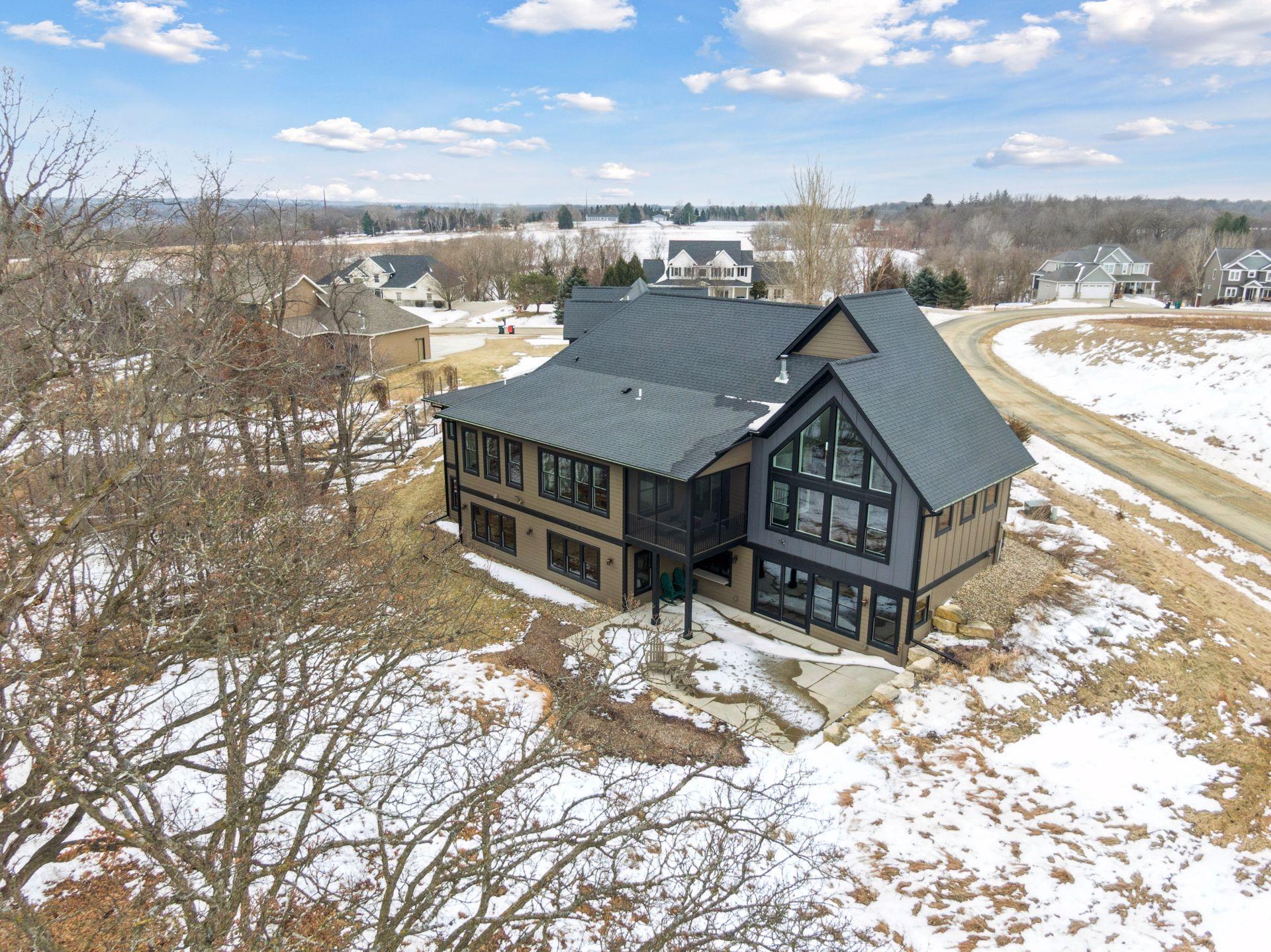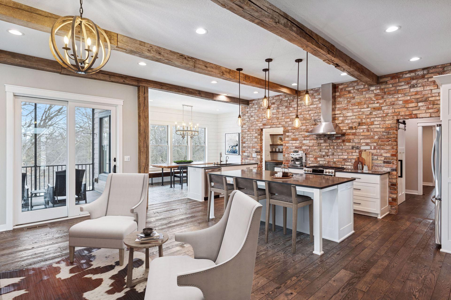 Stunning custom home set on 1.6 wooded acres, showcasing high-end and reclaimed finishes that create a refined rustic-modern aesthetic. The gorgeous open-concept kitchen features a center island, stainless steel appliances, custom wood beams, a reclaimed brick accent wall, and a double-sided fireplace. The adjoining dining area is thoughtfully designed with a hand-hewn oak bench, barn-wood wall paneling, and a walk-in pantry. The living room offers vaulted ceilings and breathtaking wooded views, while the three-season porch provides a serene, protected space to enjoy the outdoors. An expansive mudroom with built-in storage leads to a deluxe laundry room and an attached 3-car garage. The main-level primary suite includes a box-vault ceiling, a luxurious ensuite bath, and an exceptional walk-in closet. The upper level provides flexible space suitable for a bedroom, playroom, studio, office, or a variety of needs. The lower level is designed for entertaining, featuring a spacious family room, reading nook, full kitchen, cherry-wood bar top, and a garage door opening to an outdoor bar and patio. Additional lower-level amenities include heated flooring, bedrooms, an exercise room, a full bath, and a second laundry area. A remarkable greenhouse connects to a heated workshop with a garage door leading to a fully fenced garden. The breathtaking 1.6-acre setting, surrounded by mature trees and unmatched privacy, offers an exceptional retreat that balances luxury, craftsmanship, and nature at its finest.