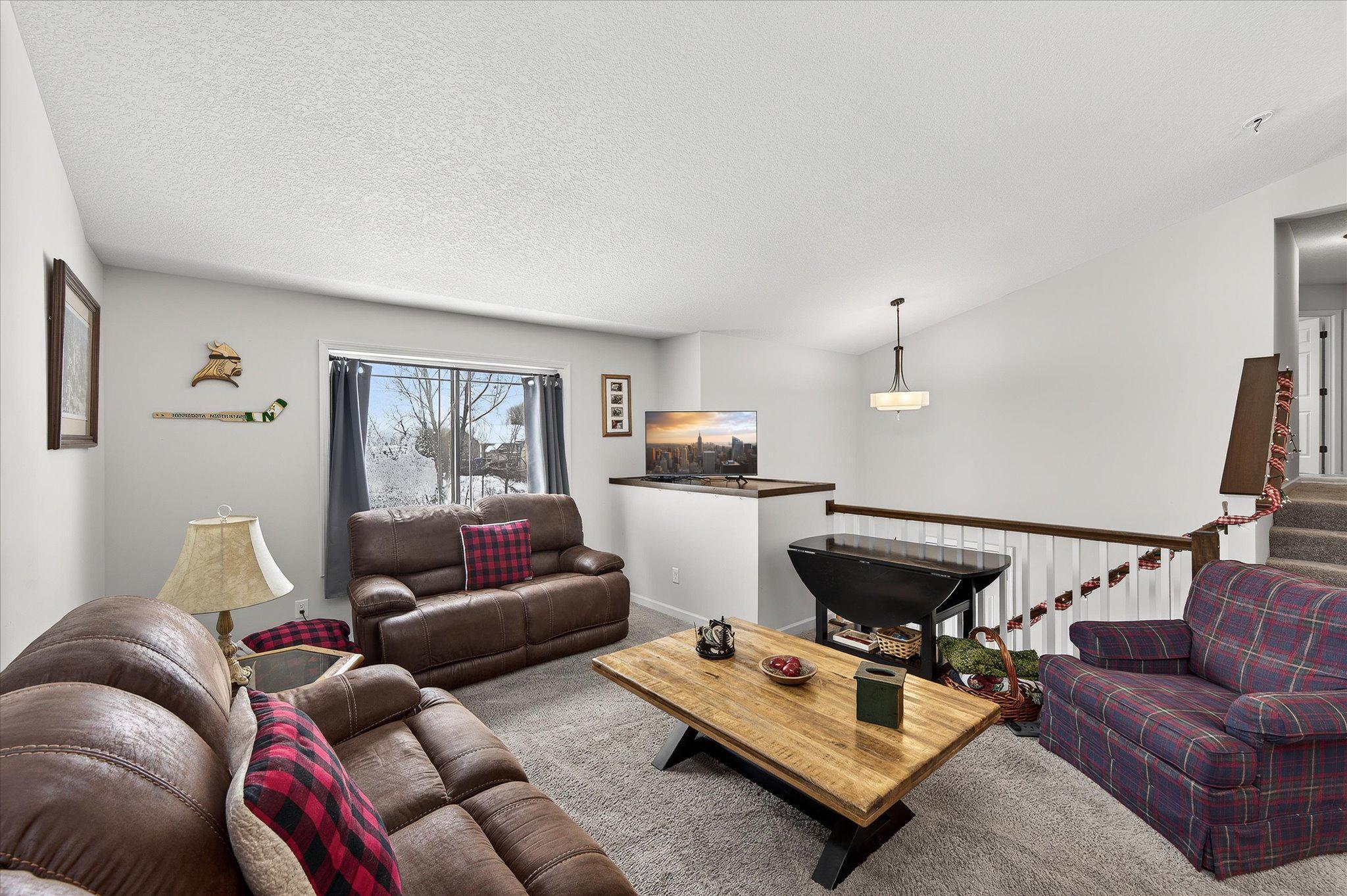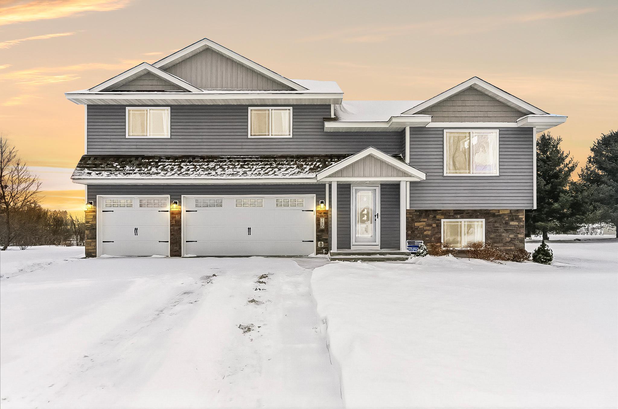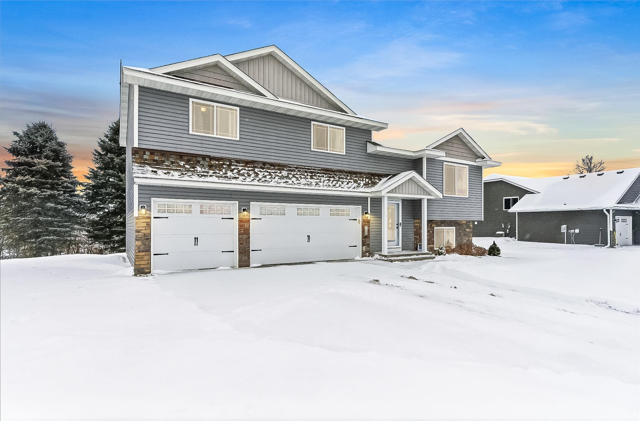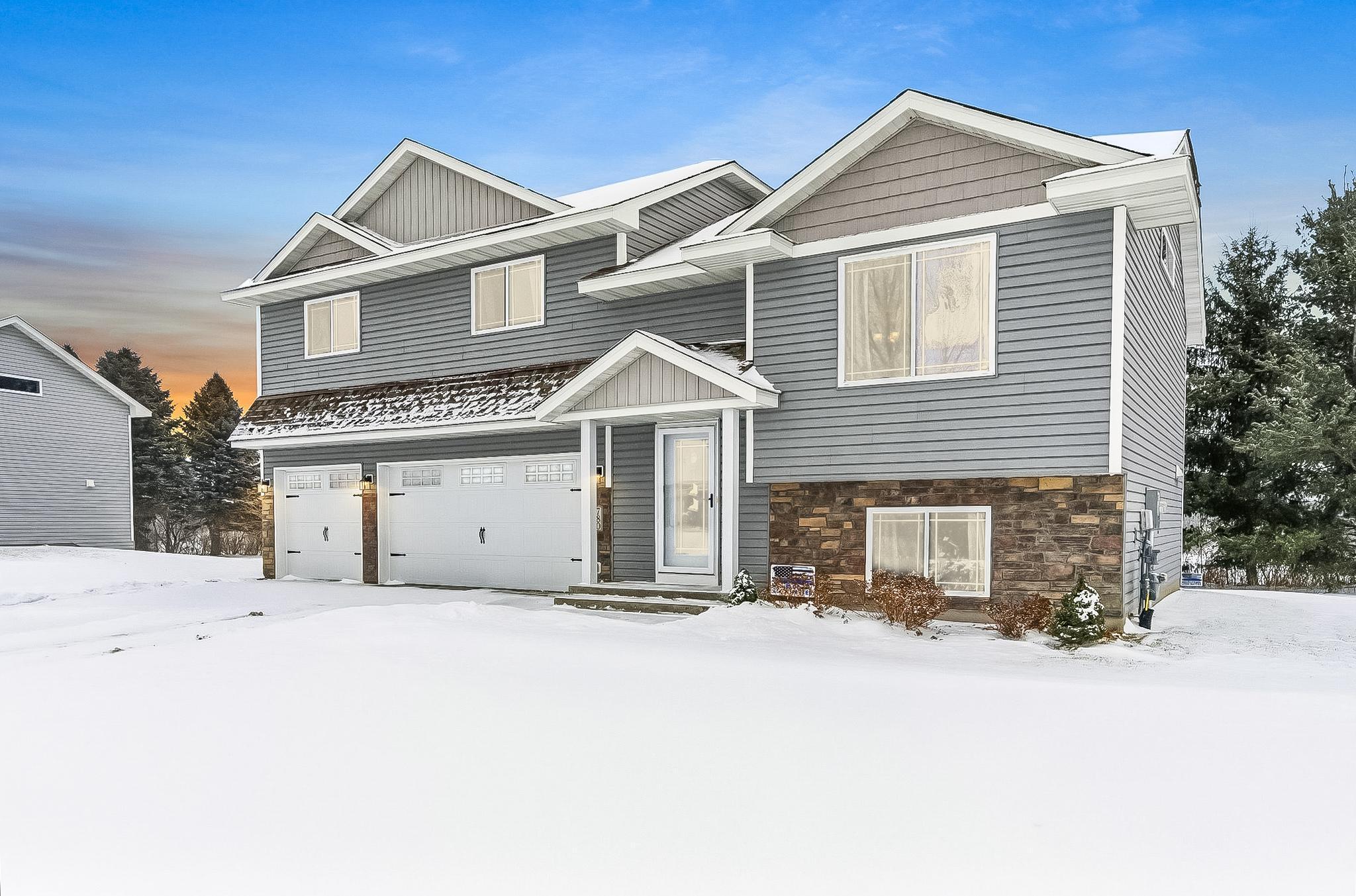 Welcome to this lovable and charming home offering a desirable layout that features three bedrooms on one level and two full bathrooms, including a full primary suite with its own bath and huge double sink vanity. Vaulted ceilings, an inviting eat-in kitchen with center island, ample cabinet space, and a 2025 stainless French-door refrigerator and range. Attractive wood-look vinyl plank flooring, patio door in dining that will lead to a future deck! The lower level offers room for future additional living space and a bath! The extra deep 3-car garage offers rough-in for a future unit heater and concrete driveway! All of this situated on a desirable lot landscaped with many perennials, mature pines in rear yard and Rush Creek beyond the trees. Excellent location within 1 mile of I-35 for easy commuting north or south. Truly a wonderful place to call home! We look forward to your visit! Quick closing possible!
