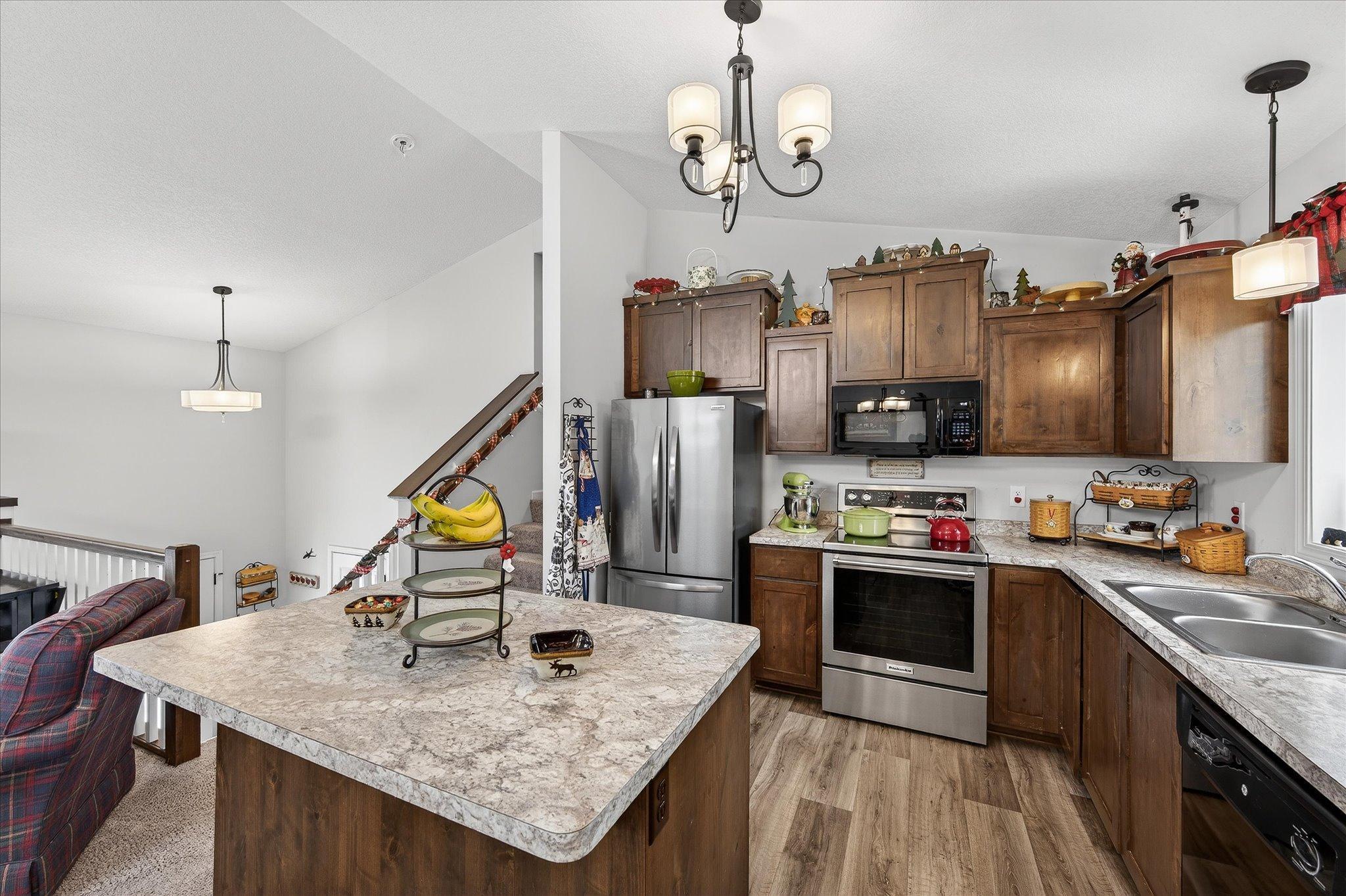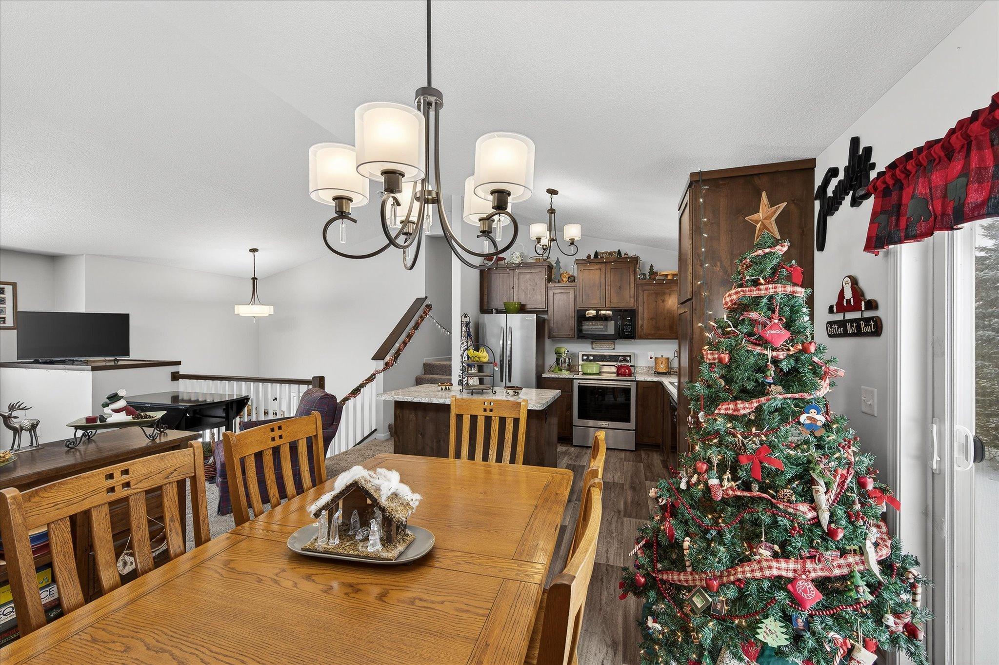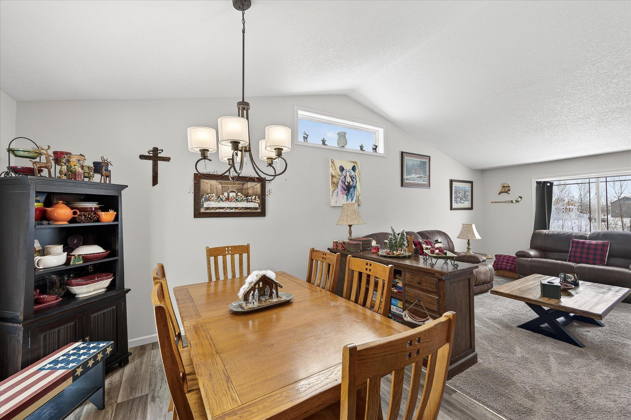 Welcome to this lovable and charming home offering a desirable layout that features three bedrooms on one level and two full bathrooms, including a full primary suite with its own bath and huge double sink vanity. Vaulted ceilings, an inviting eat-in kitchen with center island, ample cabinet space, and a 2025 stainless French-door refrigerator and range. Attractive wood-look vinyl plank flooring, patio door in dining that will lead to a future deck! The lower level offers room for future additional living space and a bath! The extra deep 3-car garage offers rough-in for a future unit heater and concrete driveway! All of this situated on a desirable lot landscaped with many perennials, mature pines in rear yard and Rush Creek beyond the trees. Excellent location within 1 mile of I-35 for easy commuting north or south. Truly a wonderful place to call home! We look forward to your visit! Quick closing possible!