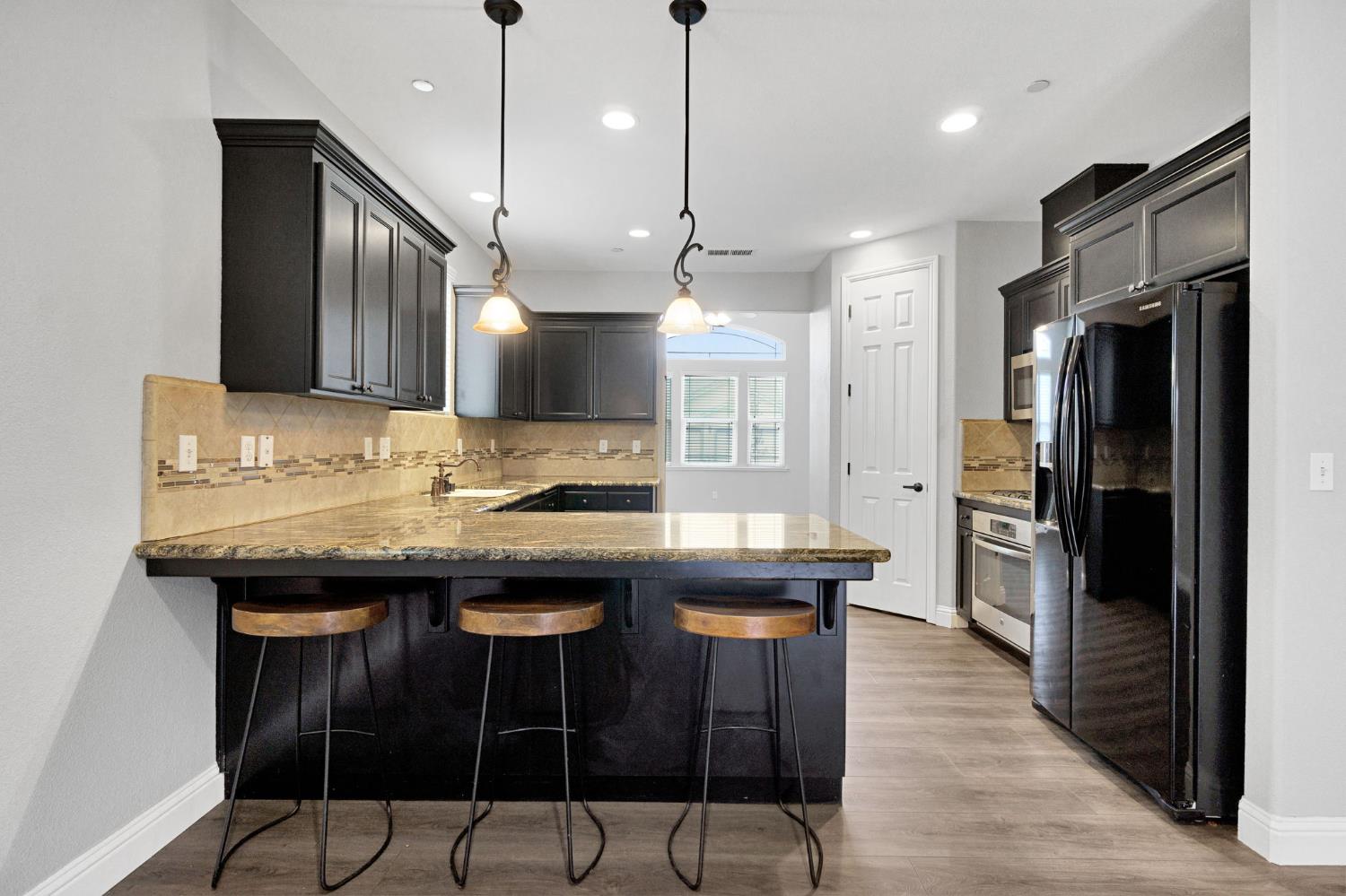 Beautifully built in 2014, this elegant 3-bedroom, 2-bath residence offers 2,096 sq. ft. of thoughtfully designed living space with a spacious 3-car garage and generous storage. The expansive family room creates an inviting atmosphere and flows seamlessly into a well-appointed kitchen featuring granite countertops, stainless steel appliances, a walk-in pantry, freshly painted cabinetry, and sleek laminate flooring. The private primary suite is a true retreat, featuring his-and-her walk-in closets and a spa-inspired bathroom with double-sink vanity, a luxurious soaking tub, and a beautifully appointed walk-in shower. The spacious guest bathroom offers dual sinks and generous storage. Thoughtful hallway storage cabinetry adds exceptional organization and functionality. The well-appointed laundry room includes a built-in sink and ample cabinetry for added convenience and storage. The home is enhanced with clean concrete surrounding the property, offering low-maintenance convenience and polished curb appeal. Additional highlights include a covered patio with ceiling fanperfect for year-round entertaining and relaxed outdoor living.