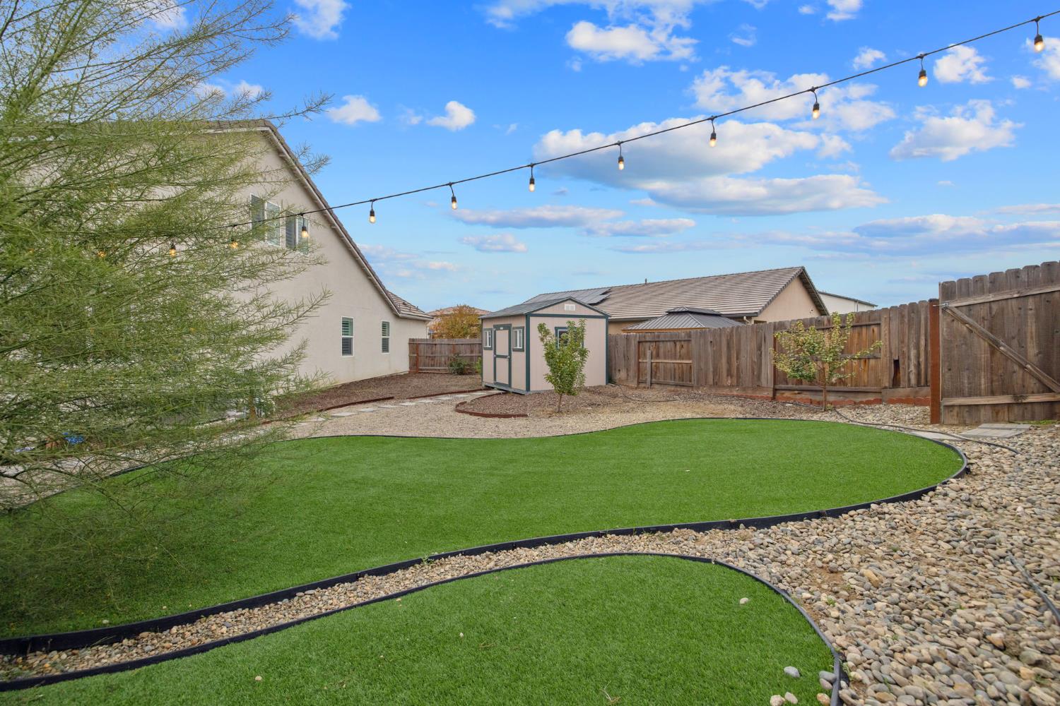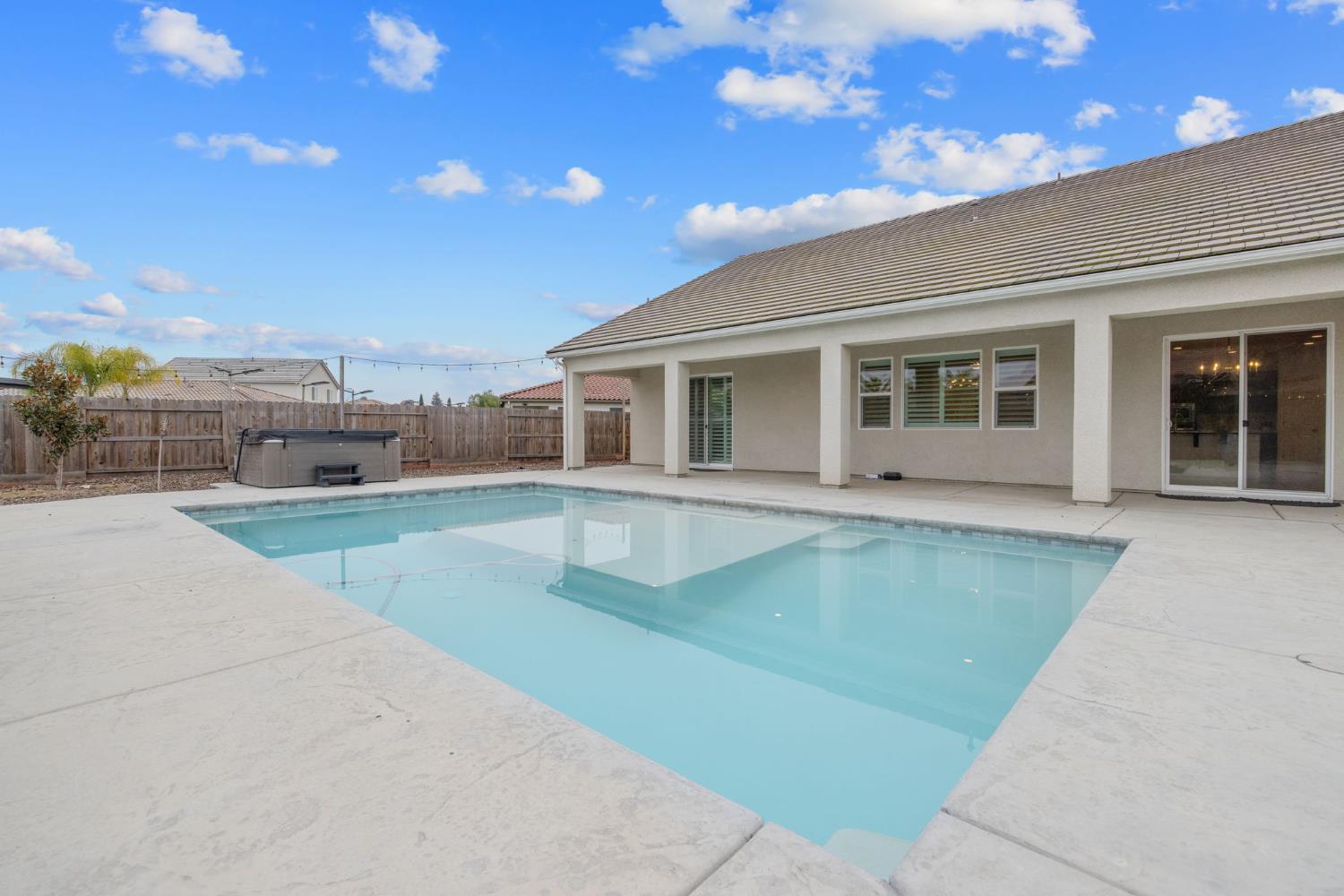 Step into modern luxury in the heart of Kingsburg! Tucked away in a private newer construction community, this stunning 4-bedroom, 3.5-bath home is less than three years old and loaded with premium upgrades that set it apart. From the moment you walk in, you'll notice thoughtful enhancements like extended countertops and custom cabinetry in the kitchen, a chic tile backsplash, upgraded hardware, and built-in storage everywhere you look, including hallway cabinets and a laundry room with its own countertop, sink, and plenty of additional cabinetry. Upstairs, the versatile loft features added counter space and a mini kitchenette, perfect for movie nights, kids' snacks, or your morning coffee routine. The open-concept kitchen seamlessly connects to the living area and breakfast nook, offering granite counters, a farmhouse sink, breakfast bar, built-in appliances, and a clever nook ideal for a dry bar or coffee station. Need more space? Enjoy a dedicated dining room, a spacious bonus room (or 5th bedroom) for your home office or playroom, and organized closets throughout, including a dreamy walk-in closet in the primary suite. Retreat to your luxurious primary suite with backyard access, dual sinks, a soaking tub, step-in shower, and custom closet system. Outside is an entertainer's paradise with owned solar for efficiency, plantation shutters for style, and a fully landscaped backyard with fresh turf, a sparkling custom pool, relaxing jacuzzi, gazebo, and a new shed. Extended concrete makes gatherings a breeze and keeps maintenance at a minimum. Why settle for builder-basic when you can have it all? Schedule your tour and experience the upgrades, space, and lifestyle you've been searching for.