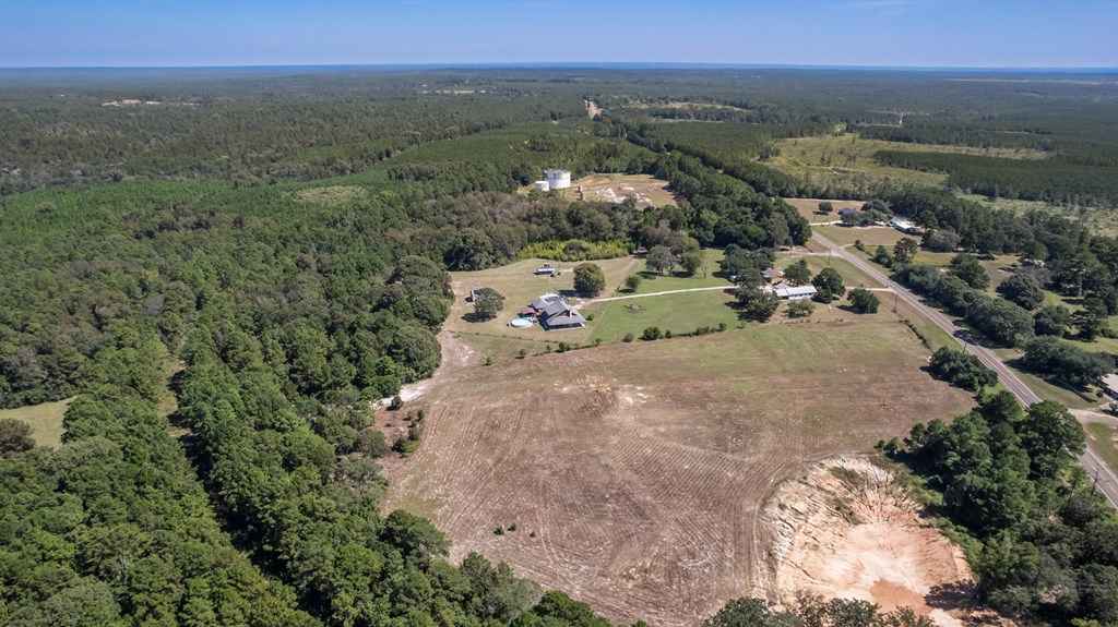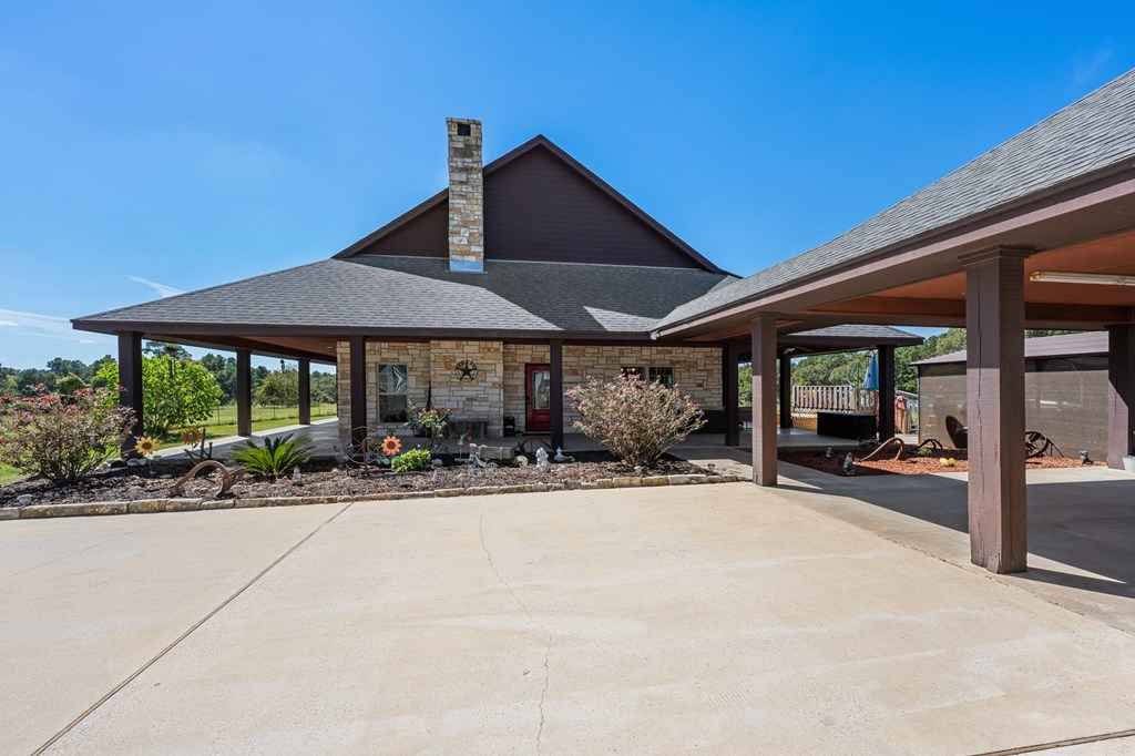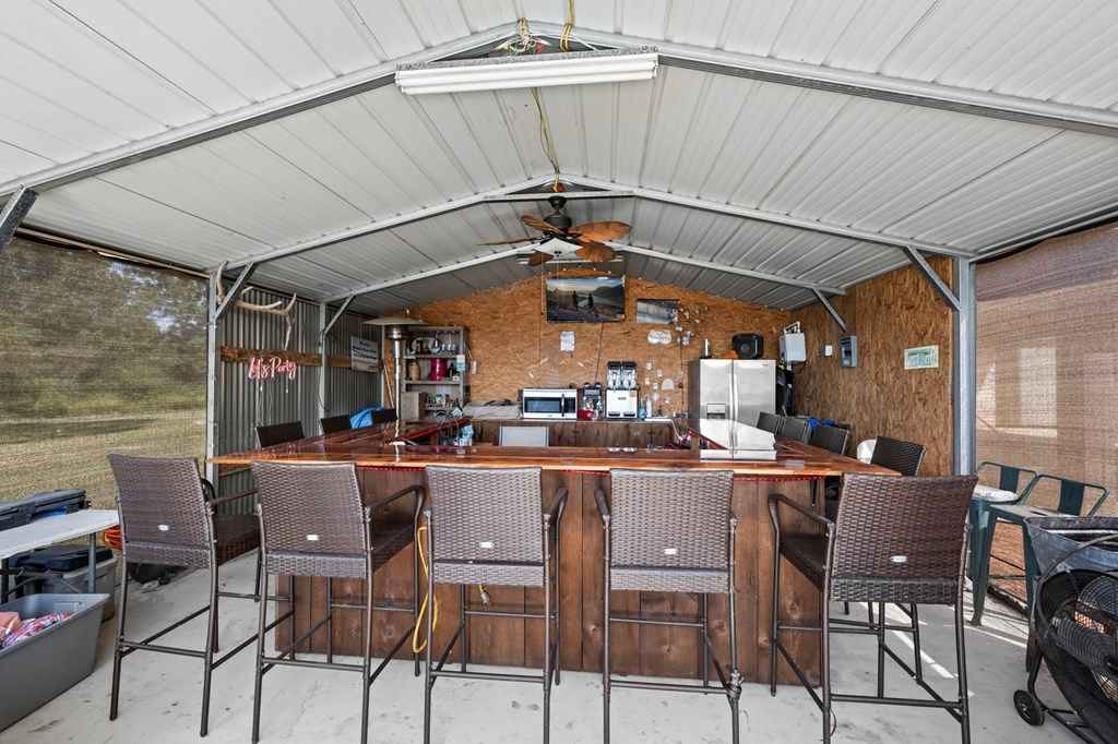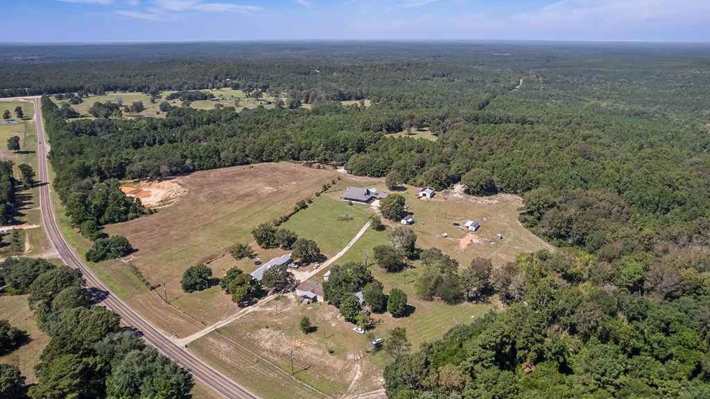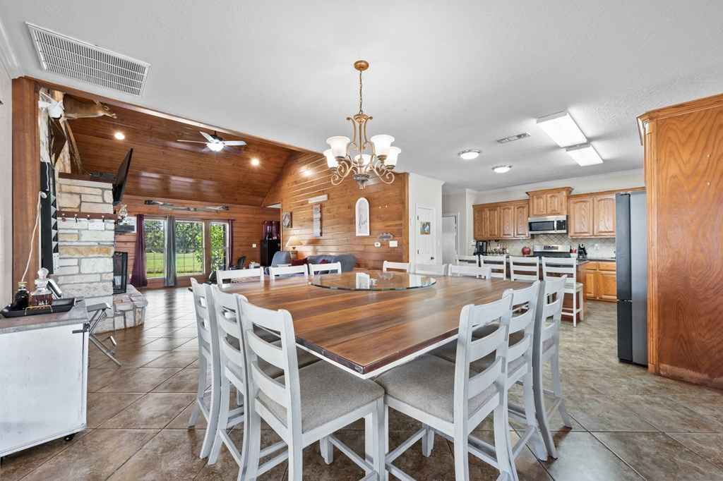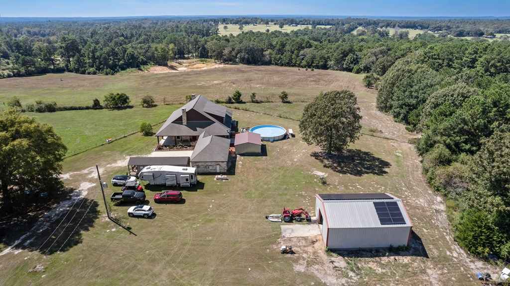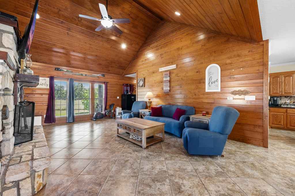 Set on 11 acres of open and wooded land, this 3-story ranch-style home features an expansive wrap-around porch, vaulted cathedral ceiling, and stone fireplace in the living area. The kitchen offers abundant cabinet storage, a walk-in pantry, and a large dining area with breakfast bar seating. The primary suite includes an ensuite bath and fireplace. Two laundry areasupstairs and downstairsfor convenience. Tile floors on the main level and new 25-year Stainmaster carpet upstairs. Outdoor bar, above-ground salt-water pool, and hot tub for relaxation. Large metal workshop with power, 3-space carport, and multiple electric/water hookups for RVs or mobile homes. Wooded back area with deer feeders provides space for hunting and livestock.