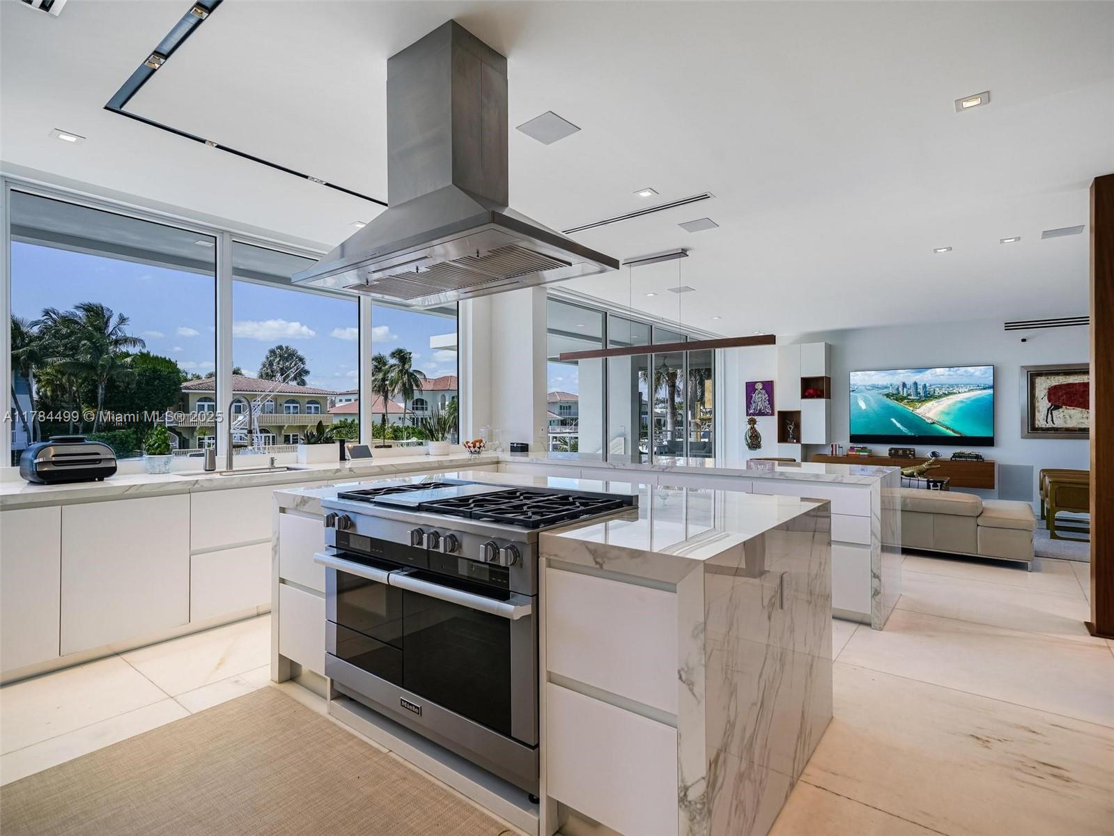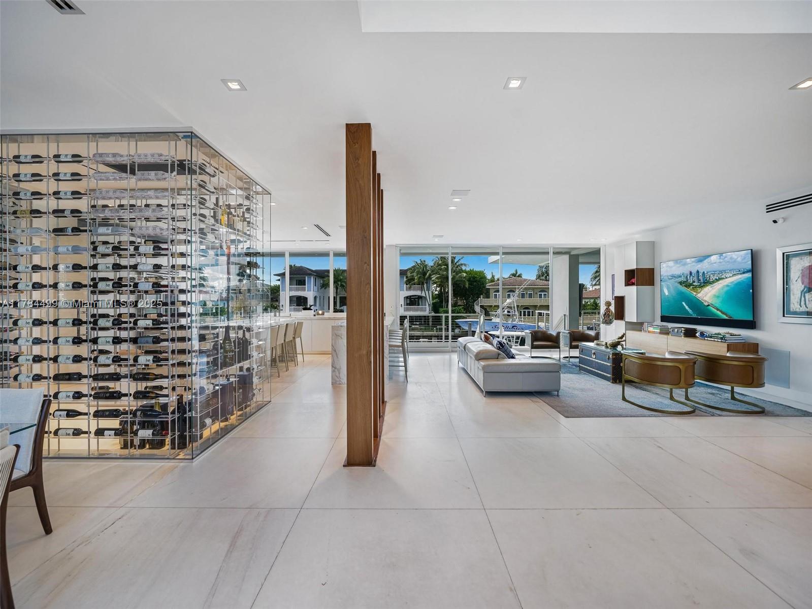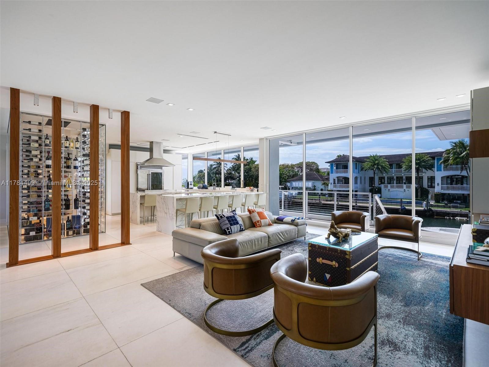 Waterfront luxury reimagined with 100 of frontage & a 15,000 lb boat lift for up to a 40 vessel. This 3-story, 9,911 SF smart home blends sleek Italian design with cutting-edge tech. The first floor features a private staff suite, gym, steam spa, staff kitchen, bar, full bath, and a 2,500-bottle wine cellar. The second level stuns with 48x48 marble floors, chefs kitchen with Miele, Subzero, Italian glass cabinetry, 2 dishwashers, 325-bottle wine cellar, plus office, laundry, and ensuite bedrooms. Upstairs, the primary suite is joined by two additional ensuite bedrooms and a second living room. Fully automated smart home with Control4, 19 security cameras, Trane A/C, ESW impact windows, electric blinds, custom closets, dual kitchens, dual laundries, and A/C 2-car garage. Open Bay Views!