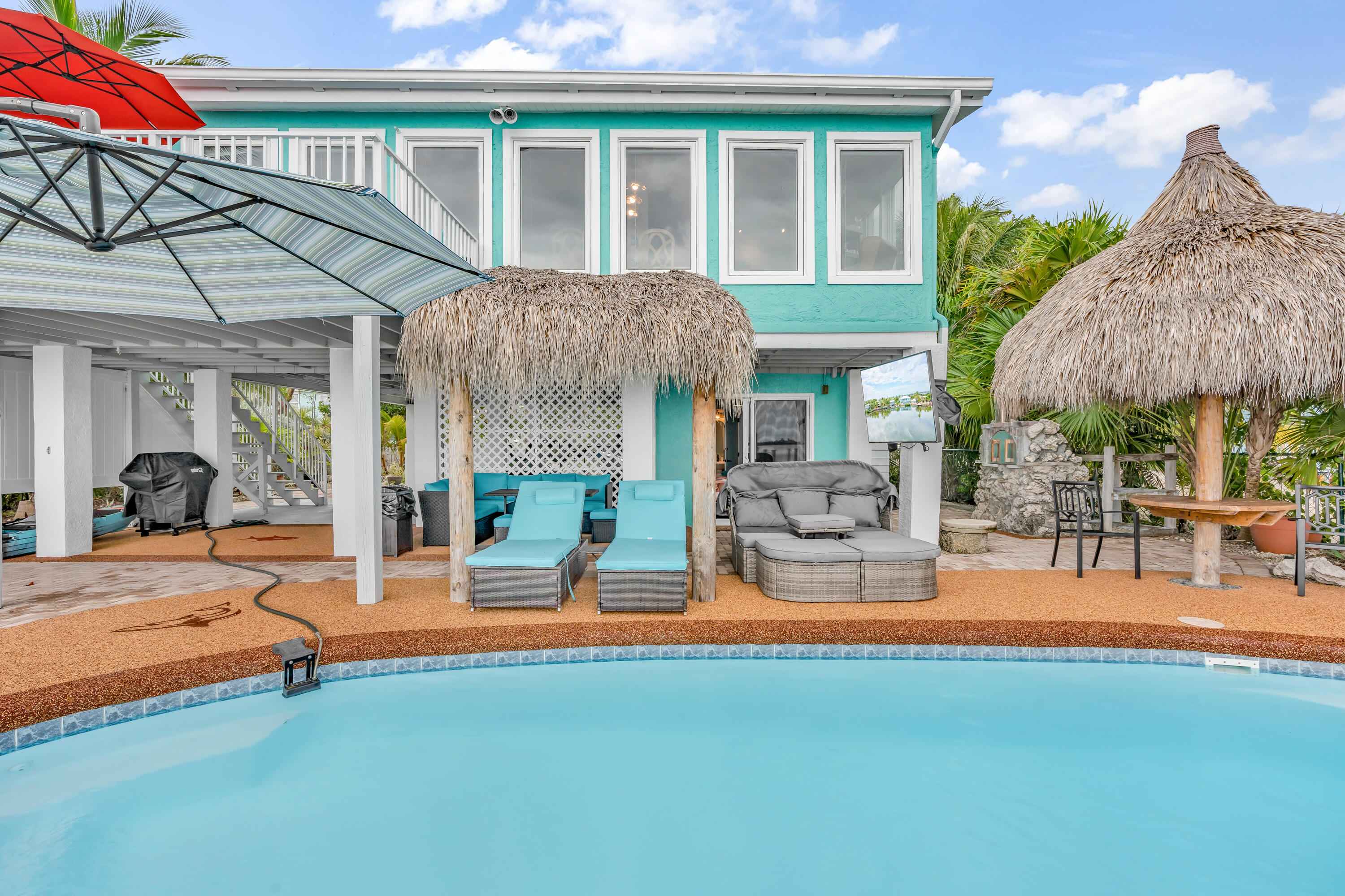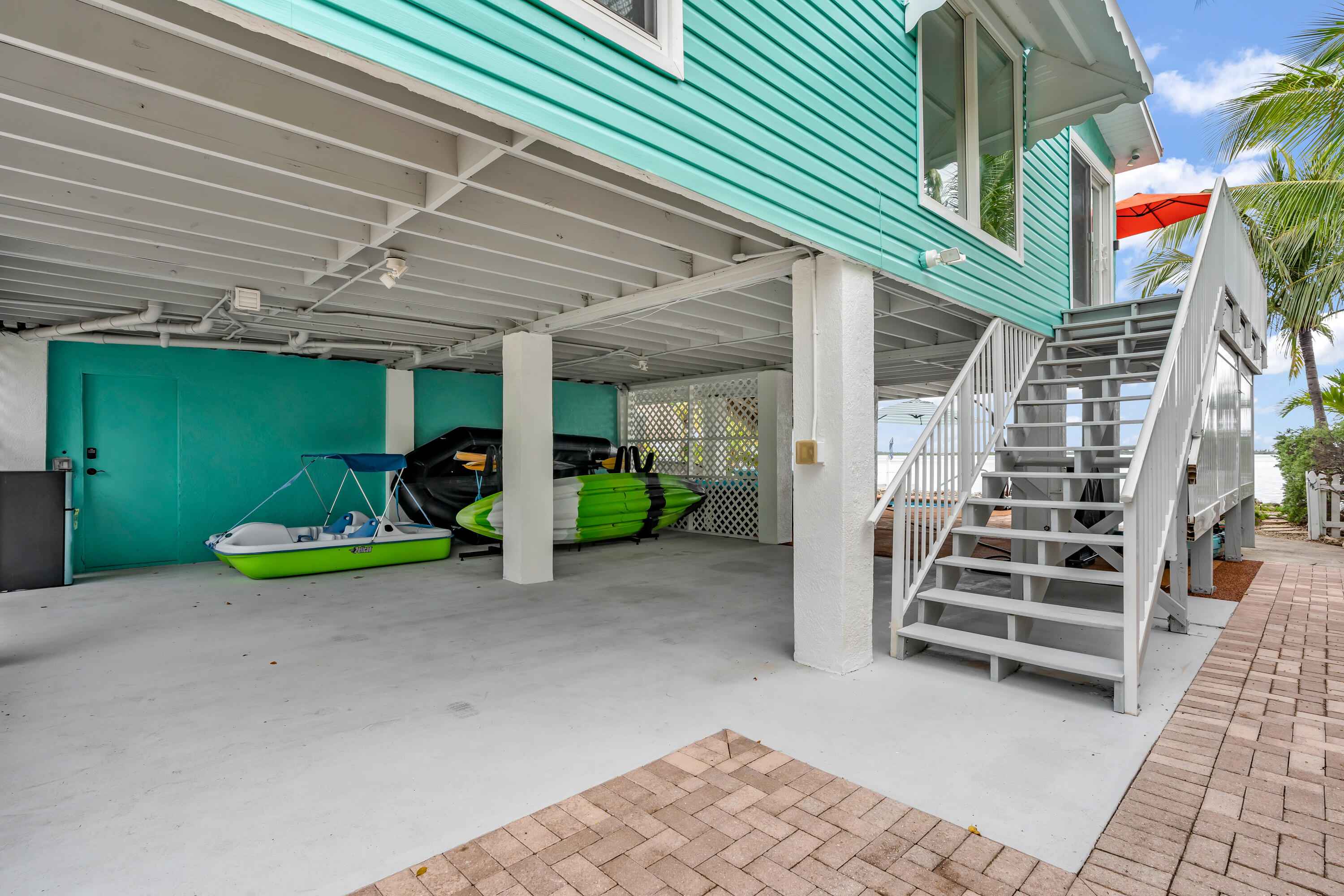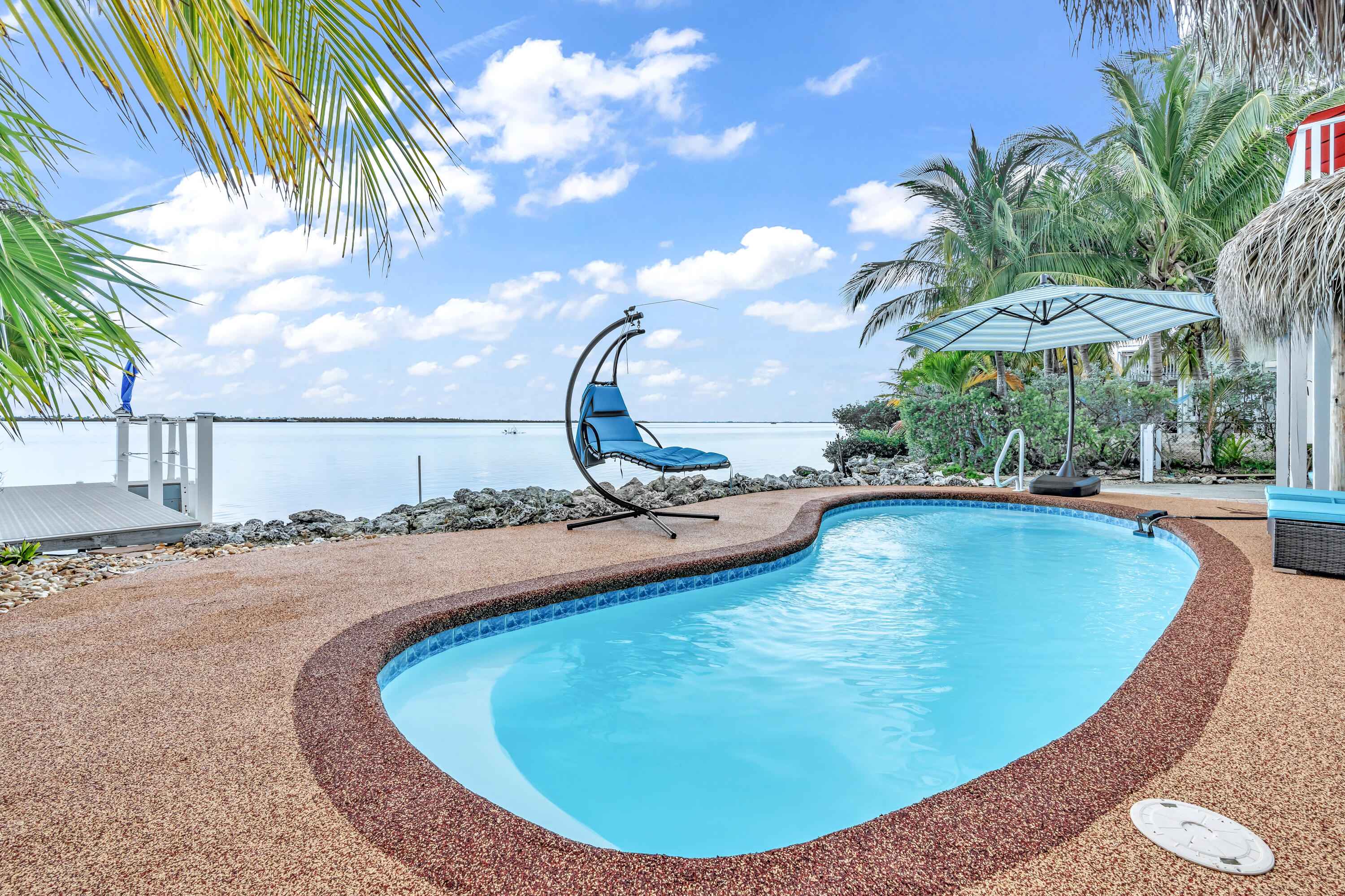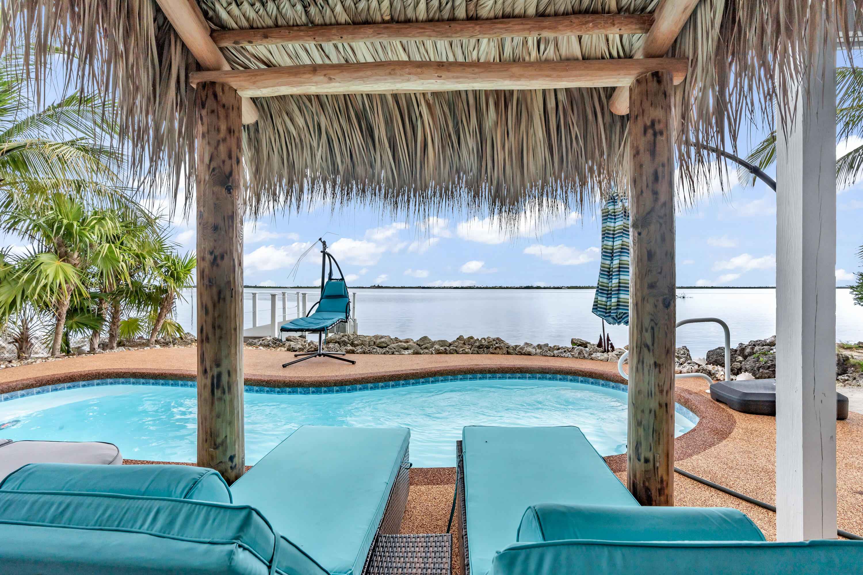 Experience waterfront living in the highly desirable Breezeswept Beach Estates. This beautifully updated 2 bedroom, 2 bathroom home captures sweeping open water views and unforgettable sunrises right from your living room.Inside, the home features an airy open layout highlighted by vaulted wood beam ceilings and expansive impact windows that frame the water from nearly every angle. Both bedrooms offer private en suite baths, creating a comfortable and functional design. Automatic blinds, updated flooring throughout, and fresh interior paint complete the recent improvements.The kitchen has been thoughtfully renovated with high end appliances and a striking copper farmhouse sink, blending style and practicality for everyday living or entertaining.Outdoor spaces are designed to fully embrace the Keys lifestyle. Cool off in the waterfront pool with cork decking for temperature control, along with new pool equipment and a heater. Gather around the custom coral grill or fire up the outdoor pizza oven for casual evenings with friends and family. Relax beneath the tiki hut, unwind on the covered patio overlooking open water, or rinse off in the fully enclosed outdoor shower after a day on the water.Launch kayaks and paddleboards directly from your private beach launch and enjoy shallow draft boating. A swim dock provides the perfect place to fish or take in the sunrise. A large dredge completed decades ago enhances fishing right off your dock.Downstairs, an enclosed storage area offers flexible space for gear, hobbies, or additional storage, seamlessly connected to the outdoor living area. There is also an additional storage closet off the covered parking. The driveway accommodates up to a 42 foot RV and includes a 50 amp hookup for guests.Additional features include a metal roof, impact windows, resurfaced piles, and a new tankless water heater.Move in ready. This is the only property on the coastline with no mangroves obstructing water access.
