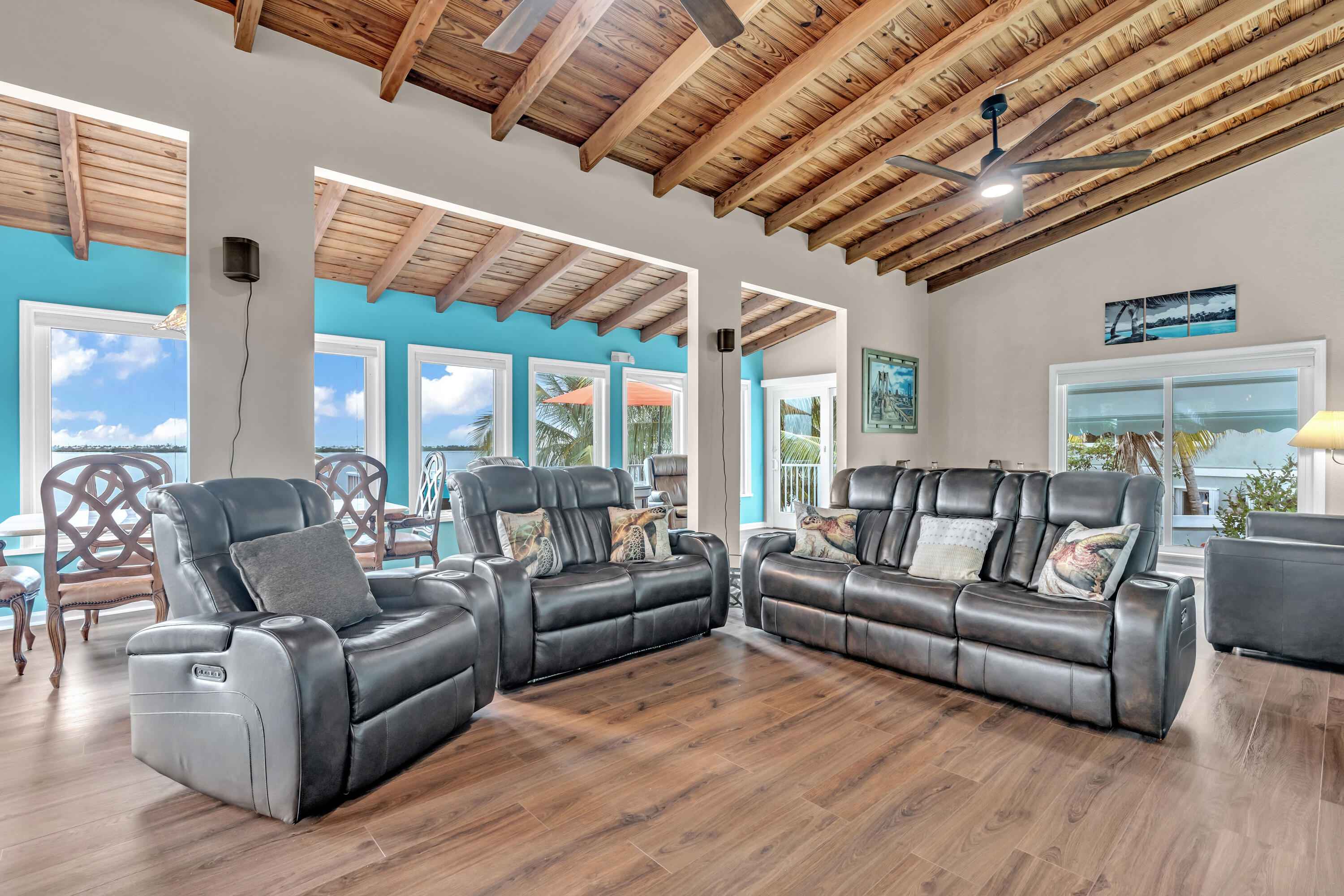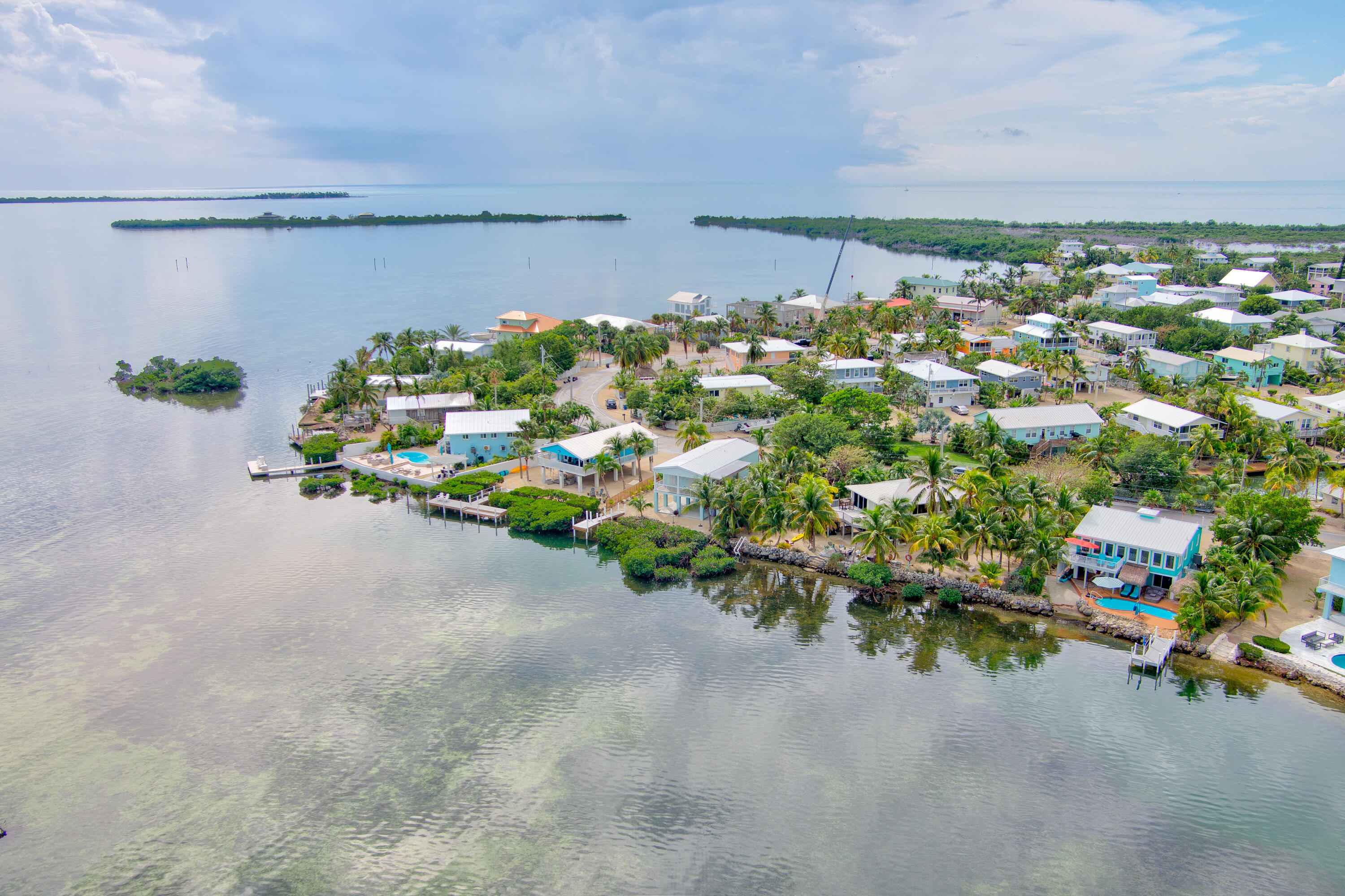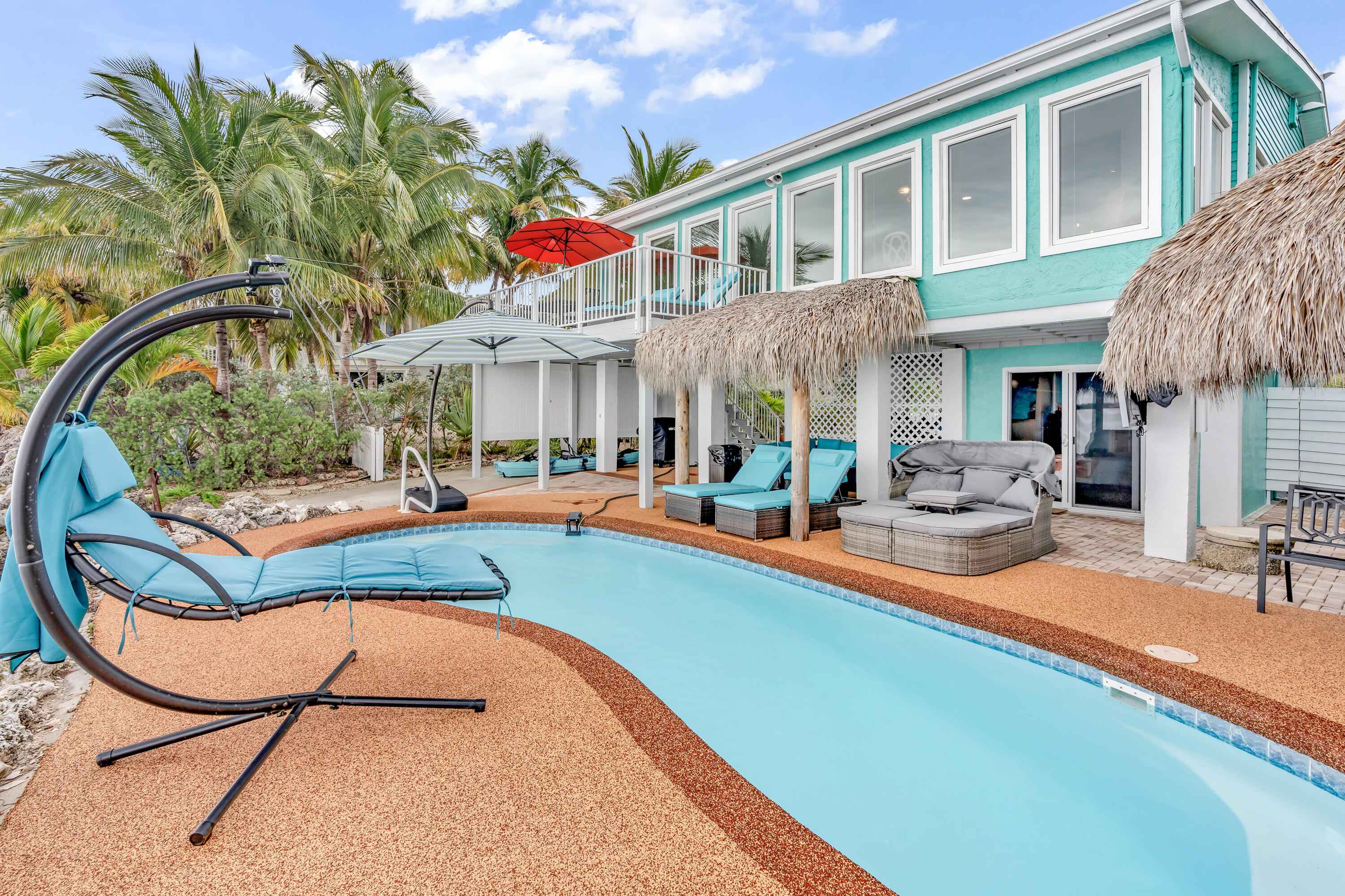 Experience waterfront living in the highly desirable Breezeswept Beach Estates. This beautifully updated 2 bedroom, 2 bathroom home captures sweeping open water views and unforgettable sunrises right from your living room.Inside, the home features an airy open layout highlighted by vaulted wood beam ceilings and expansive impact windows that frame the water from nearly every angle. Both bedrooms offer private en suite baths, creating a comfortable and functional design. Automatic blinds, updated flooring throughout, and fresh interior paint complete the recent improvements.The kitchen has been thoughtfully renovated with high end appliances and a striking copper farmhouse sink, blending style and practicality for everyday living or entertaining.Outdoor spaces are designed to fully embrace the Keys lifestyle. Cool off in the waterfront pool with cork decking for temperature control, along with new pool equipment and a heater. Gather around the custom coral grill or fire up the outdoor pizza oven for casual evenings with friends and family. Relax beneath the tiki hut, unwind on the covered patio overlooking open water, or rinse off in the fully enclosed outdoor shower after a day on the water.Launch kayaks and paddleboards directly from your private beach launch and enjoy shallow draft boating. A swim dock provides the perfect place to fish or take in the sunrise. A large dredge completed decades ago enhances fishing right off your dock.Downstairs, an enclosed storage area offers flexible space for gear, hobbies, or additional storage, seamlessly connected to the outdoor living area. There is also an additional storage closet off the covered parking. The driveway accommodates up to a 42 foot RV and includes a 50 amp hookup for guests.Additional features include a metal roof, impact windows, resurfaced piles, and a new tankless water heater.Move in ready. This is the only property on the coastline with no mangroves obstructing water access.