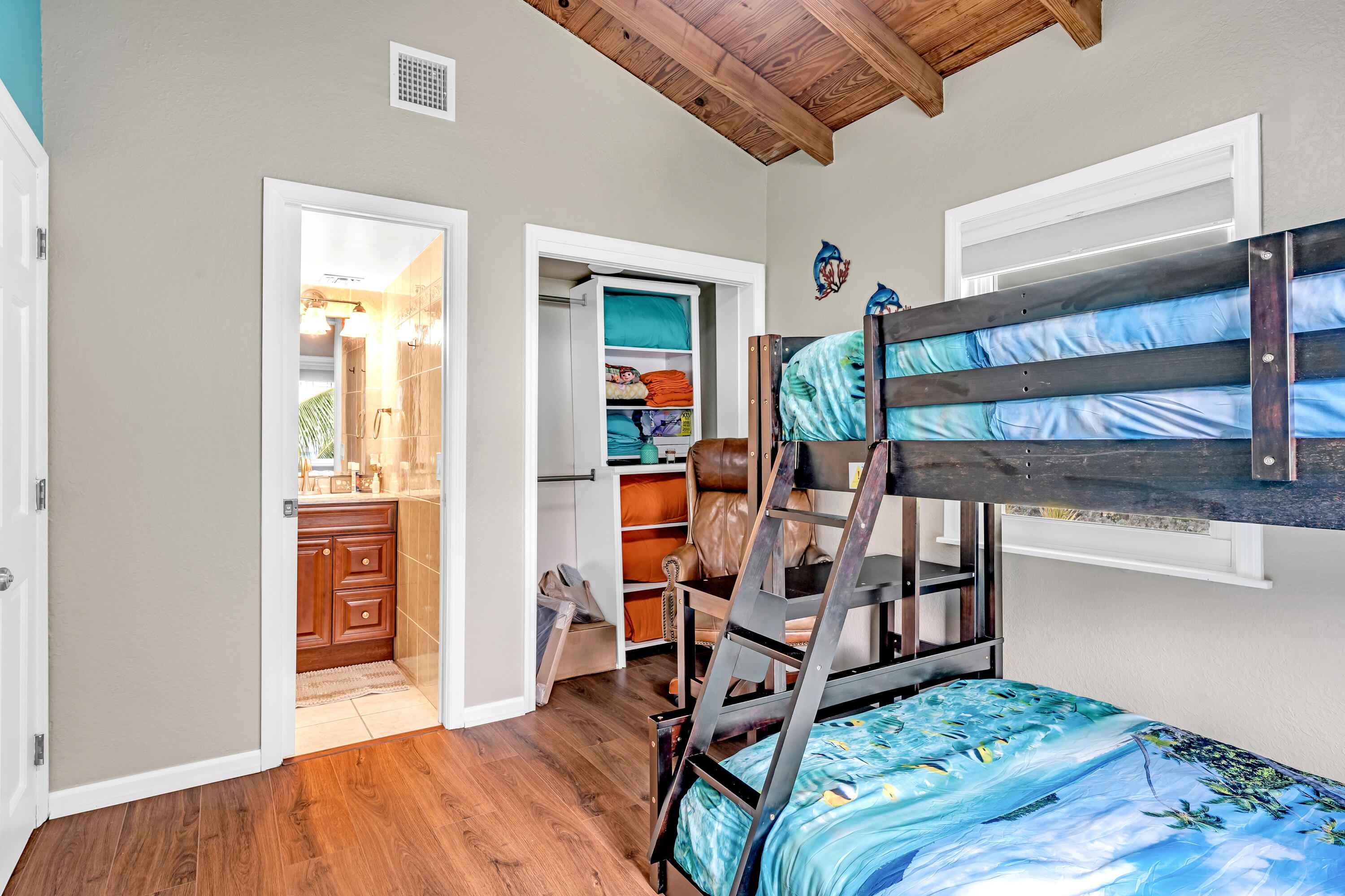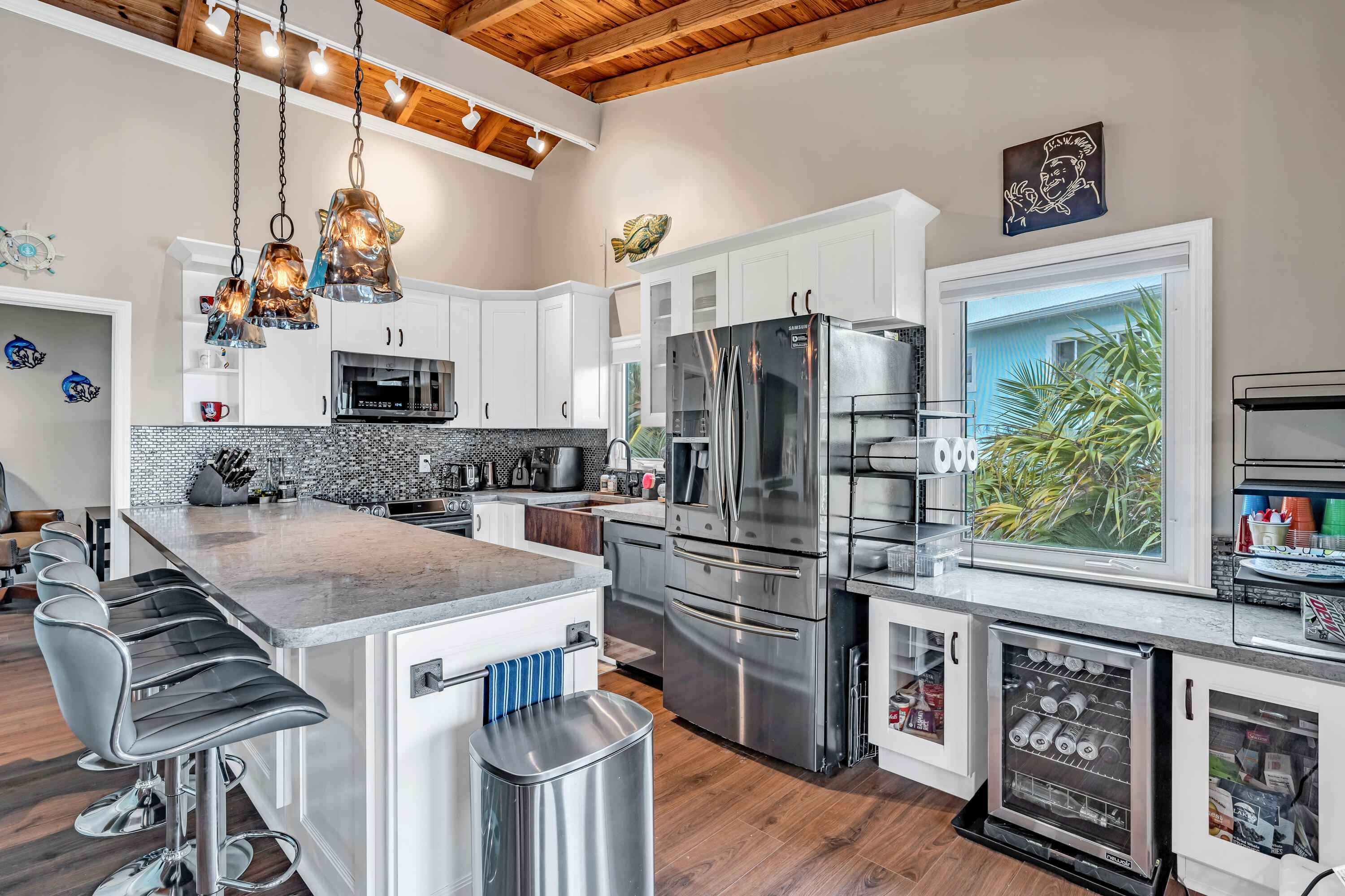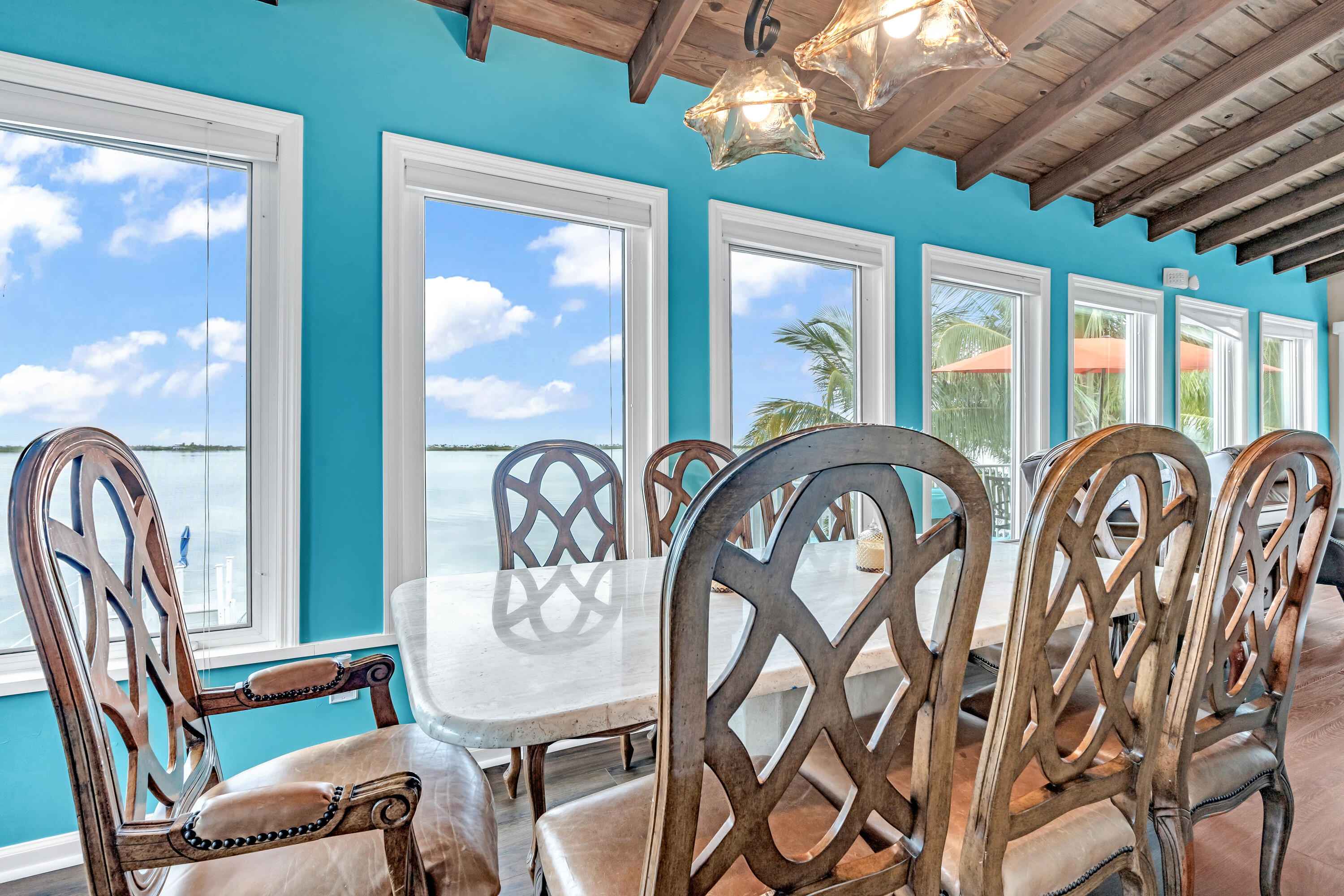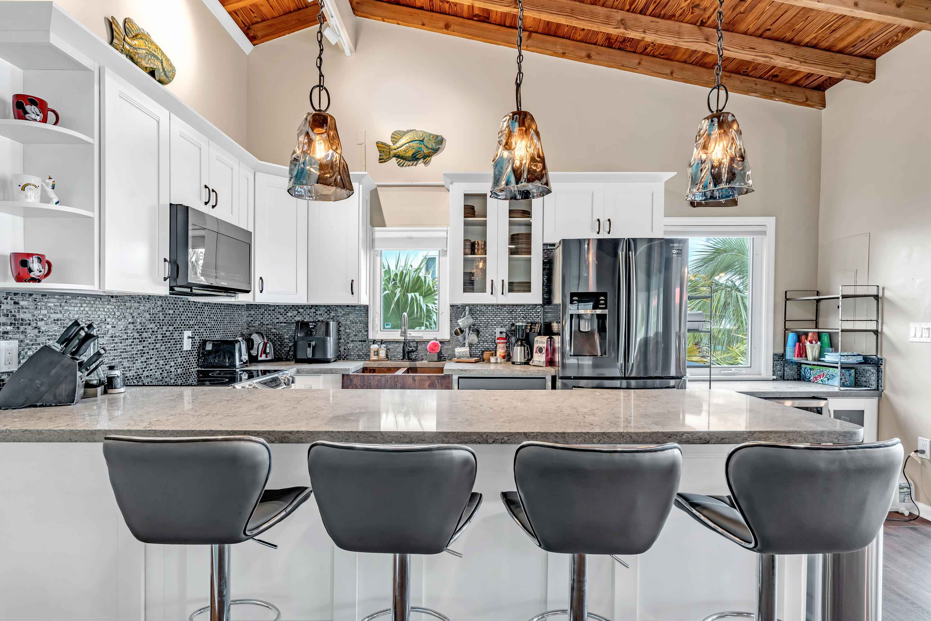 Experience waterfront living in the highly desirable Breezeswept Beach Estates. This beautifully updated 2 bedroom, 2 bathroom home captures sweeping open water views and unforgettable sunrises right from your living room.Inside, the home features an airy open layout highlighted by vaulted wood beam ceilings and expansive impact windows that frame the water from nearly every angle. Both bedrooms offer private en suite baths, creating a comfortable and functional design. Automatic blinds, updated flooring throughout, and fresh interior paint complete the recent improvements.The kitchen has been thoughtfully renovated with high end appliances and a striking copper farmhouse sink, blending style and practicality for everyday living or entertaining.Outdoor spaces are designed to fully embrace the Keys lifestyle. Cool off in the waterfront pool with cork decking for temperature control, along with new pool equipment and a heater. Gather around the custom coral grill or fire up the outdoor pizza oven for casual evenings with friends and family. Relax beneath the tiki hut, unwind on the covered patio overlooking open water, or rinse off in the fully enclosed outdoor shower after a day on the water.Launch kayaks and paddleboards directly from your private beach launch and enjoy shallow draft boating. A swim dock provides the perfect place to fish or take in the sunrise. A large dredge completed decades ago enhances fishing right off your dock.Downstairs, an enclosed storage area offers flexible space for gear, hobbies, or additional storage, seamlessly connected to the outdoor living area. There is also an additional storage closet off the covered parking. The driveway accommodates up to a 42 foot RV and includes a 50 amp hookup for guests.Additional features include a metal roof, impact windows, resurfaced piles, and a new tankless water heater.Move in ready. This is the only property on the coastline with no mangroves obstructing water access.
