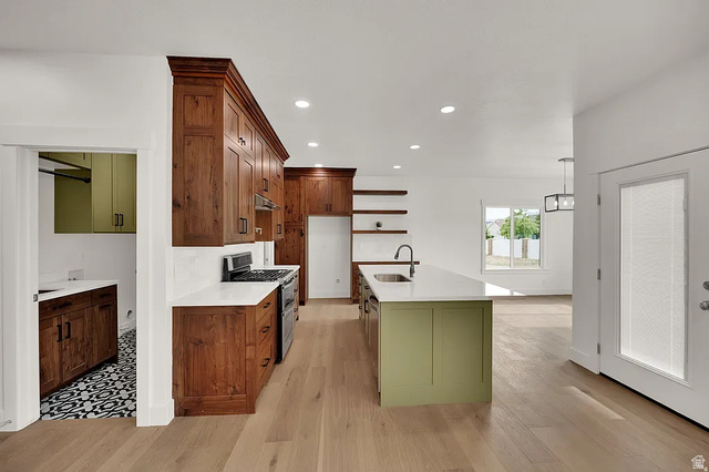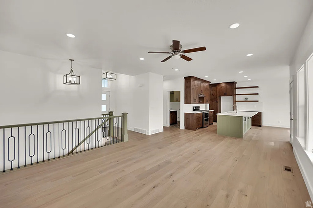 Beautiful brand new custom-built 6 bedroom, 3 bathroom home located at 8356 S Four Elm Circle, West Jordan. This home features hardwood floors, high-end walnut soft-close cabinetry, oversized pantry, designer backsplash, pot filler, and a gas range with double ovens. The primary suite includes a separate tub and tiled shower. Enjoy a spacious laundry room with sink and gas/electric hookups, mudroom with built-ins, high-efficiency furnace, and a large covered back patio. Fully landscaped front yard.