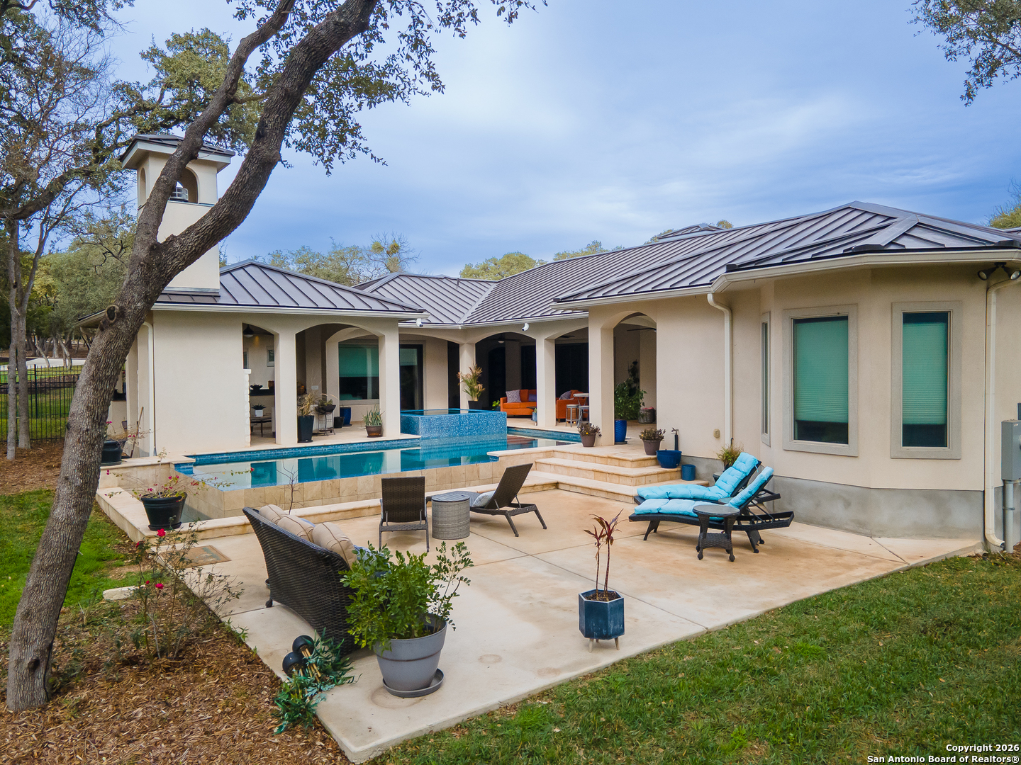 2 Homes in One! Gorgeous, Modern Mediterranean Style Hacienda with a full complement but separate 1 bedroom apartment suite for guest or mother-n-law. Custom pool, hot tub, and dual garages! Large outside covered patio with a full complement of outside kitchen features, including a grill, fridge, sink, and more, plus a gas fireplace and wall-mounted TV. Private, Gated, wooded community. The home sits on the corner lot, immediately entering the private access gates. Ultra Luxury with a welcoming Hacienda flair, perfect for entertaining, family, or just getting away at home. (QR link to video at the end of the pictures). This home was designed and built as a FOREVER HOME loaded with many high-end luxury addons, like the extra-wide and accented finished archways. The huge hidden pantry-laundry room is simply amazing and big! The glass wall that opens up completely, bringing the outside in! The Hand-troweled mineral composite artwork incorporating gold elements that reveal their brilliance as one walks by. Custom cabinets in the master bedroom and bath, plus custom floors and walls. The custom bathrooms, custom cabinets, and so much more! You have to come and experience this home for yourself it is one of a kind! Welcome Home!!! Minutes to San Antonio Airport, Randolph Air Force Base, The Forum Shopping and entertaining, Rolling Oaks Mall plus many cities just minutes away,Cibolo, Schertz, Selma, New Braunfels, Garden Ridge, San Antonio, San Marcos, New Braunfels, Austin, Spring Branch, Converse, Live Oak also IH-35, Hwy 281, Loop 46, Loop 1604, Loop 410 and much more! HURRY!