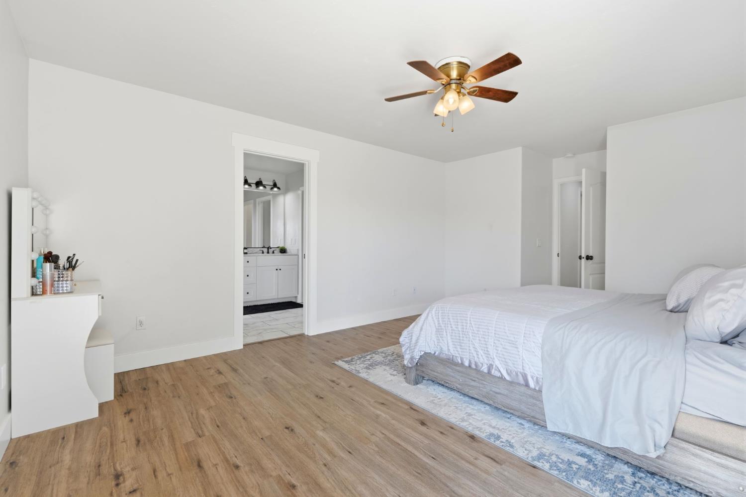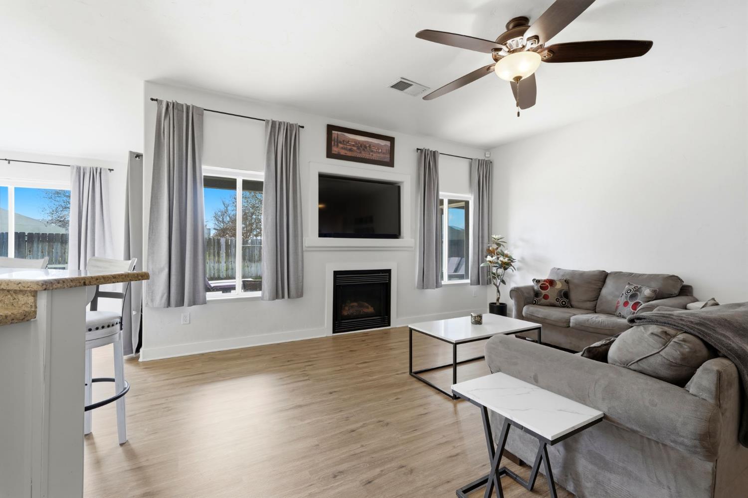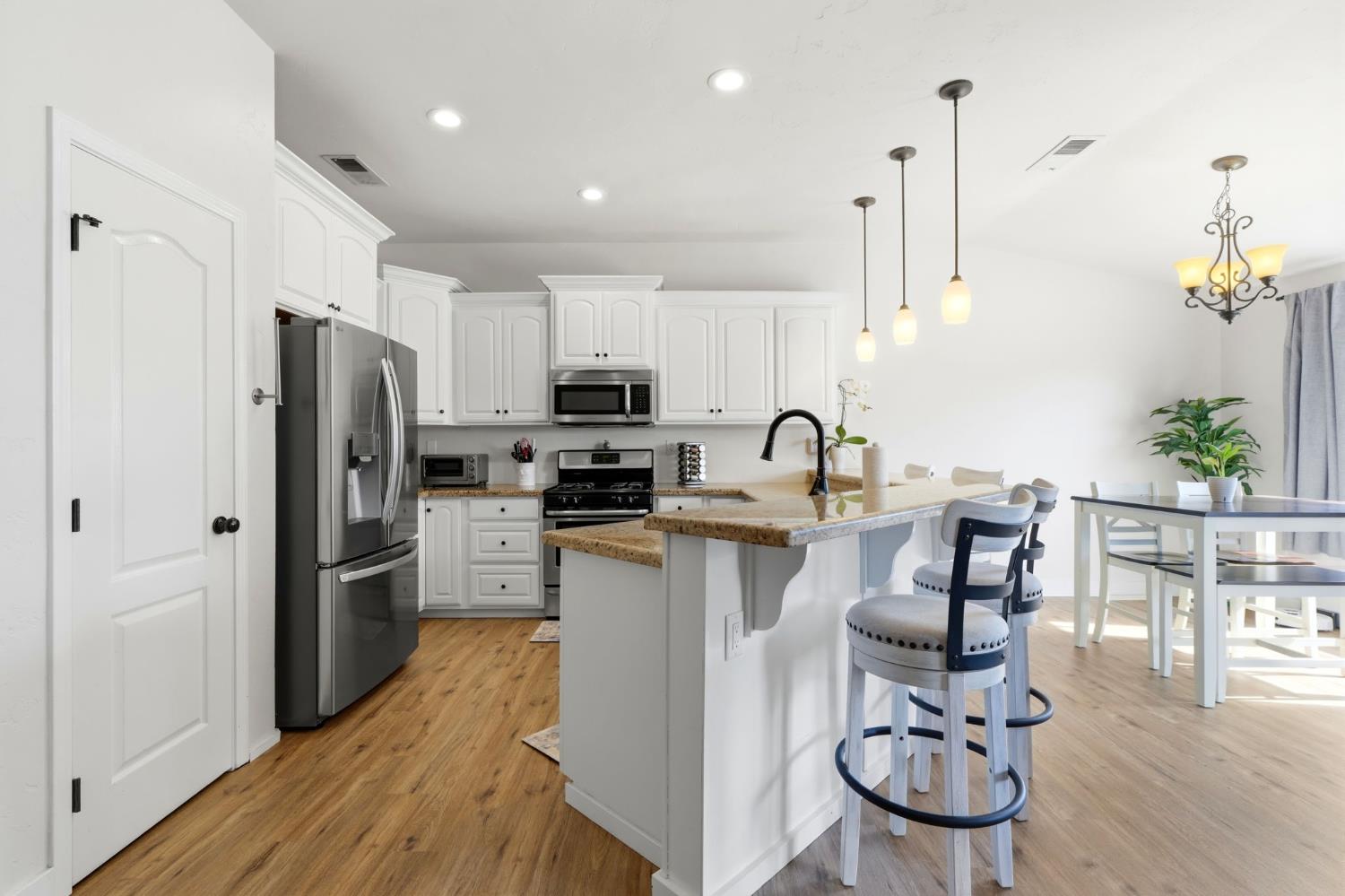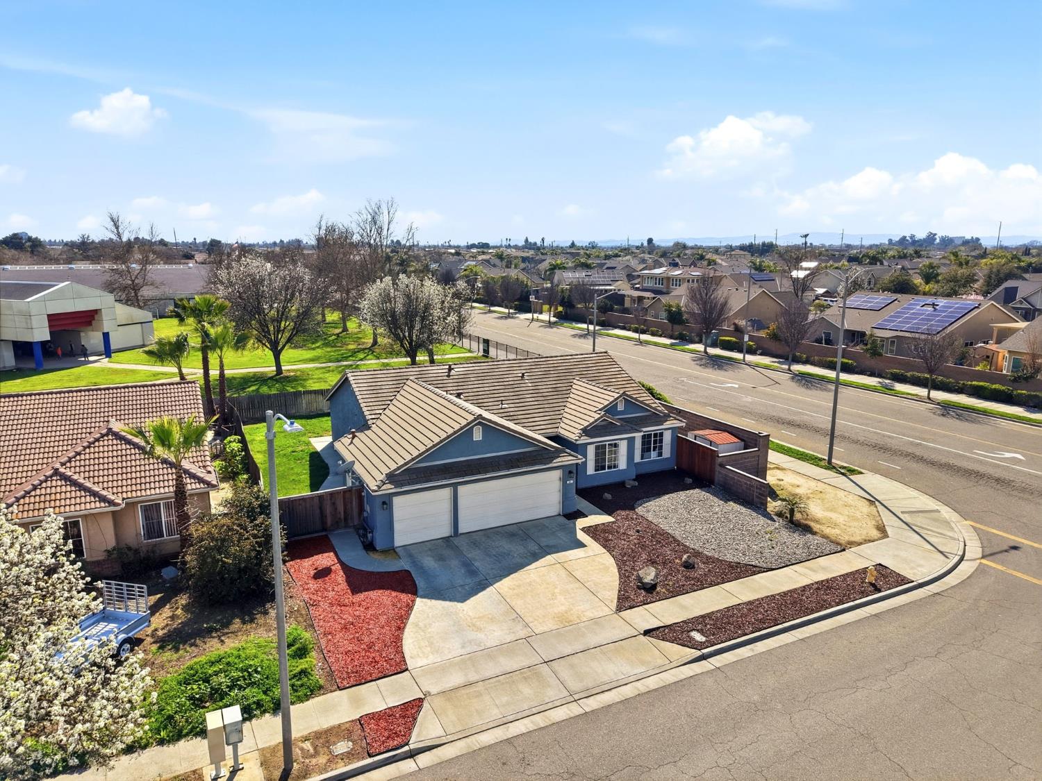 Positioned on a prime corner lot, with seller incentives available, this rare 5-bedroom, 2 bath home offers space, privacy, and standout curb appeal in NW Lemoore. Inside, you'll find new laminate flooring throughout and a light, open-concept layout with vaulted ceilings. The spacious kitchen features granite counters, ample cabinetry, and a breakfast bar that opens seamlessly to the living area, complete with fireplace and backyard views. The primary suite offers direct patio access and a beautifully updated en-suite bath with dual vanities, soaking tub, and walk-in shower. Step outside to your private backyard retreat with a sparkling pool, perfect for summer gatherings and relaxing evenings. Solar has covered the sellers' usage even with the pool and a Tesla charger in the garage, offering meaningful energy savings. Additional highlights include a 3-car garage, whole-house water filtration system, security system, upgraded pool equipment, and smart sprinkler controls. Conveniently located near schools, parks, Lemoore NAS, and quick access to Hwy 198 & 41, this is the space, functionality, and efficiency buyers have been waiting for. Schedule your showing today!