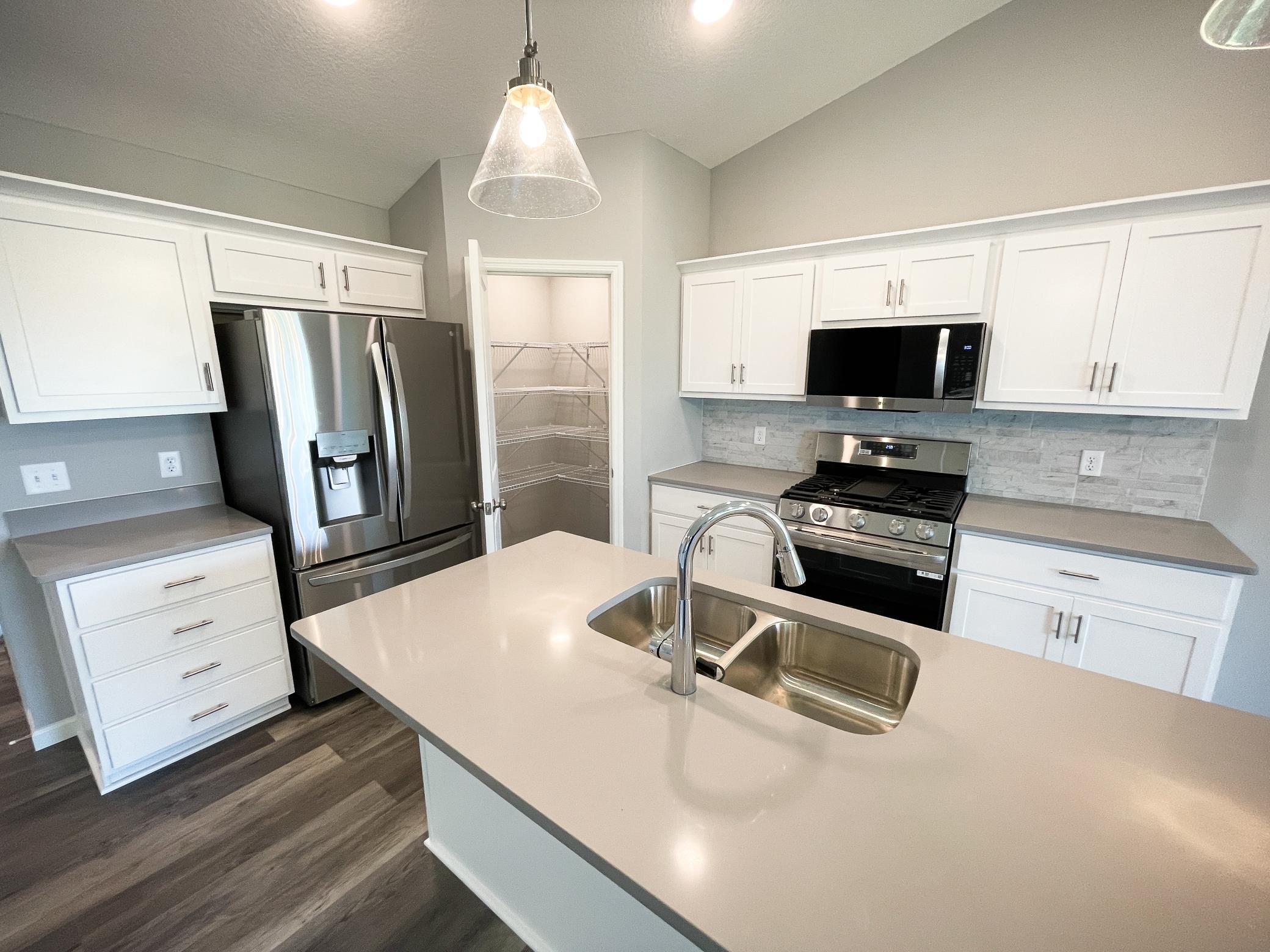 Ask about our 4.99% interest rate with our preferred lender! This beautiful home is ready for you to move right in! Lots of curb appeal with the oversize front porch & a finished walkout basement! This beautiful rambler home with a 3-car garage has an open concept with vaulted ceiling, LVP throughout main living level, quartz countertops, ceramic tile kitchen backsplash & walk in pantry. With 3 bedrooms on the main level and the conveniently located laundry, this is a must see. Downstairs, 2 additional bedrooms and a bathroom along with a large family room with fireplace & extra flex room gives plenty of space for everyone to hang out together or separately, whether working from home or playing at home. Sod and inground sprinkler are included. **This neighborhood features THE HOLLOW, a brand new neighborhood park & playground!**