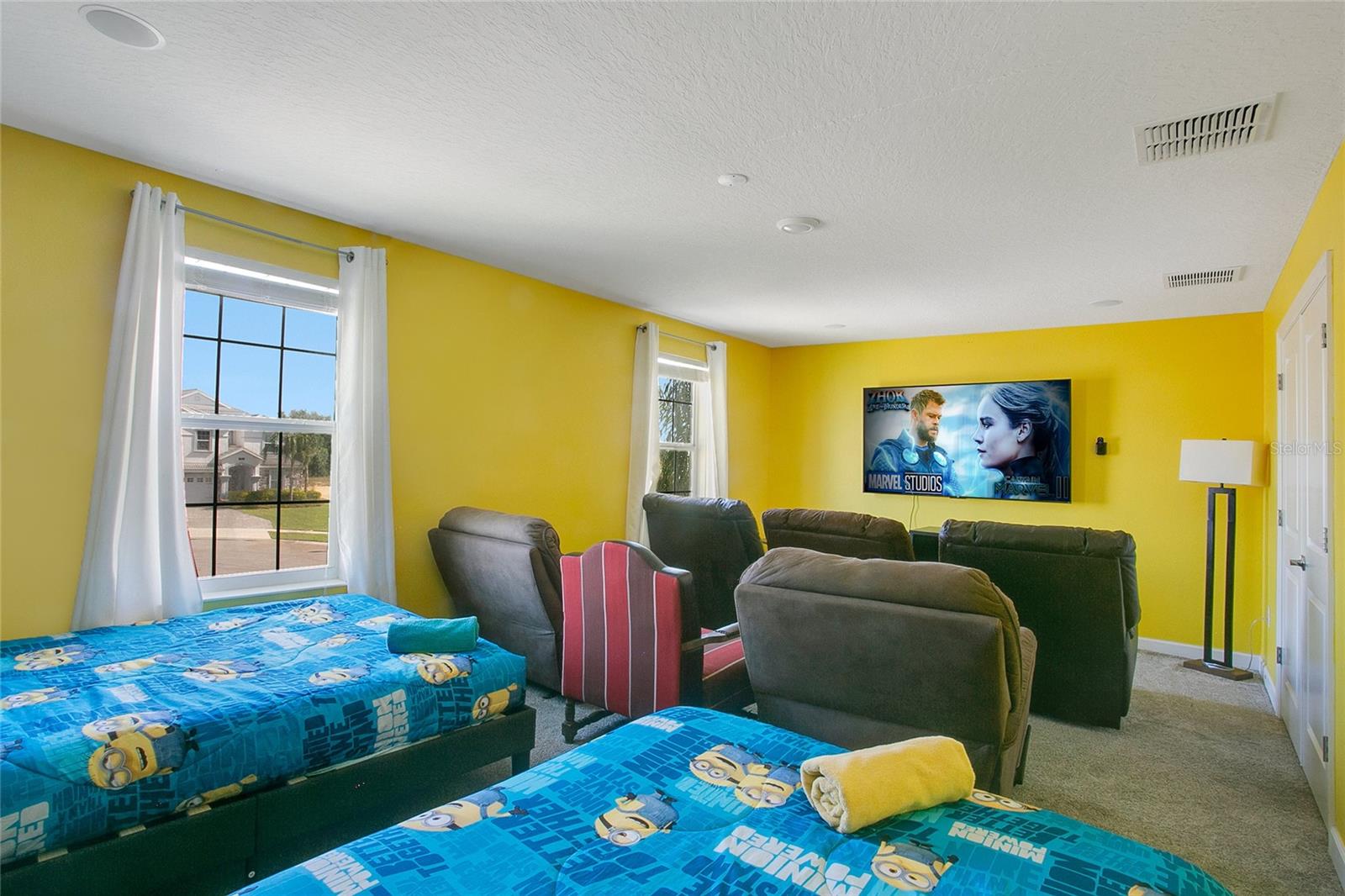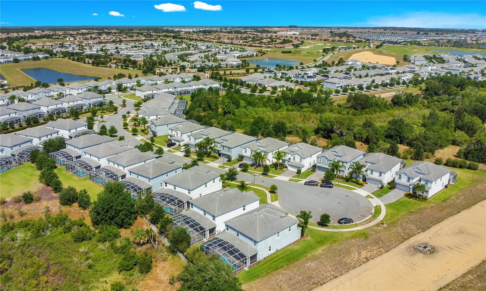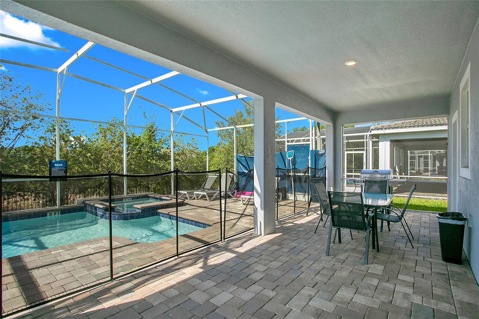 GOLF VIEW! FULLY FURNISHED POOL HOME in 24-hour guarded gate, resort community - Champions Gate. Located at the end of a cul-de-sac with a golf view and no rear neighbors, this beautiful 8-bedroom, 5-bathroom home offers an exquisite living experience. The well-appointed kitchen opens to a spacious gathering room and dining area, with sliding doors leading to a large covered lanai. The lanai opens to a fully screened, heated pool and spa, perfect for relaxation and entertainment. The primary suite and an additional guest suite are conveniently located on the first floor for easy access. Upstairs, you'll find two sets of Jack-and-Jill bedrooms, two guest rooms and a bathroom, an oversized loft, and an elegant theater, making this home a perfect fit for the whole family. The garage has been beautifully converted into a large game room. This gated golf resort community features an over 10,000 sq ft clubhouse with a fitness center, theater, pool, cabanas, waterslide, lazy river, volleyball court, tennis courts, a play zone with lots of activities, a tiki bar, and much more! The HOA includes lawn maintenance, internet, cable, and daily valet trash service in this 24-hour gated community. Minutes away from shopping, dining, and world-renowned attractions! Rent includes pool maintenance, lawn care, internet, cable, and daily trash pickup.