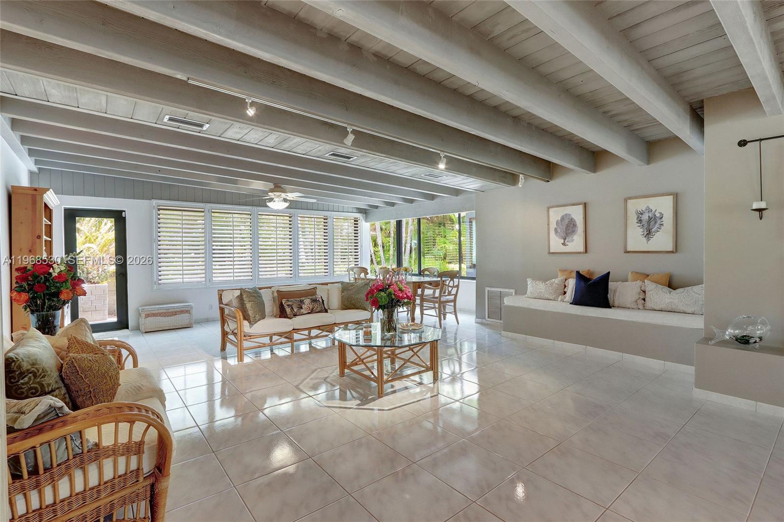 Sprawling 5 bedroom, 4 bath home is nestled on an acre of gracious oaks and lush greenery. Meandering pathways lead to quiet spots for relaxation and nature watching. Unique home has oversized windows showcasing serene views. Wood vaulted ceiling accents main living. Expansive primary suite features spacious sitting area with skylights and plantation shutters overlooking lush gardens. Gather with friends in the large entertainment room with mahogany pub-style bar. Home boasts office space, fireplace, and generously sized rooms. Kitchen features Corian counters, sleek Italian cabinetry, and built in Sub Zero.