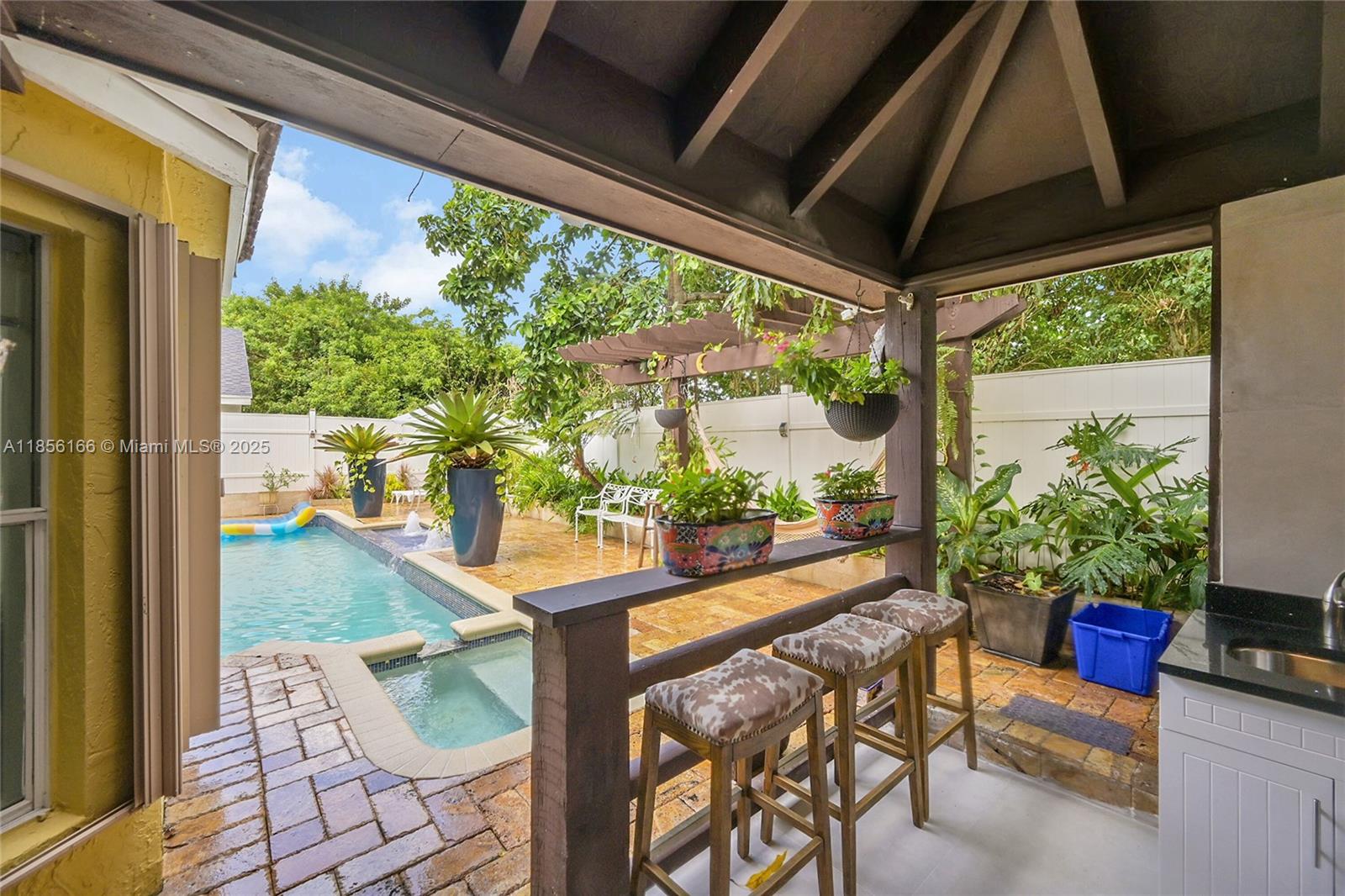 Beautifully upgraded 4-bedroom (2 suites), 3.5-bath home with vaulted ceilings, crown moldings, plantation shutters, and hardwood floors throughout. Spa-style bathrooms with rain showers and jets; master bath with Italian marble floors and walls. Chefs kitchen with newer appliances,Sub-zero refrigerator, waterfall quartz island, hot tower, tankless water Heater. Outdoor summer kitchen with Alfresco BBQ grill/with Rotisserie, pizza oven, under wood-paneled patio ceiling. Oversized pool with spa blower, spa bench with jets, marble pool deck, and tropical fruit trees.Also featuring are hurricane shutters, brick driveway, oversized garage with custom closet, upgraded half bath, mud room, and hi-hat lighting throughout. HOA offers tennis courts, pickleball courts, and kids playground.