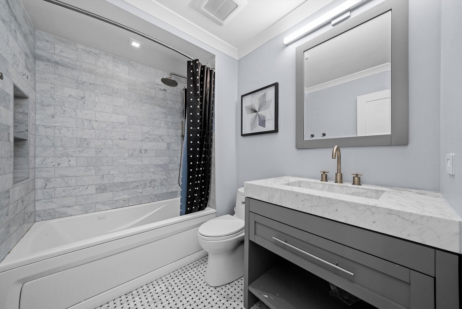 Sophisticated, fully updated 2-bedroom, 2-bath condominium in desirable Palos Park. This impeccably renovated residence showcases refined finishes and thoughtful design throughout. The expansive primary suite offers a walk-in closet and a spa-inspired en-suite bath featuring dual vanities, a custom tile shower with rain shower head, and a sleek frameless glass enclosure. The secondary bathroom is elegantly appointed with an updated vanity, tub, and designer tile surround. Rich hardwood floors extend throughout the home, complemented by crisp white interior doors, decorative white trim, and dimmable recessed lighting that enhances the home's modern ambiance. The chef-inspired kitchen boasts white cabinetry, granite countertops, built-in microwave, and ambient under-cabinet accent lighting-perfect for both everyday living and entertaining. Additional conveniences include in-unit washer and dryer and an attached garage to the building. A truly turnkey residence offering timeless elegance, comfort, and upscale living.