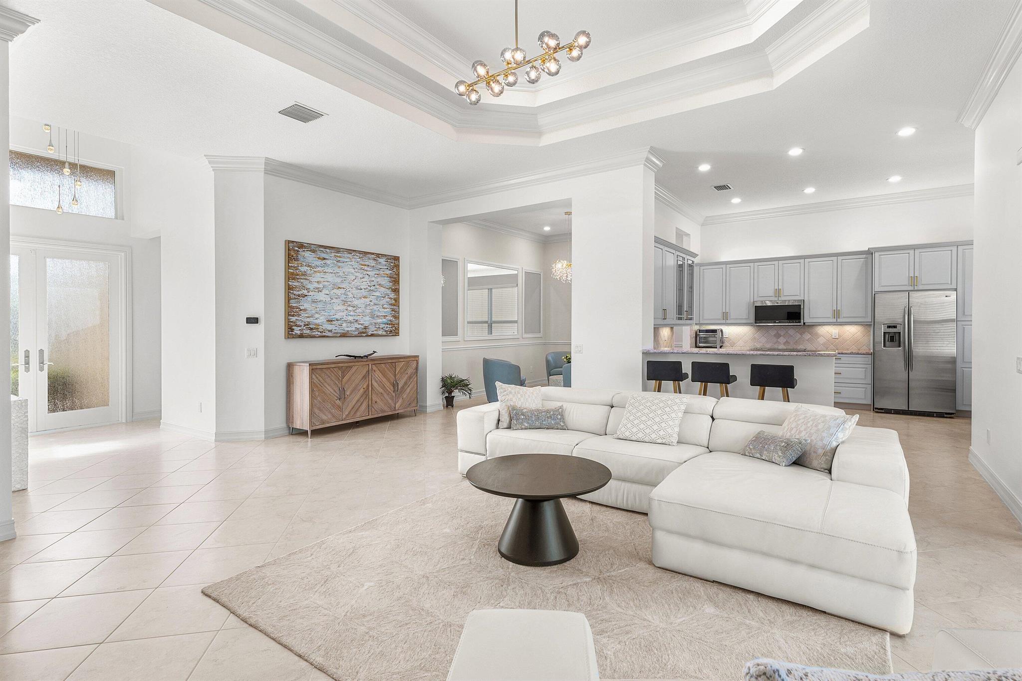 Stunning, light-filled Alexandra Grand model home featuring two expansive primary suites, an additional third bedroom, and three full baths--all complemented by a whole-house generator and a serene view. The home welcomes you with custom impact double front doors and transom window. The gourmet kitchen offers stainless steel appliances and light cabinetry. The interior has been freshly painted, and all three bedrooms now feature brand-new luxury vinyl flooring. Additional upgrades include crown molding, custom millwork, designer mirrors in the dining room, beautiful new fixtures, and outfitted primary closets, among more thoughtful enhancements. Located in the highly sought-after Valencia Reserve, a 55+ community, soon unveiling its exquisitely renovated clubhouse. Welcome Home!