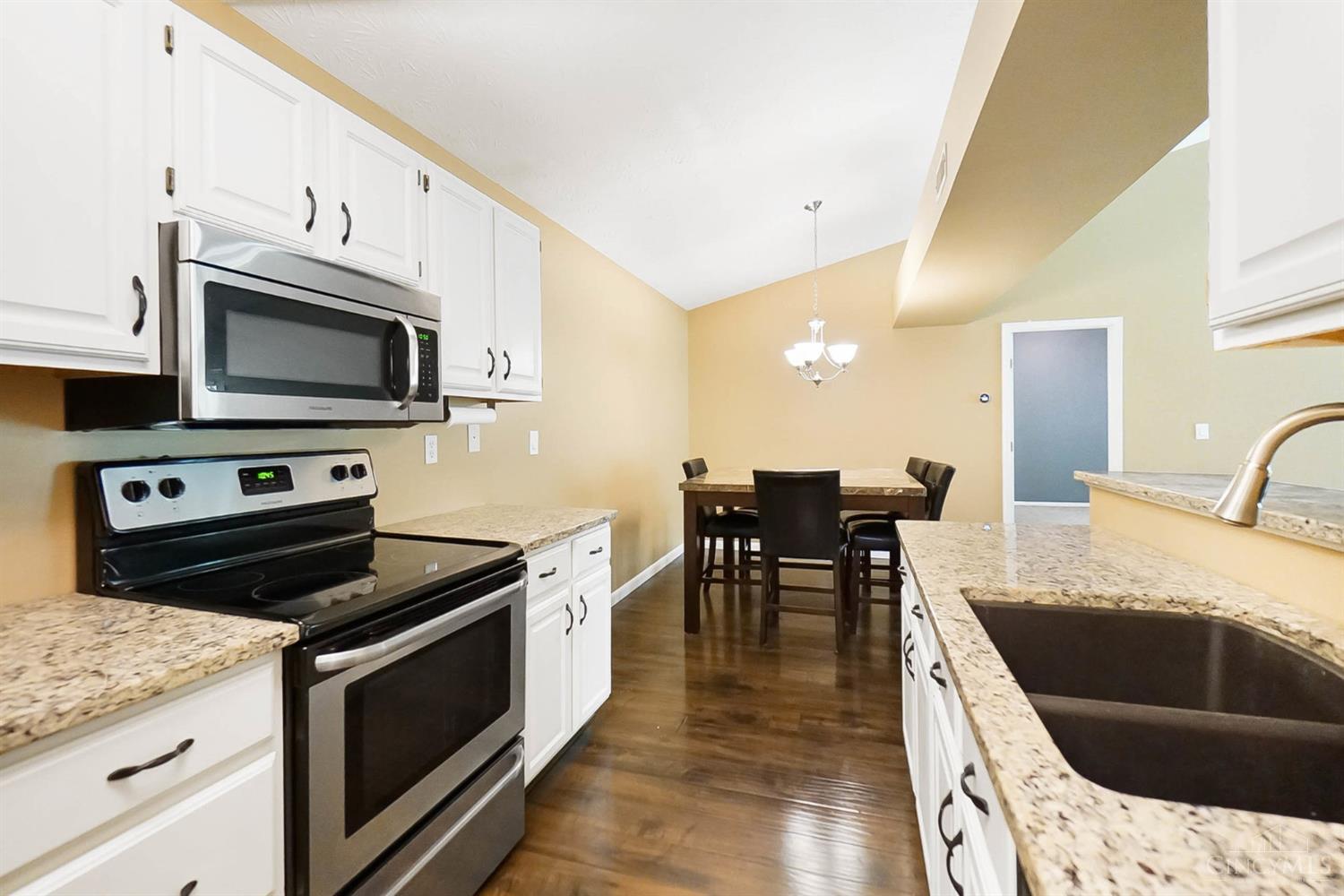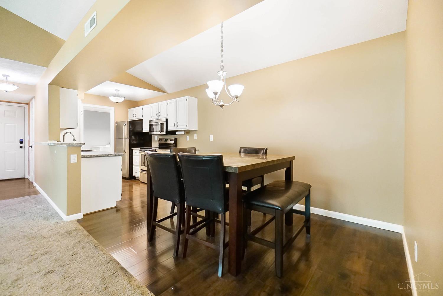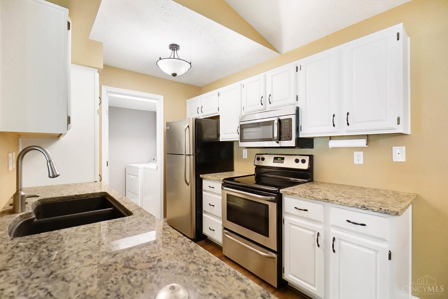 Lock & Go Lifestyle! This beautifully updated condo features soaring cathedral ceilings, 2 spacious bedrooms, 2 full baths, and garage. The kitchen shines with granite counters, stainless steel appliances, and updated flooring throughout (2020). Cozy up by the wood-burning fireplace in the living room, or relax on your covered patio with a private wooded view. Spacious rooms and move-in ready make it perfect for everyday living or entertaining!