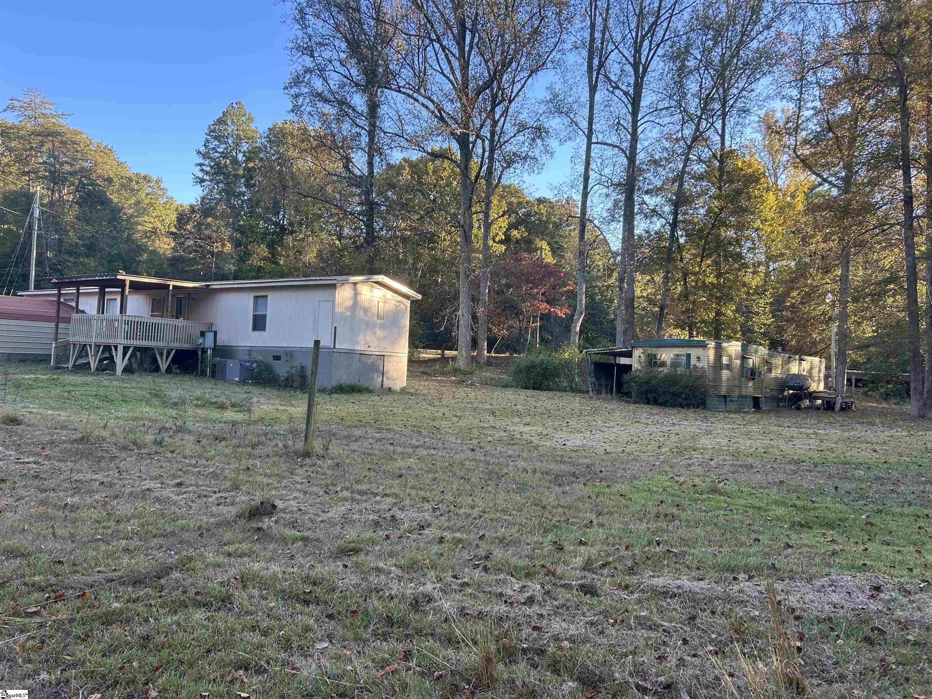 Well over an acre of land bordered by a natural creek and surrounded by forest. Perfect for enjoying abundant wildlife in a private setting. The 2BR/2BA de-titled manufactured home sits on a block foundation with metal roof, working HVAC, and new water heater. A second small mobile home on site needs to be torn-down, but the septic and hook-ups are in place for another home to replace it if desired. Two wells on the property, along with public water, septic, storage building and carport that convey with purchase. This home should qualify for most types of traditional financing. Ask for details.