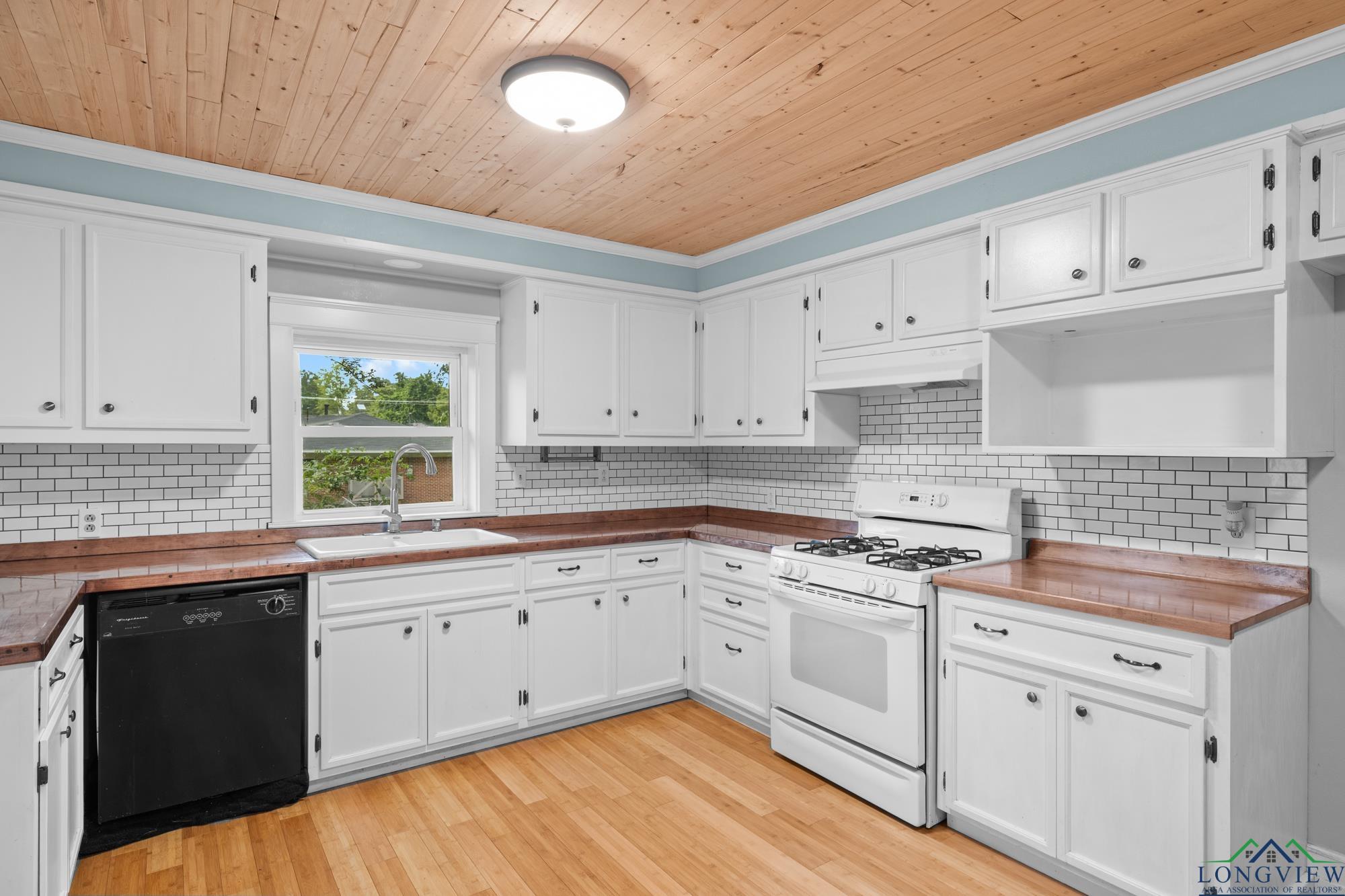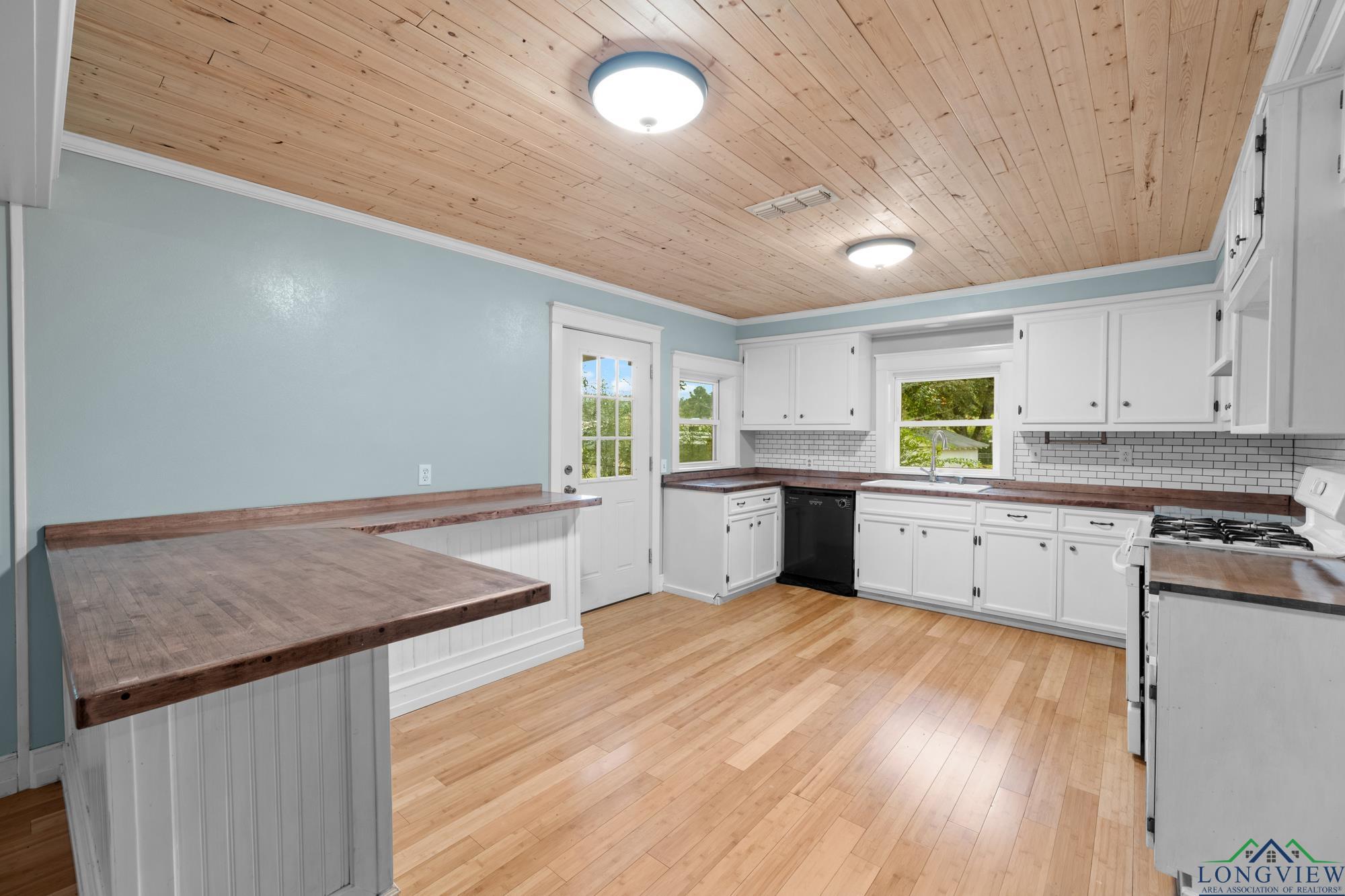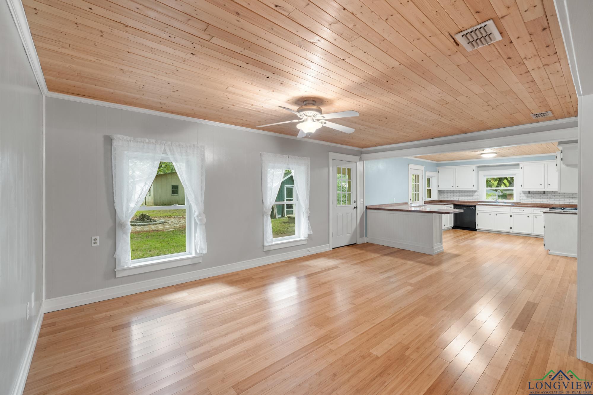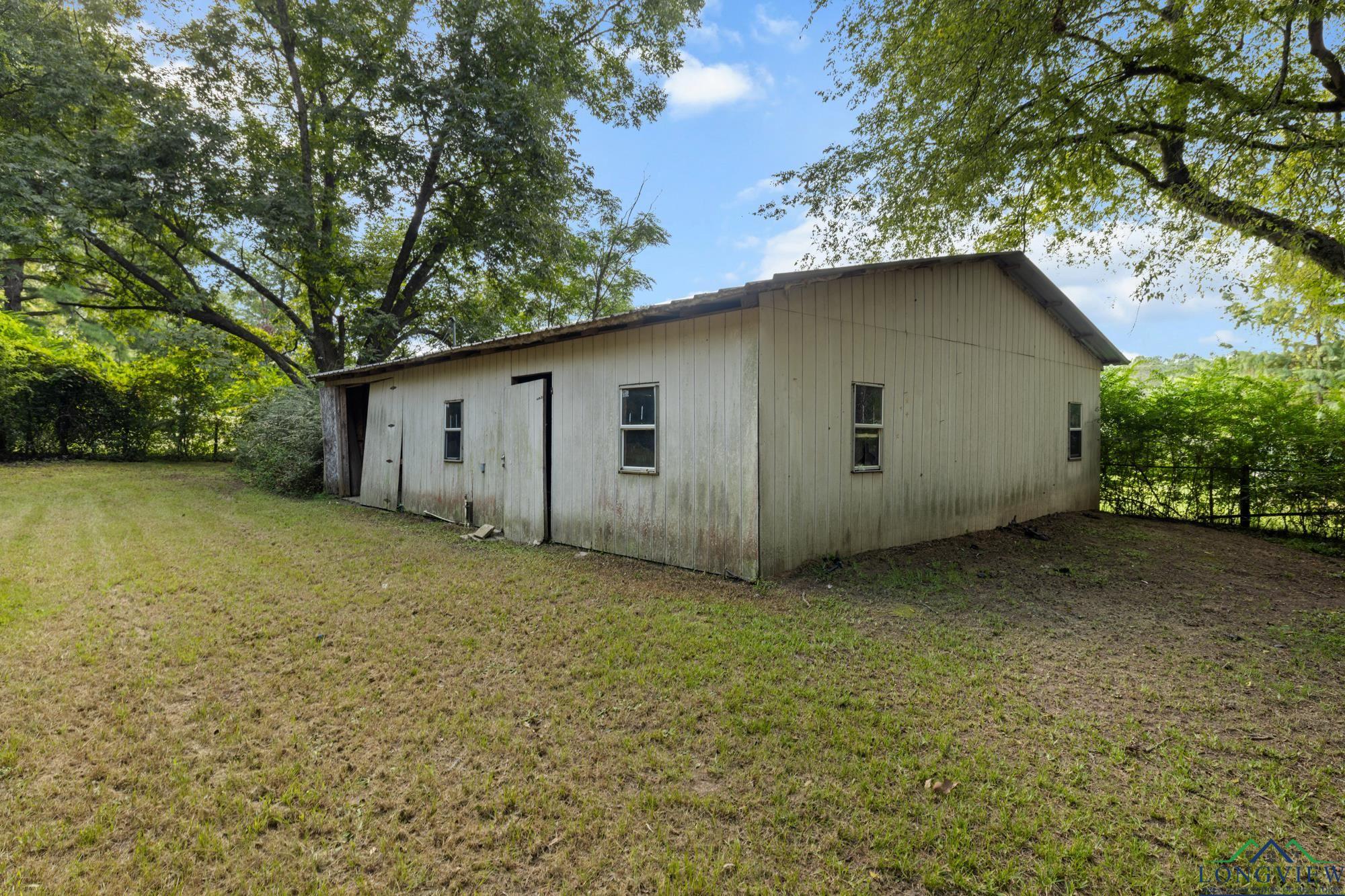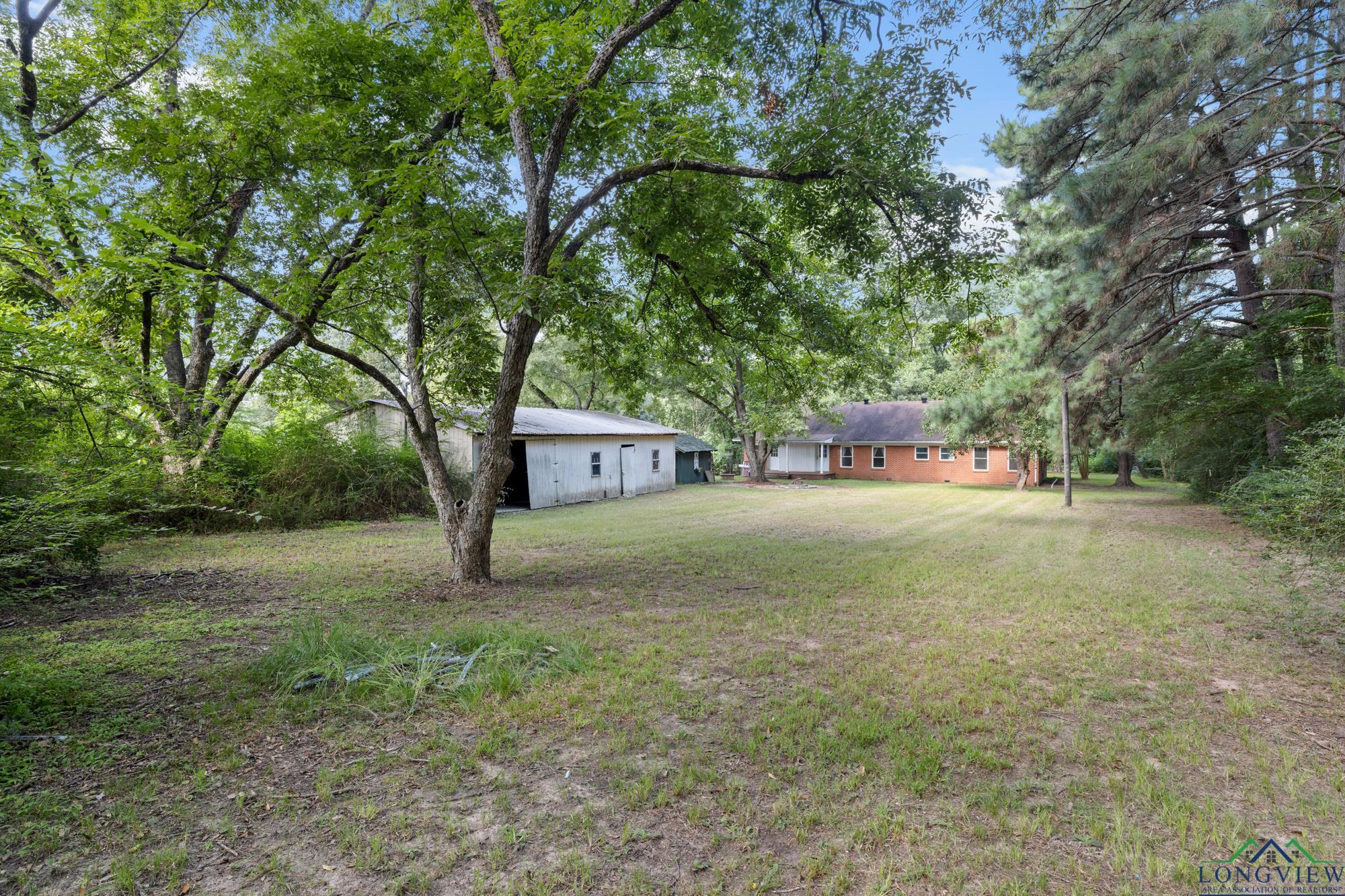 This beautifully updated 3/2/2 home has 2100 sf and is located in Hughes Springs ISD. The home features wood flooring and wood plank ceilings through out the home, a large living area, spacious kitchen and a large primary bedroom. In the kitchen you will find, butcher block counter-tops that pop against the white cabinets and exquisite subway tiled backsplash. The living room features plenty of room for the whole family/friends and an extra walled-in sitting area. The primary bedroom features a walk-in closet and a large en suite. In the en suite you will find, double lavatories and plenty of extra storage. Step outside into the huge fenced backyard and find the 650 sf shop and a storage building.