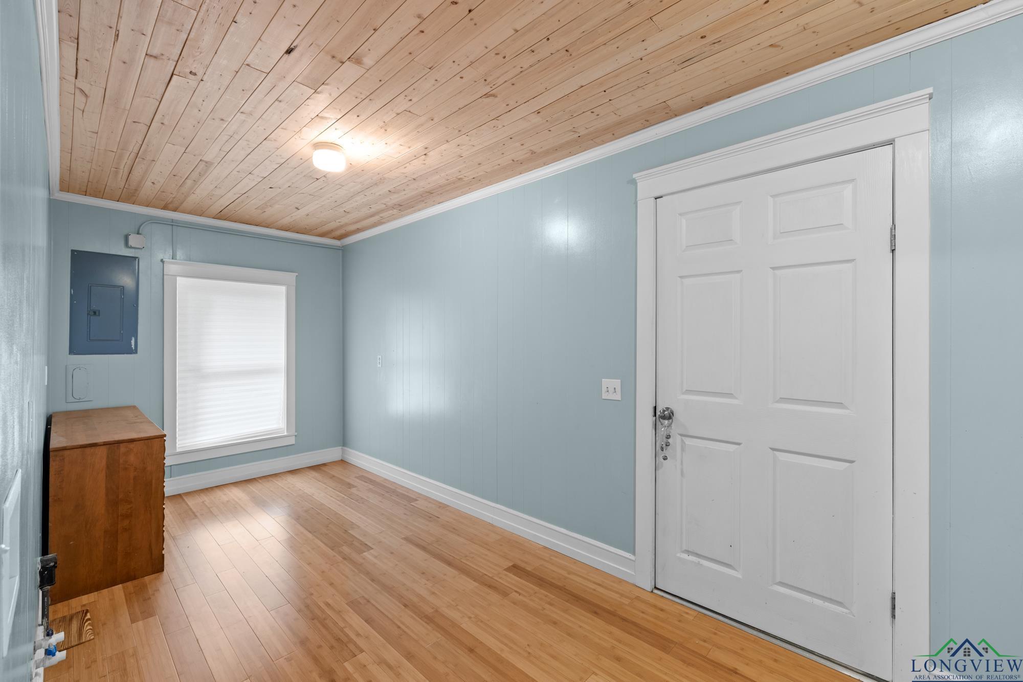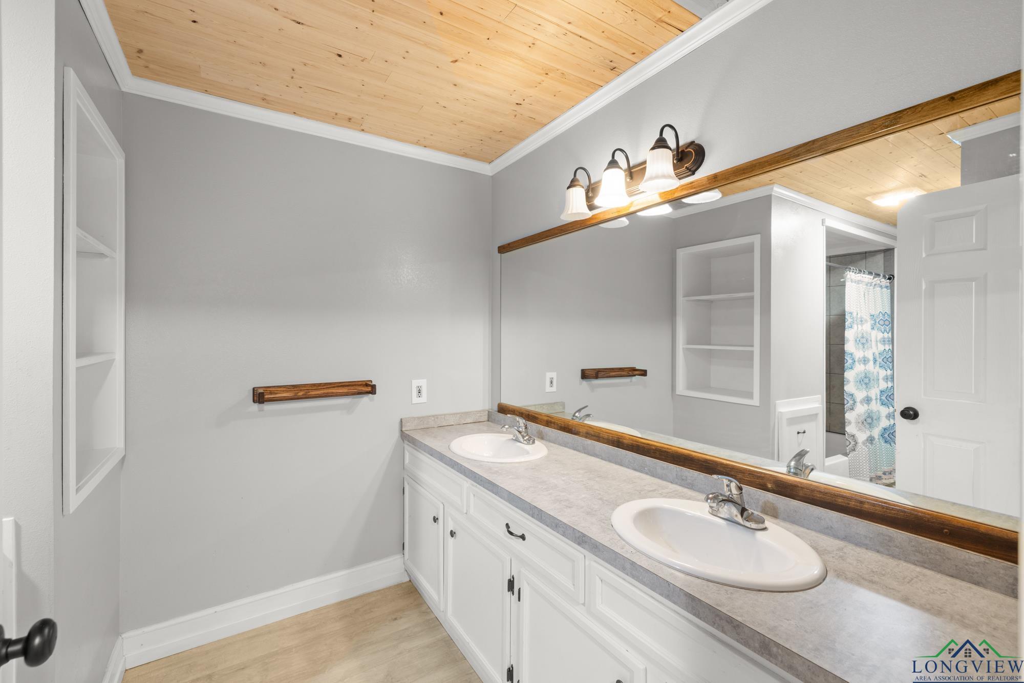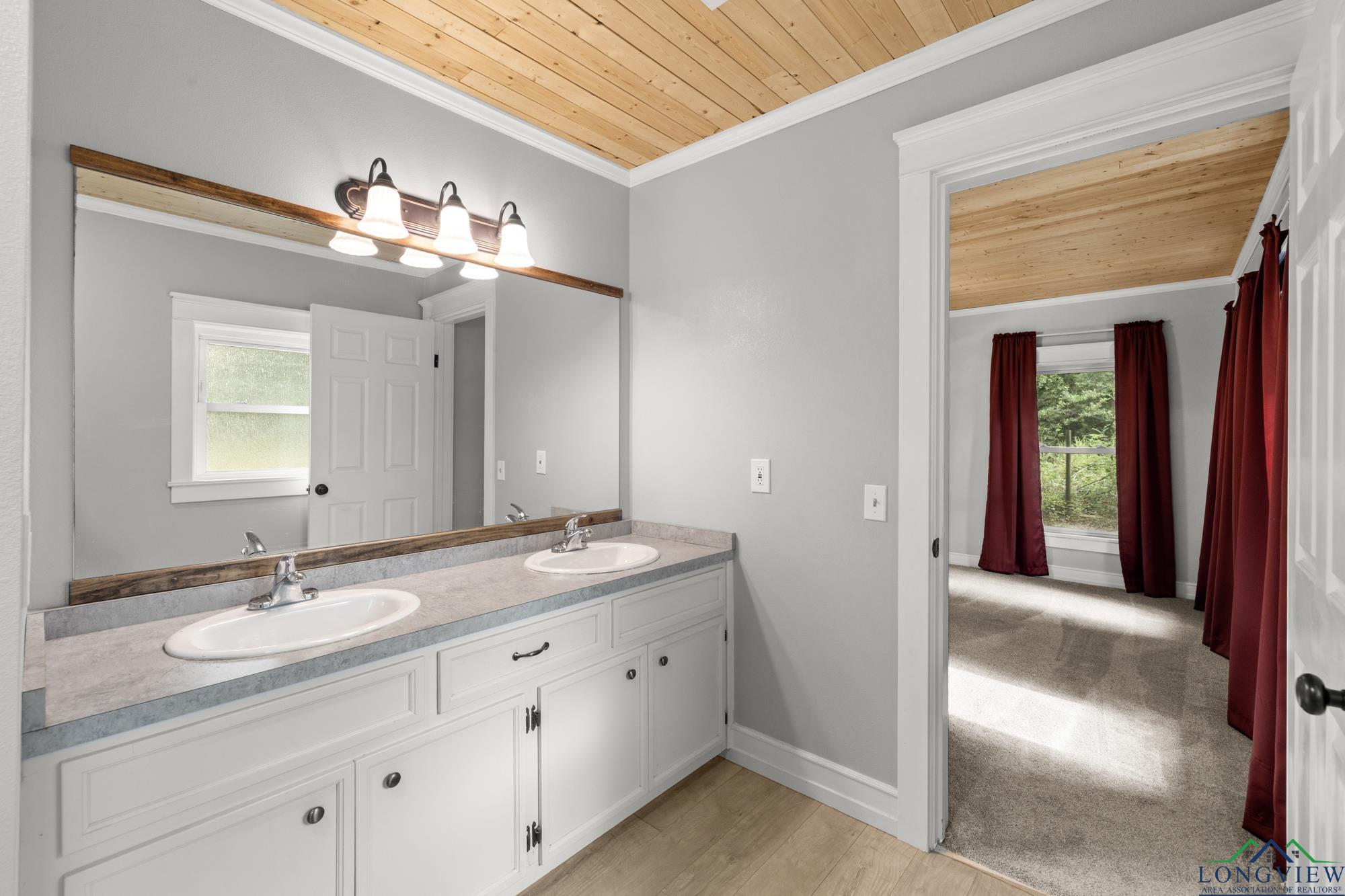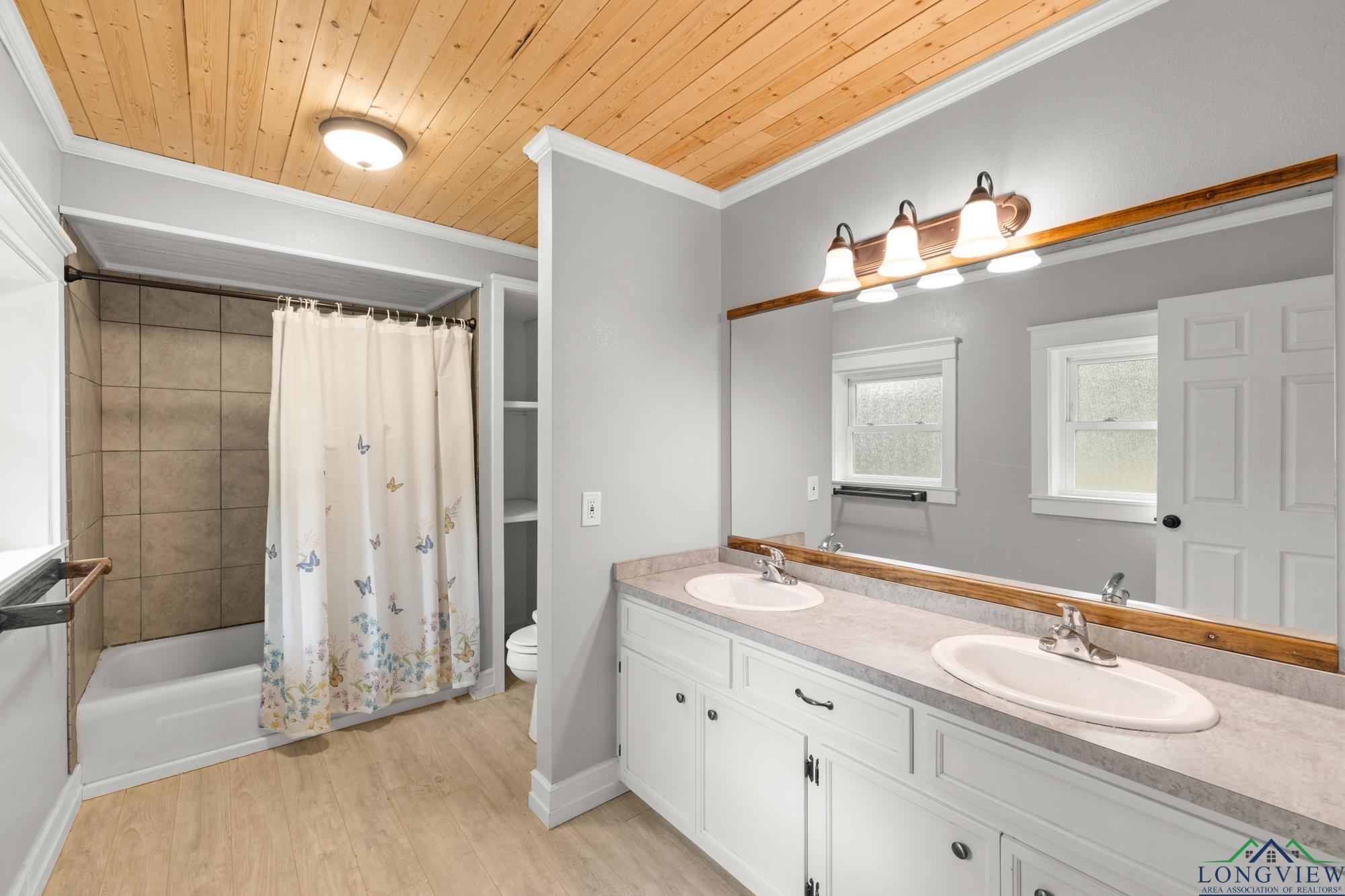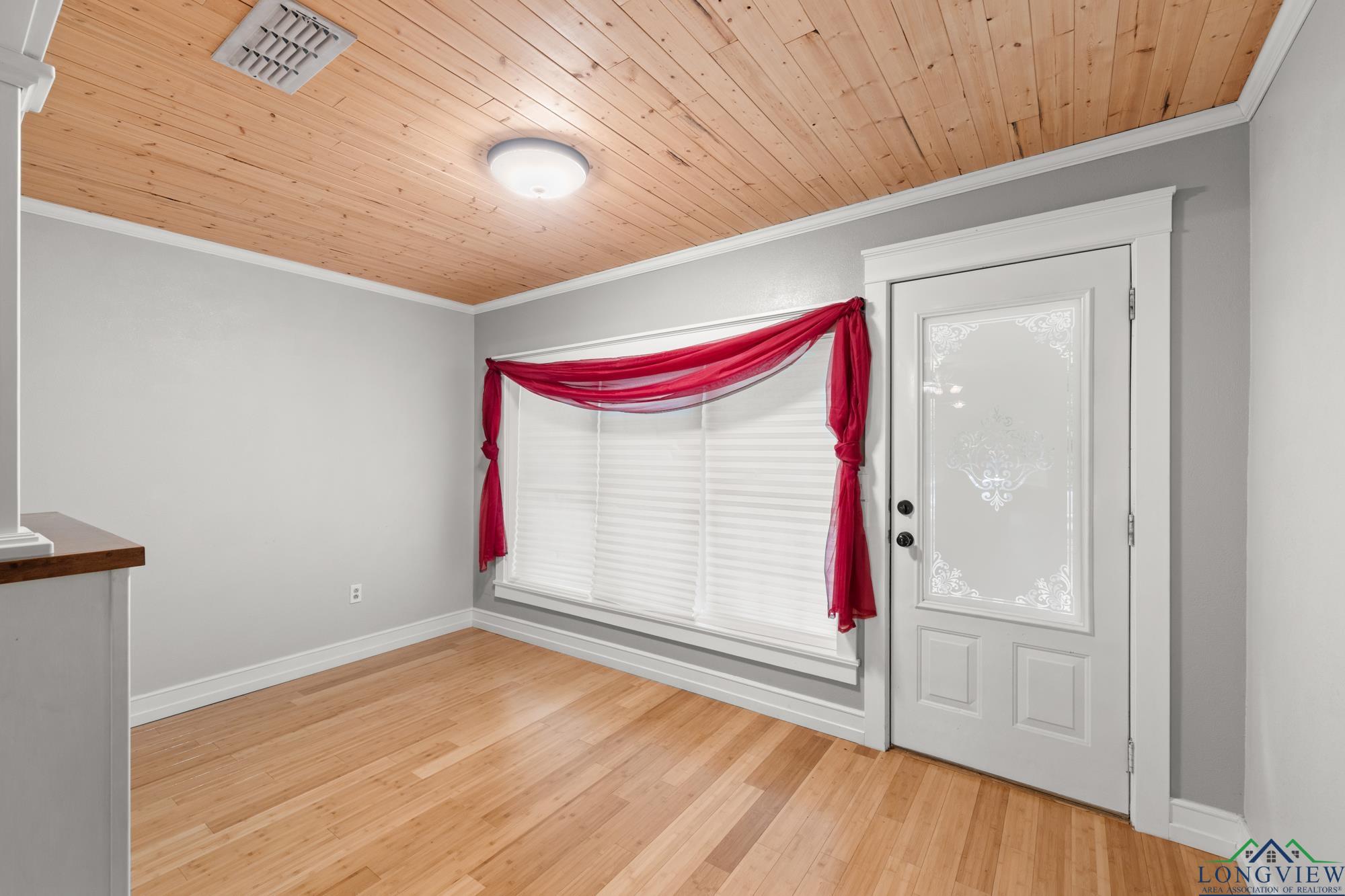This beautifully updated 3/2/2 home has 2100 sf and is located in Hughes Springs ISD. The home features wood flooring and wood plank ceilings through out the home, a large living area, spacious kitchen and a large primary bedroom. In the kitchen you will find, butcher block counter-tops that pop against the white cabinets and exquisite subway tiled backsplash. The living room features plenty of room for the whole family/friends and an extra walled-in sitting area. The primary bedroom features a walk-in closet and a large en suite. In the en suite you will find, double lavatories and plenty of extra storage. Step outside into the huge fenced backyard and find the 650 sf shop and a storage building.