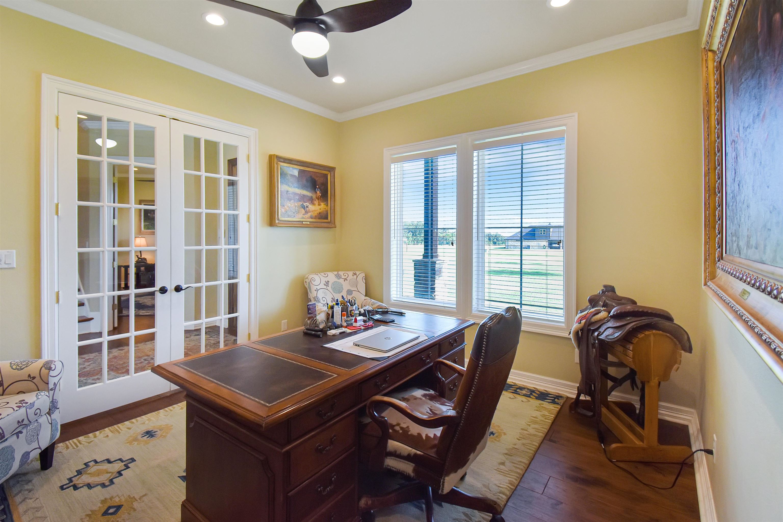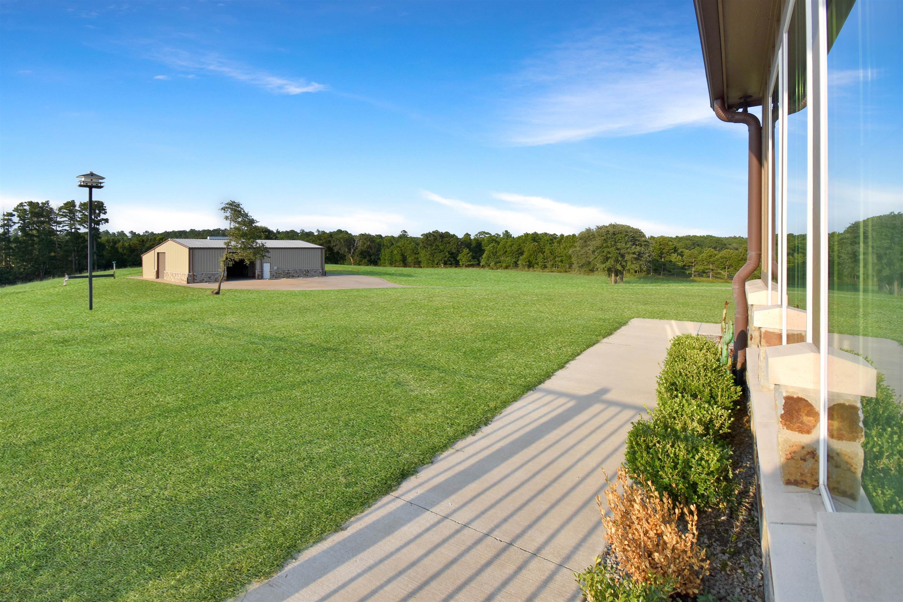Nestled on a sprawling 7.496-acre lot, this stunning 5-bedroom, 3.5-bathroom residence offers modern luxury and serene country living. Built in 2018, the two-story home boasts 4,209sq ft of meticulously designed space with high-end finishes. The main level features two spacious living areas, including a primary room with a cozy gas fireplace and expansive windows overlooking the lush backyard. A versatile second area can serve as a bedroom or retreat, with a nearby half bath for guests. An office space adds functionality to the main floor, providing a quiet spot for work or study. The kitchen is a culinary dream with Sub-Zero Wolf appliances, including an oven, gas cooktop, microwave, fridge, wine fridge, and steam oven. It includes a breakfast bar and a casual dining area illuminated by large windows, creating an inviting space for family meals and entertaining. The luxurious master suite offers direct access to a lavish bath with a walk-in shower, soaking tub, dual sinks, and a vanity area. The master closet is exceptionally spacious with ample storage and a 10ft library ladder for easy access to upper shelves and hanging space. Outdoors, enjoy an in-ground pool for hot days, a covered patio with a wood-burning stone fireplace for cooler evenings, and a dedicated grilling area with a green XL egg (charcoal grill and smoker), pizza oven and gas grill for outdoor cooking enthusiasts. The property is designed for efficiency with low-energy windows, a 22W generator, and a 630ft deep well. Additional features include outdoor storage for golf carts and boats, along with a workshop area measuring 3,900sq ft (60x65 ft) that includes a half bath, 150sq ft vaulted safe room, and a paved patio area perfect for outdoor seating. A 3 car garage completes this exceptional home, ideal for those seeking comfort and style in every detail. This residence truly blends luxury with practicality, offering a peaceful retreat with all the amenities needed for modern living!