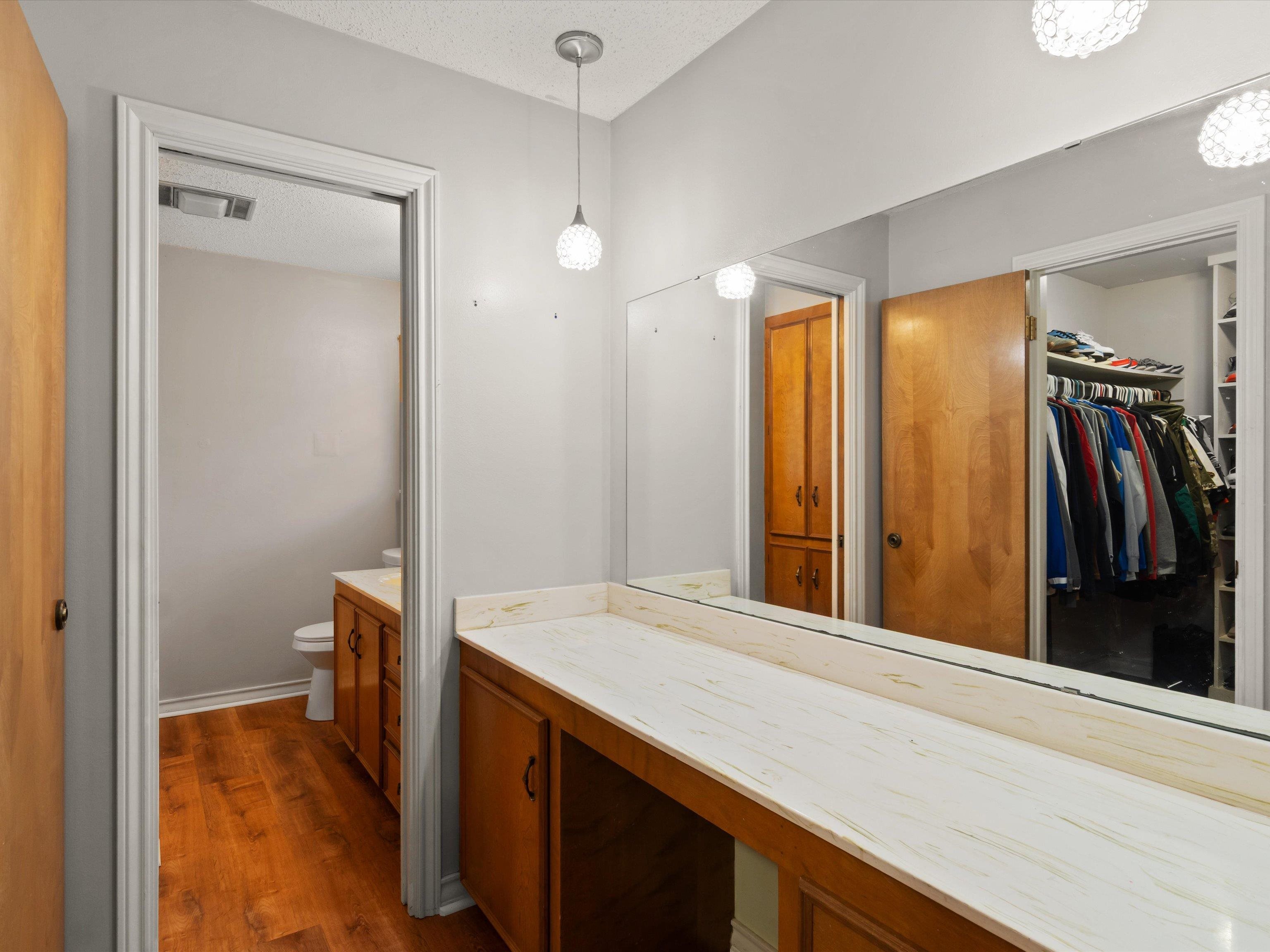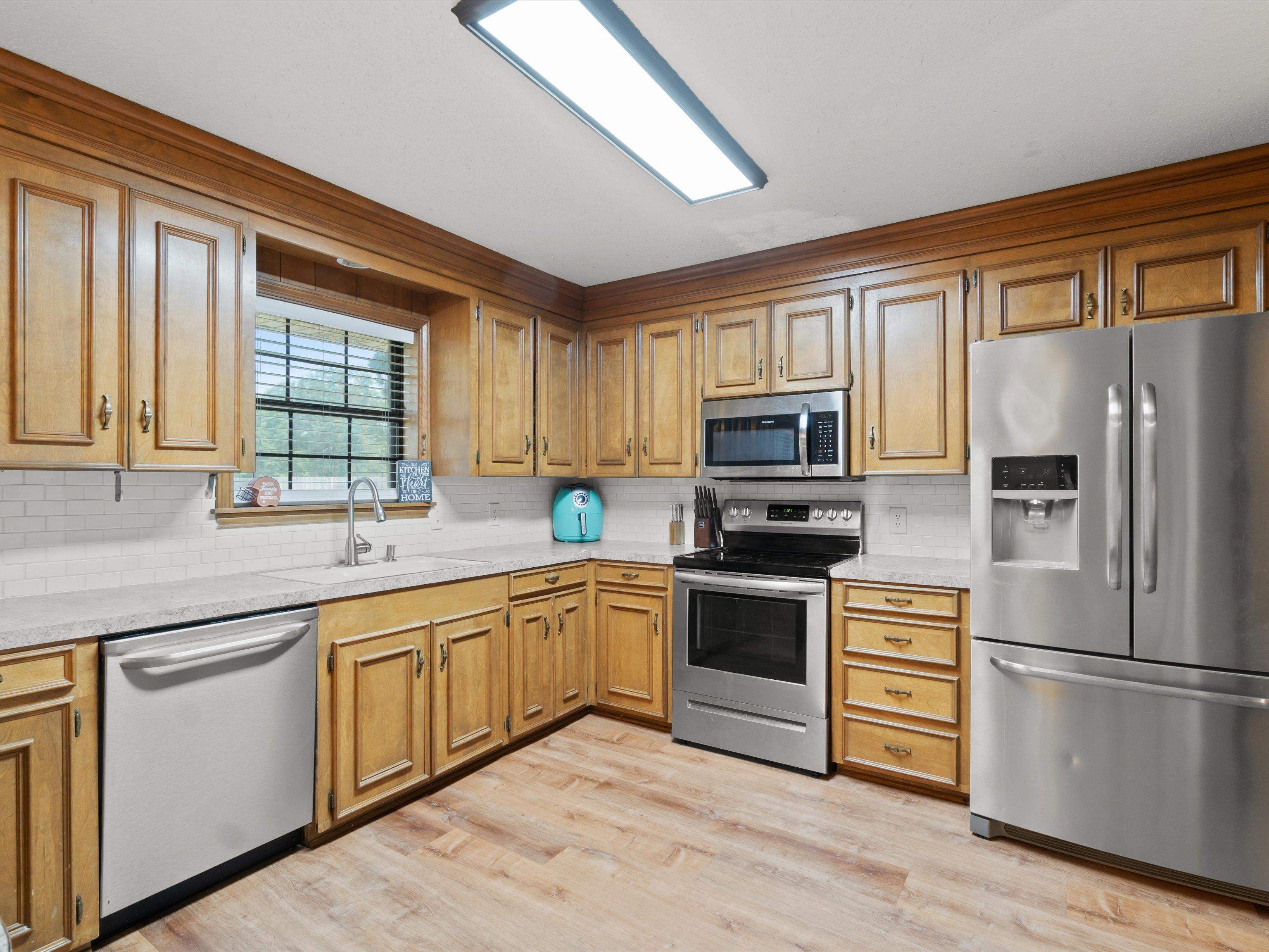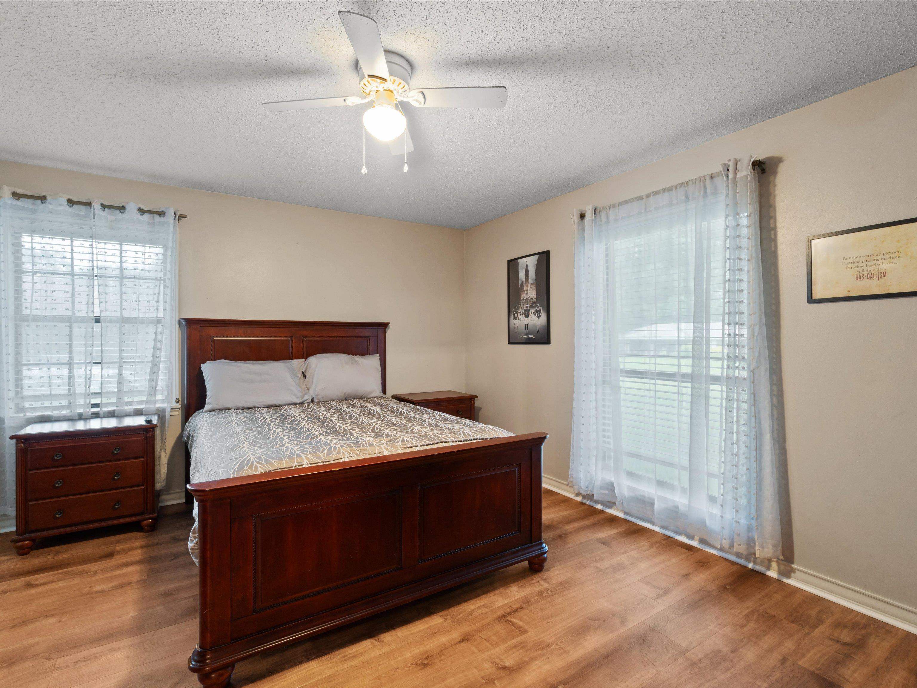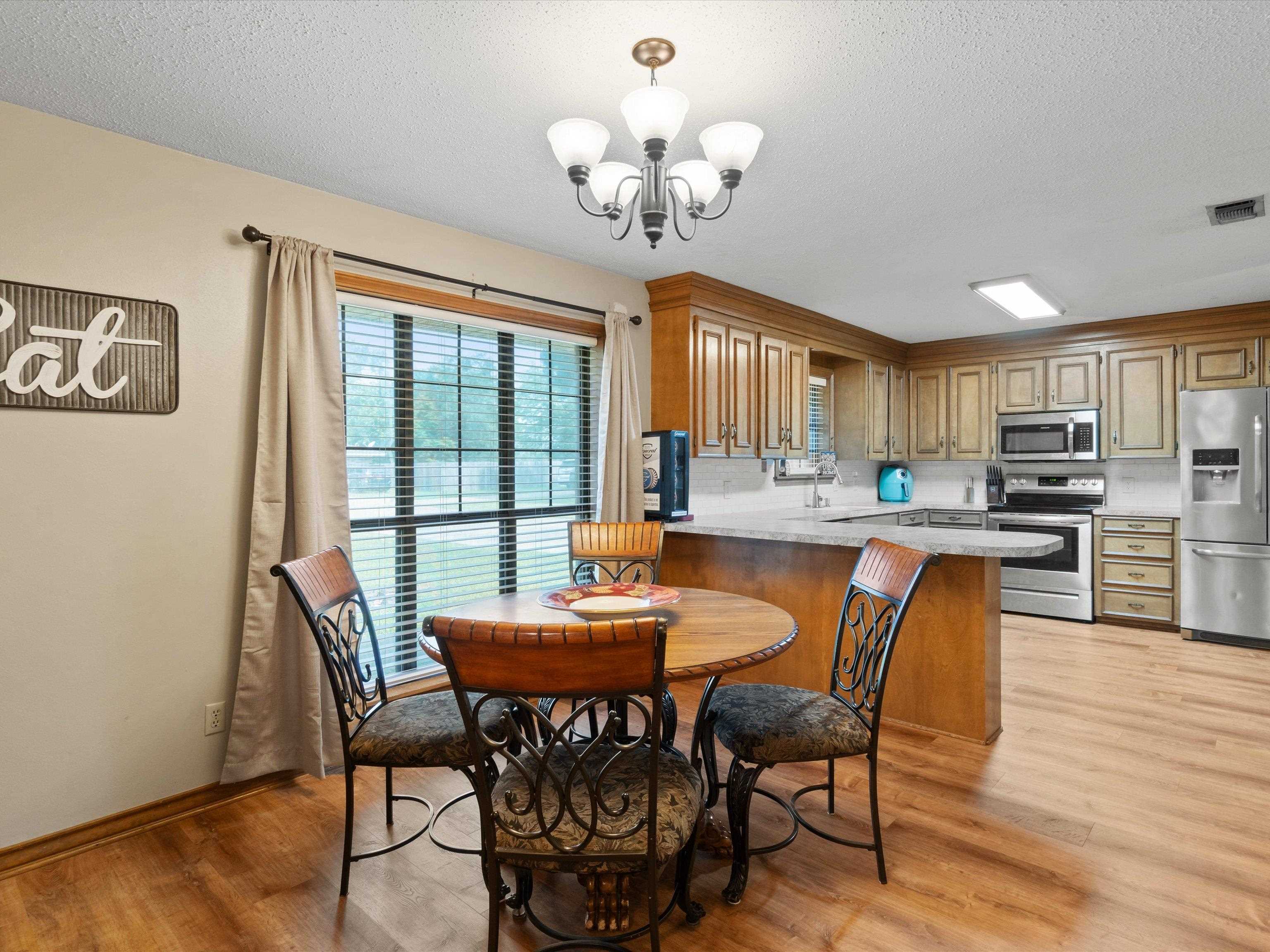 Don't miss this move-in ready gem tucked away in a peaceful and desirable neighborhoodperfect for your next chapter! Step inside to discover a spacious and open kitchen featuring updated countertops, a stylish new tile backsplash, stainless steel appliances, and plenty of room for family meals and entertaining. The living room boasts a built-in entertainment center, creating a cozy yet functional focal point for everyday living. The primary suite offers a large walk-in closet, newer blinds with black out screens, a generous vanity and dressing area, and direct access to a beautiful bathroom. The secondary bedrooms are also oversized, and the home is loaded with storage, including two large hall closets and custom cabinetry throughout. Outside, enjoy the huge backyard enclosed by a wooden privacy fenceideal for kids, pets, or weekend get-togethers. A recently added 12x12 storage/workshop building gives you room for hobbies or extra tools. Additional exterior features include a two-car garage with cabinet storage and backyard access, extended concrete patio space perfect for entertaining and gutters added. With updated flooring and thoughtful upgrades throughout, this home is as practical as it is charmingand it wont last long! Schedule your private tour today before this one gets away.
