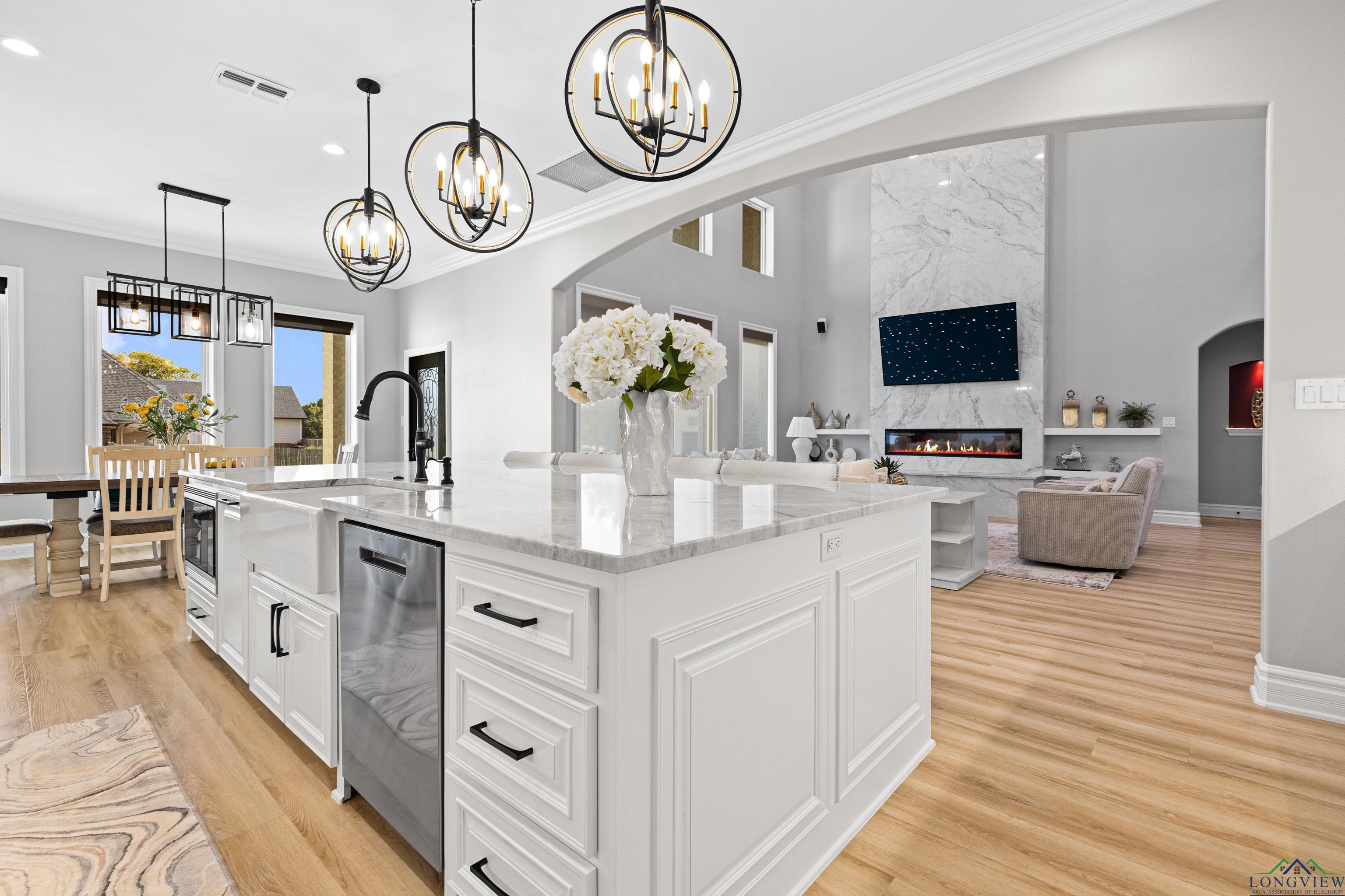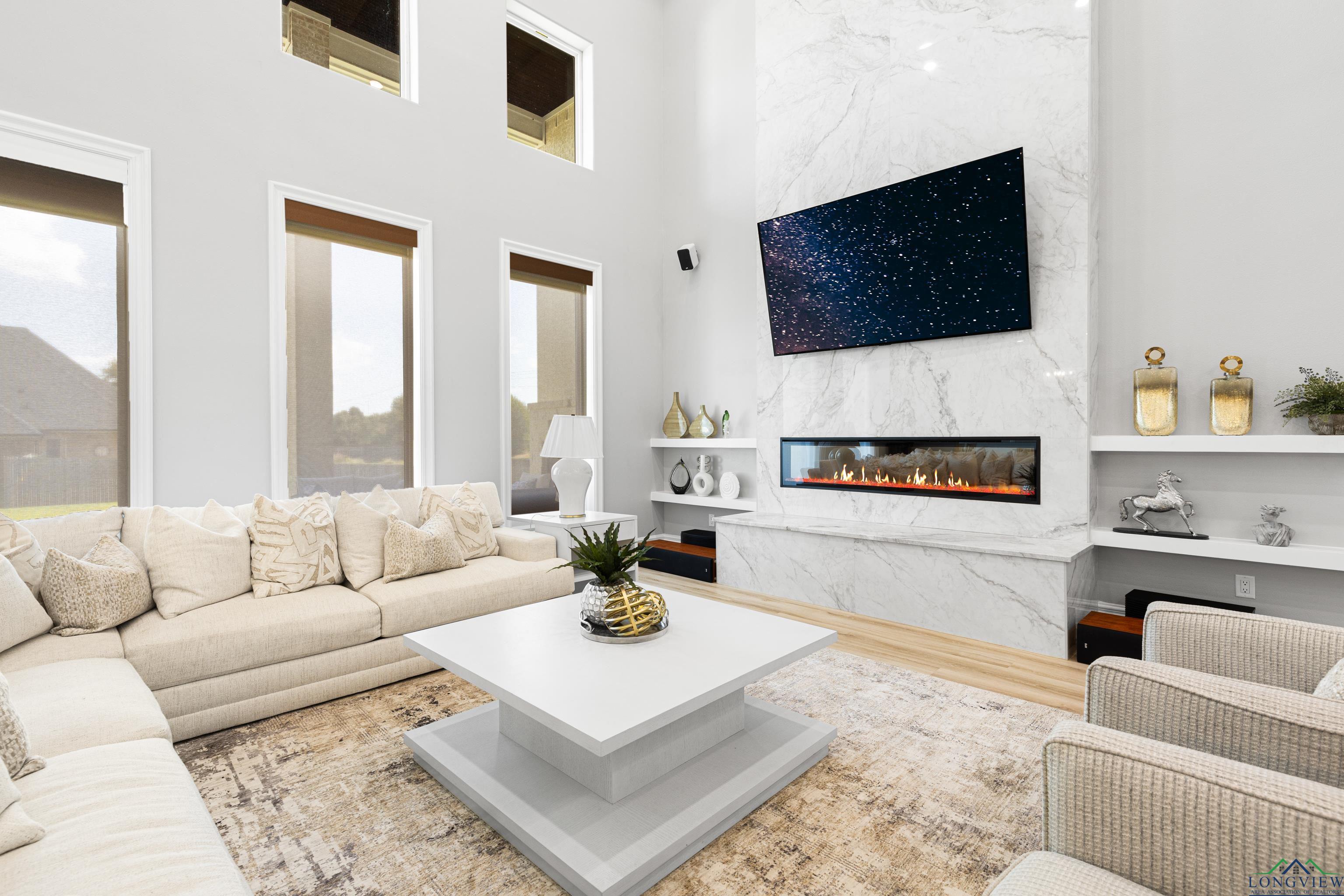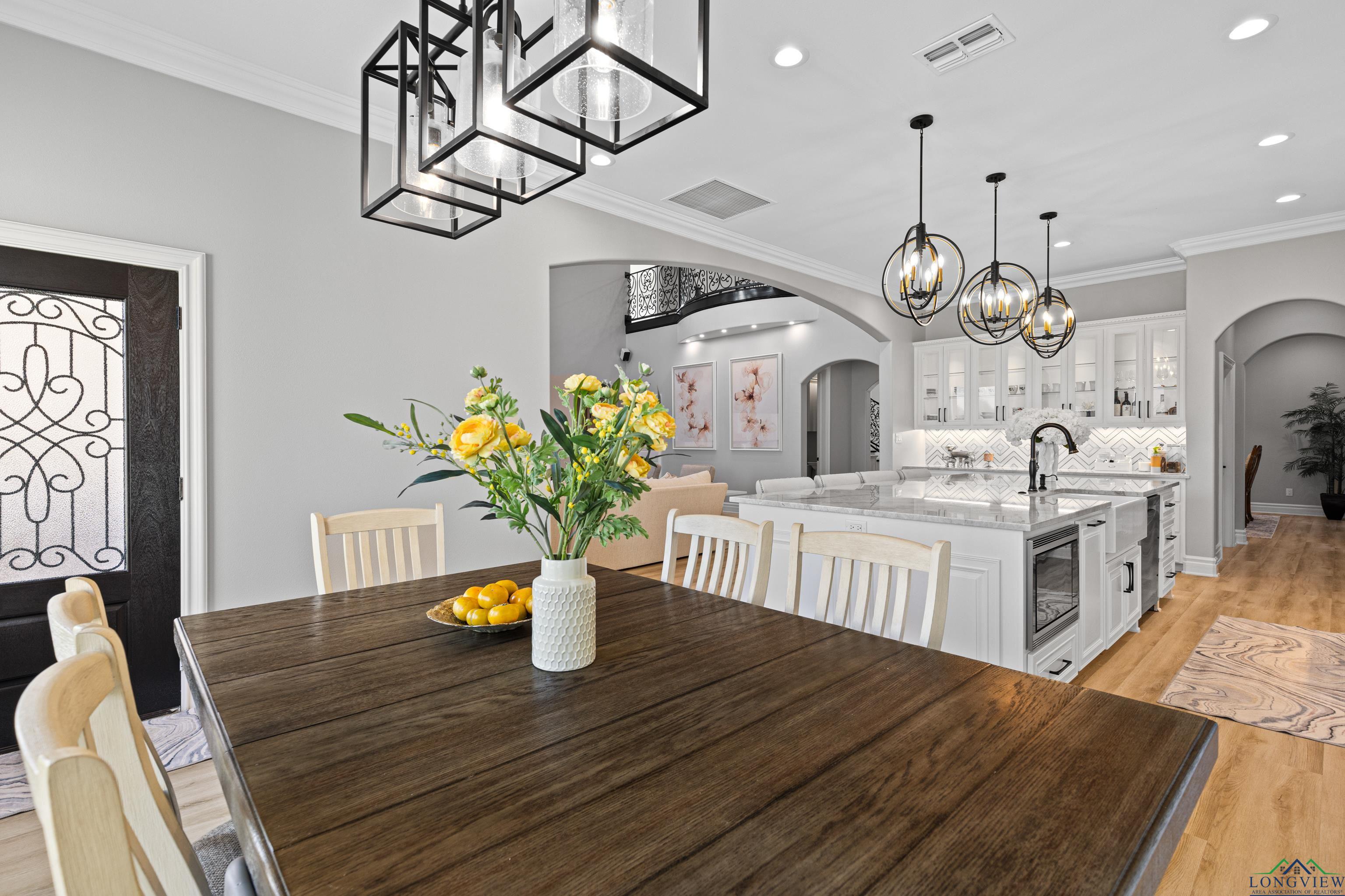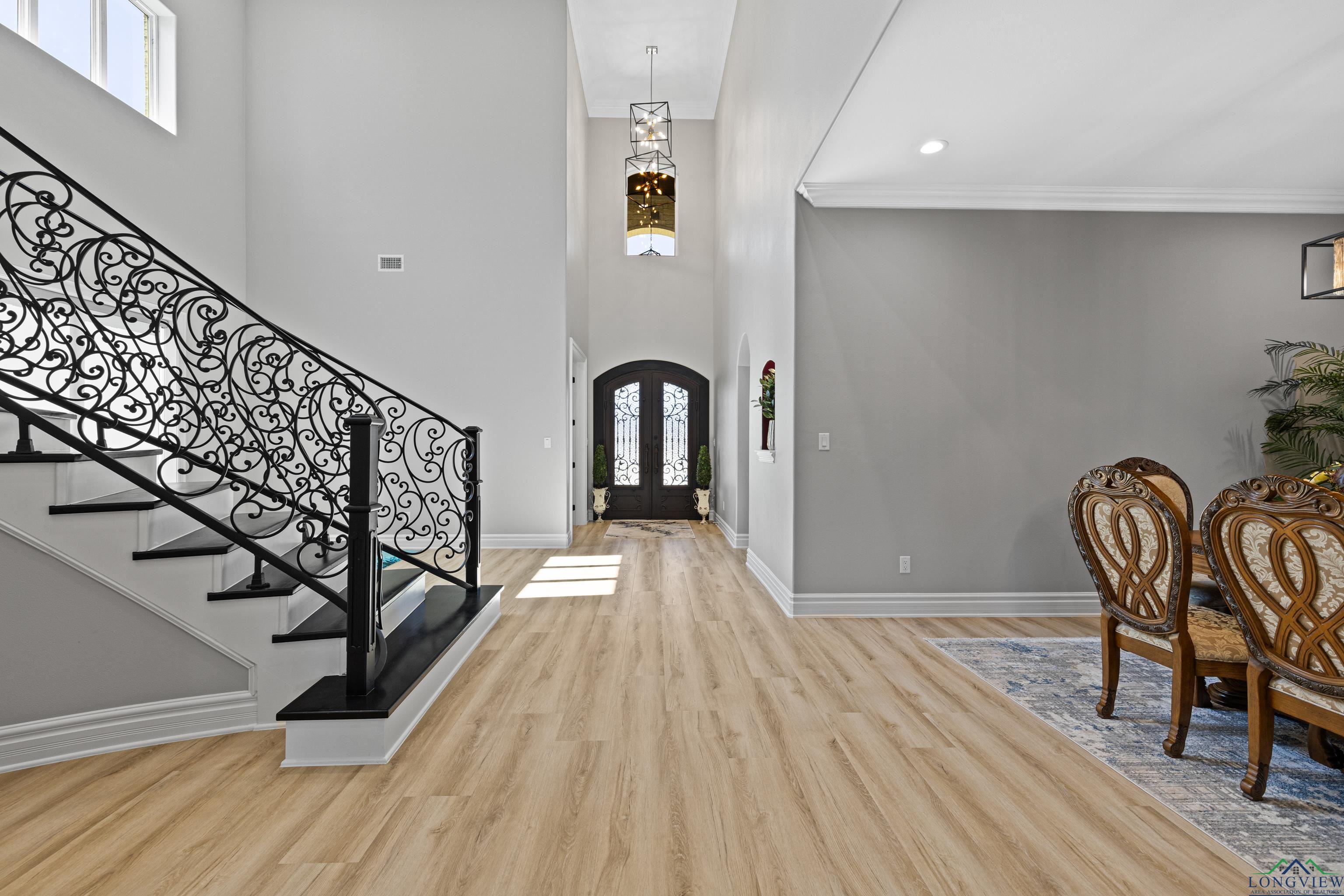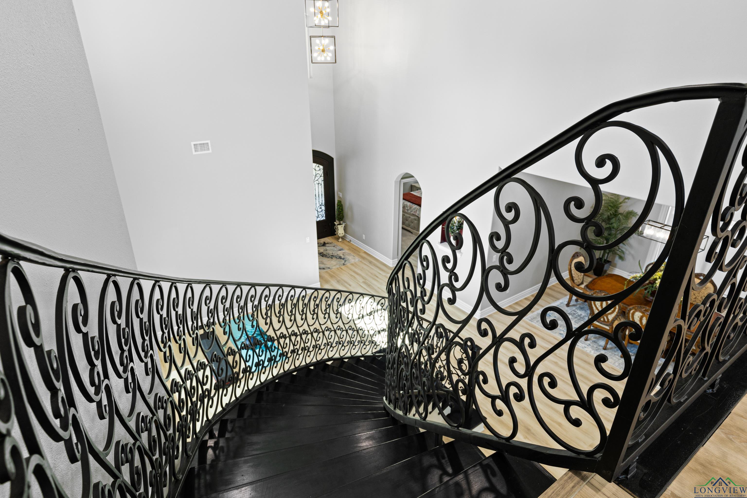 Exquisite custom luxury home with ~25-ft ceilings, custom iron doors, and tall windows flooding the living room with natural light. Features 6 beds (4 up, 2 down), office, media room, game room, and large bonus room with bar and cooler. Living room includes handmade box tray ceilings, gas fireplace, built-in speakers, and remote blinds. Chefs kitchen offers a huge elegant quartz-topped island with a breakfast bar perfect for entertaining, high-end WOLF stainless appliances, 4 burner gas cooktop with pot filler and griddle, BOSCH double ovens, farmhouse sink, herringbone backsplash, oversized pantry, and fridge included. Primary suite has bay window, remote blinds, a massive dual-entry closet with built-ins, and spa bath with soaker tub, 3 sided glass-walled shower (rainfall + dual heads), dual vanities, enclosed toilet. Most beds near baths; one guest bath with tub/shower, others with walk-in showers. Extras: 4 A/C units, spray foam insulation, 2 tankless gas hot water heaters, wide doors, full security system with wired cameras, modern fans & fixtures, elegant quartz and granite surfaces in bathrooms and kitchen, generator-ready, massive laundry/mudroom with storage and beautiful patterned tile, theater room (fits 12+ seats, popcorn machine), and several linen closets. Spacious walk-in closets throughout the home. Upstairs rooms can serve multiple purposes. Grand staircase features elegant black wrought-iron railings with intricate scrollwork and sleek black steps. Its graceful curved design serves as a stunning focal point in the foyer, complementing the open-concept layout and high ceilings. Brick exterior with Austin stone, 3-car garage doors insulated + small vehicle/motorcycle bay, auto sprinklers. Covered back patio has tall stained ceilings, a gas log fireplace, speakers, and capped utilities for future pool. Close to schools, dining, and shopping. 20 mins to Longview, Kilgore, and I-20. Meticulously crafted throughout, even the garage's epoxy-coated floor with decorative flakes reflects the homes high standards. Schedule your showing today!