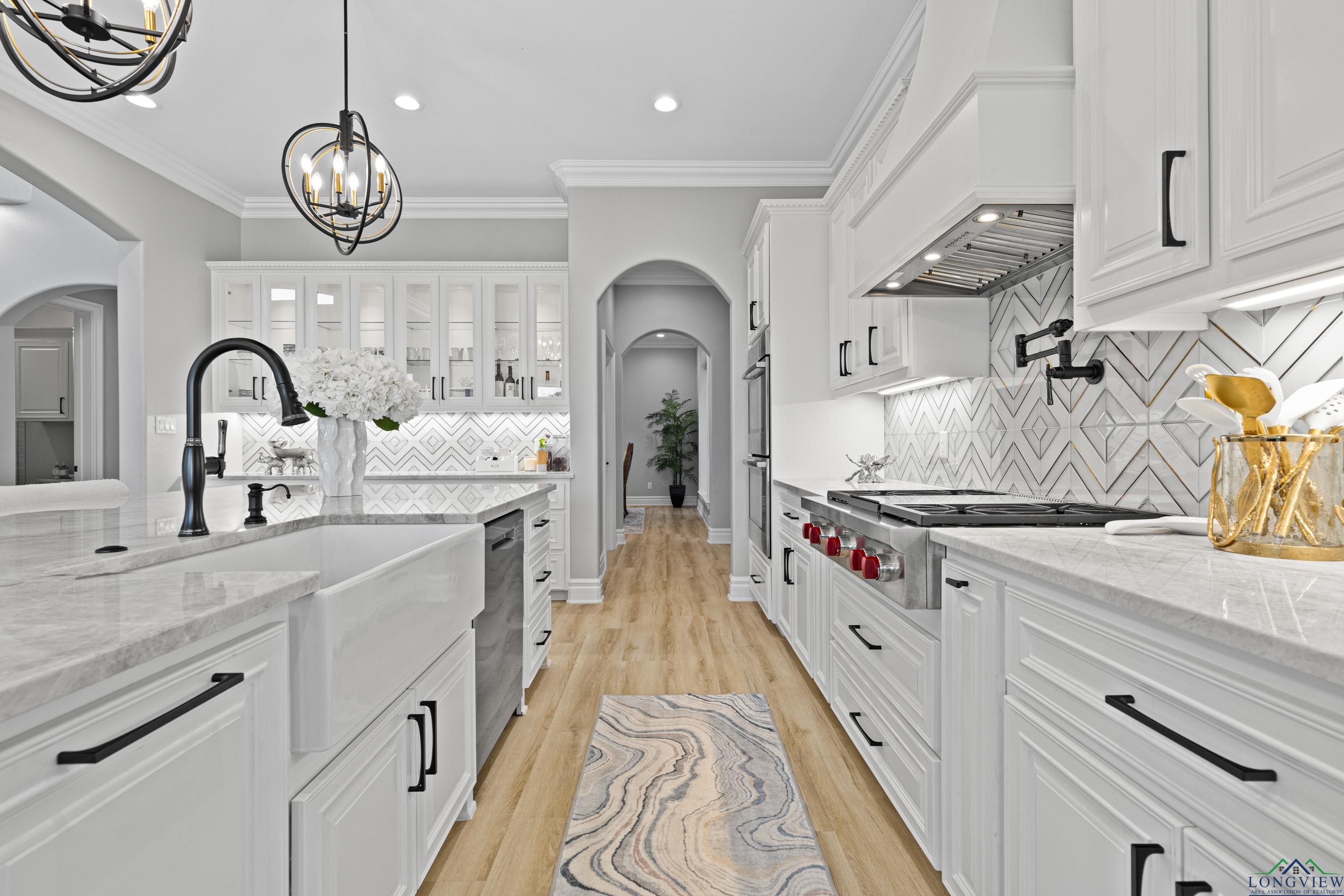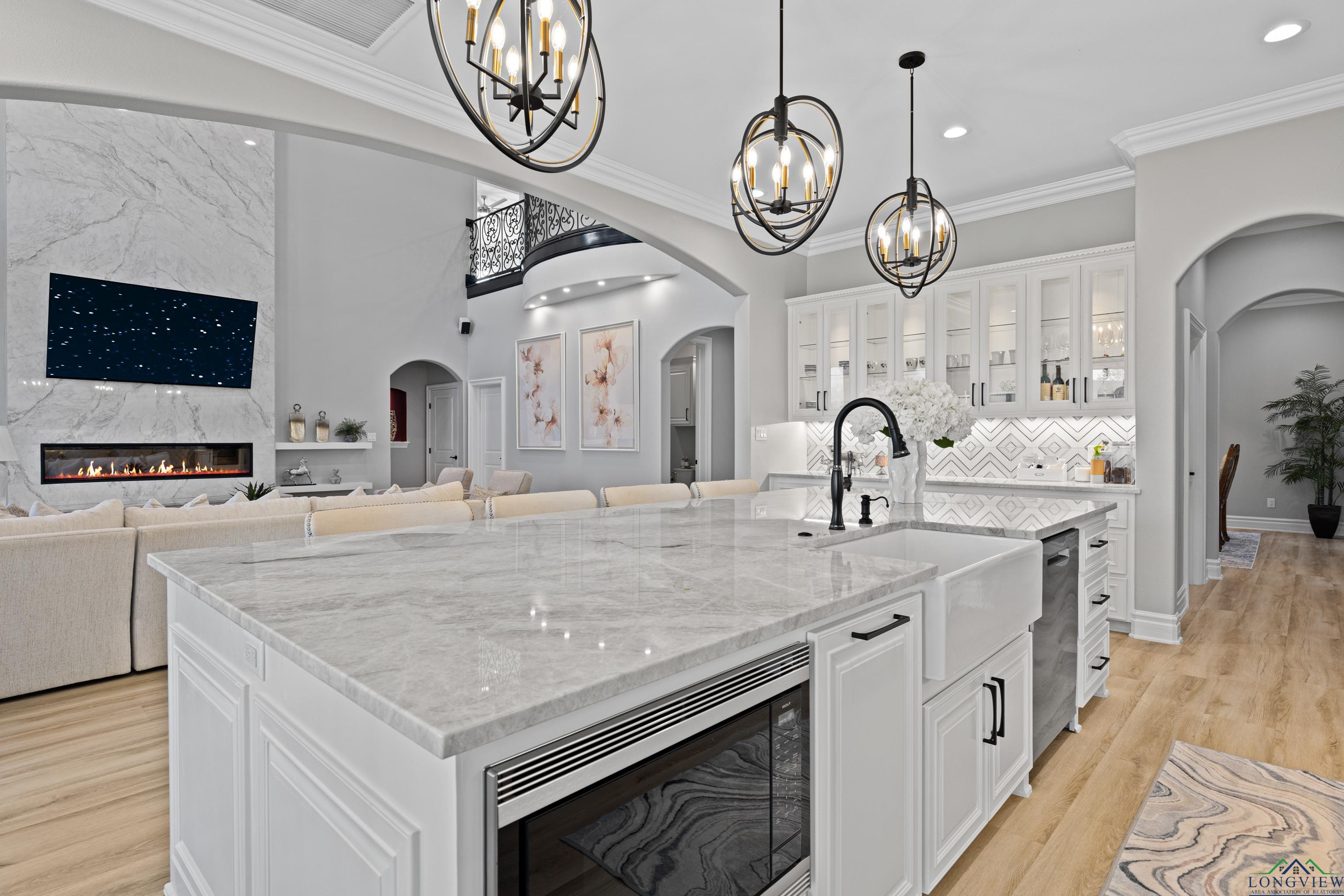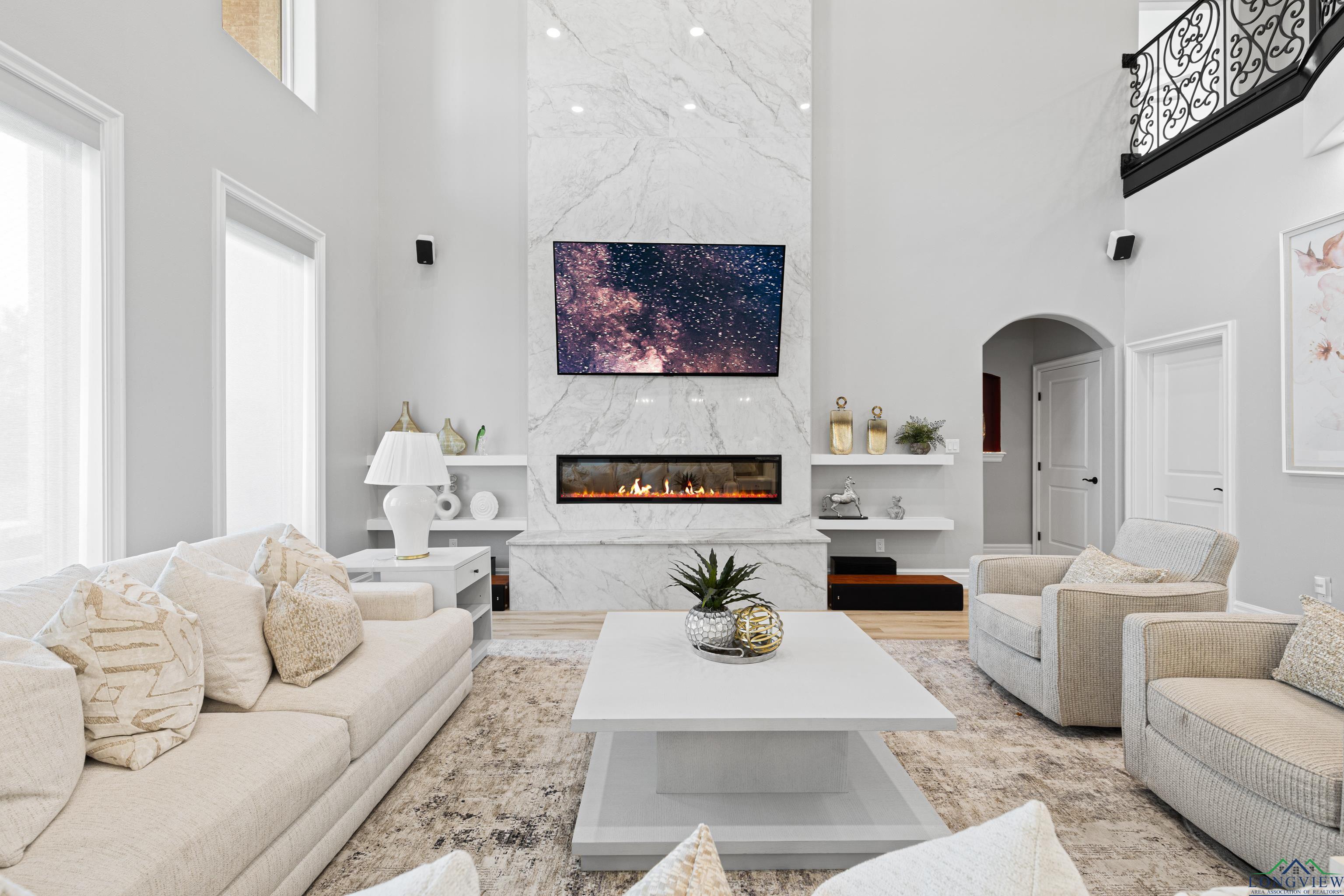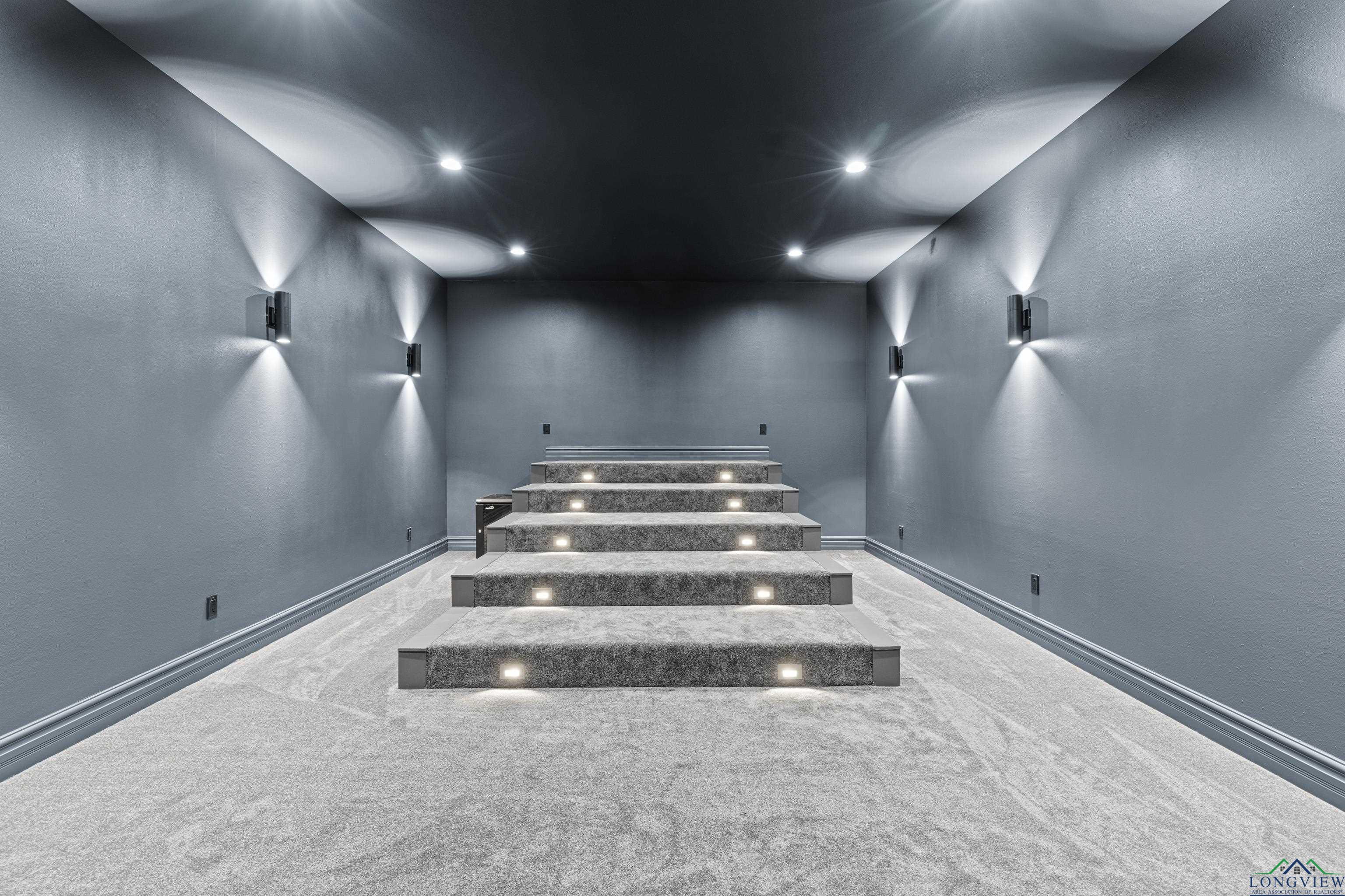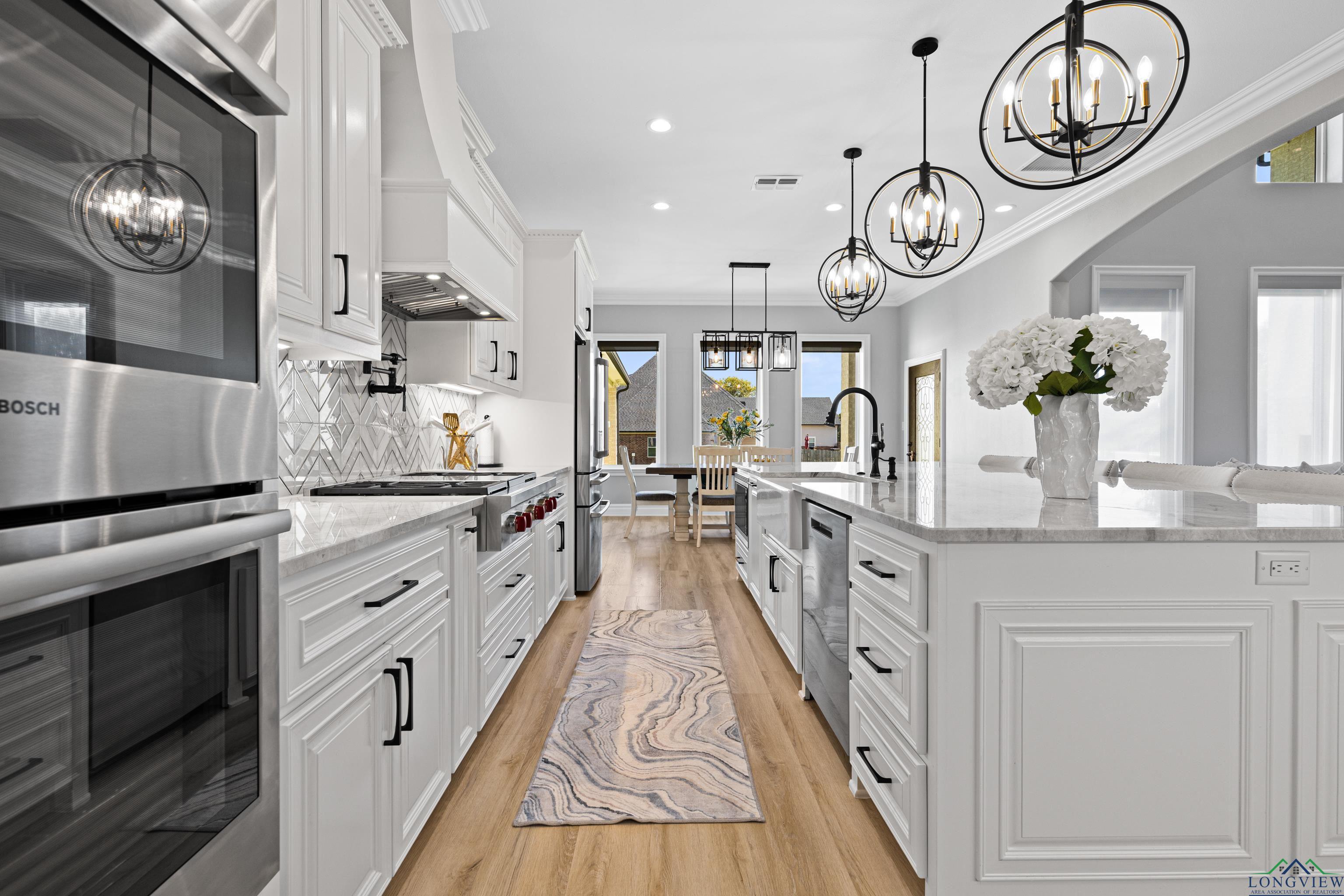 Exquisite custom luxury home with ~25-ft ceilings, custom iron doors, and tall windows flooding the living room with natural light. Features 6 beds (4 up, 2 down), office, media room, game room, and large bonus room with bar and cooler. Living room includes handmade box tray ceilings, gas fireplace, built-in speakers, and remote blinds. Chefs kitchen offers a huge elegant quartz-topped island with a breakfast bar perfect for entertaining, high-end WOLF stainless appliances, 4 burner gas cooktop with pot filler and griddle, BOSCH double ovens, farmhouse sink, herringbone backsplash, oversized pantry, and fridge included. Primary suite has bay window, remote blinds, a massive dual-entry closet with built-ins, and spa bath with soaker tub, 3 sided glass-walled shower (rainfall + dual heads), dual vanities, enclosed toilet. Most beds near baths; one guest bath with tub/shower, others with walk-in showers. Extras: 4 A/C units, spray foam insulation, 2 tankless gas hot water heaters, wide doors, full security system with wired cameras, modern fans & fixtures, elegant quartz and granite surfaces in bathrooms and kitchen, generator-ready, massive laundry/mudroom with storage and beautiful patterned tile, theater room (fits 12+ seats, popcorn machine), and several linen closets. Spacious walk-in closets throughout the home. Upstairs rooms can serve multiple purposes. Grand staircase features elegant black wrought-iron railings with intricate scrollwork and sleek black steps. Its graceful curved design serves as a stunning focal point in the foyer, complementing the open-concept layout and high ceilings. Brick exterior with Austin stone, 3-car garage doors insulated + small vehicle/motorcycle bay, auto sprinklers. Covered back patio has tall stained ceilings, a gas log fireplace, speakers, and capped utilities for future pool. Close to schools, dining, and shopping. 20 mins to Longview, Kilgore, and I-20. Meticulously crafted throughout, even the garage's epoxy-coated floor with decorative flakes reflects the homes high standards. Schedule your showing today!