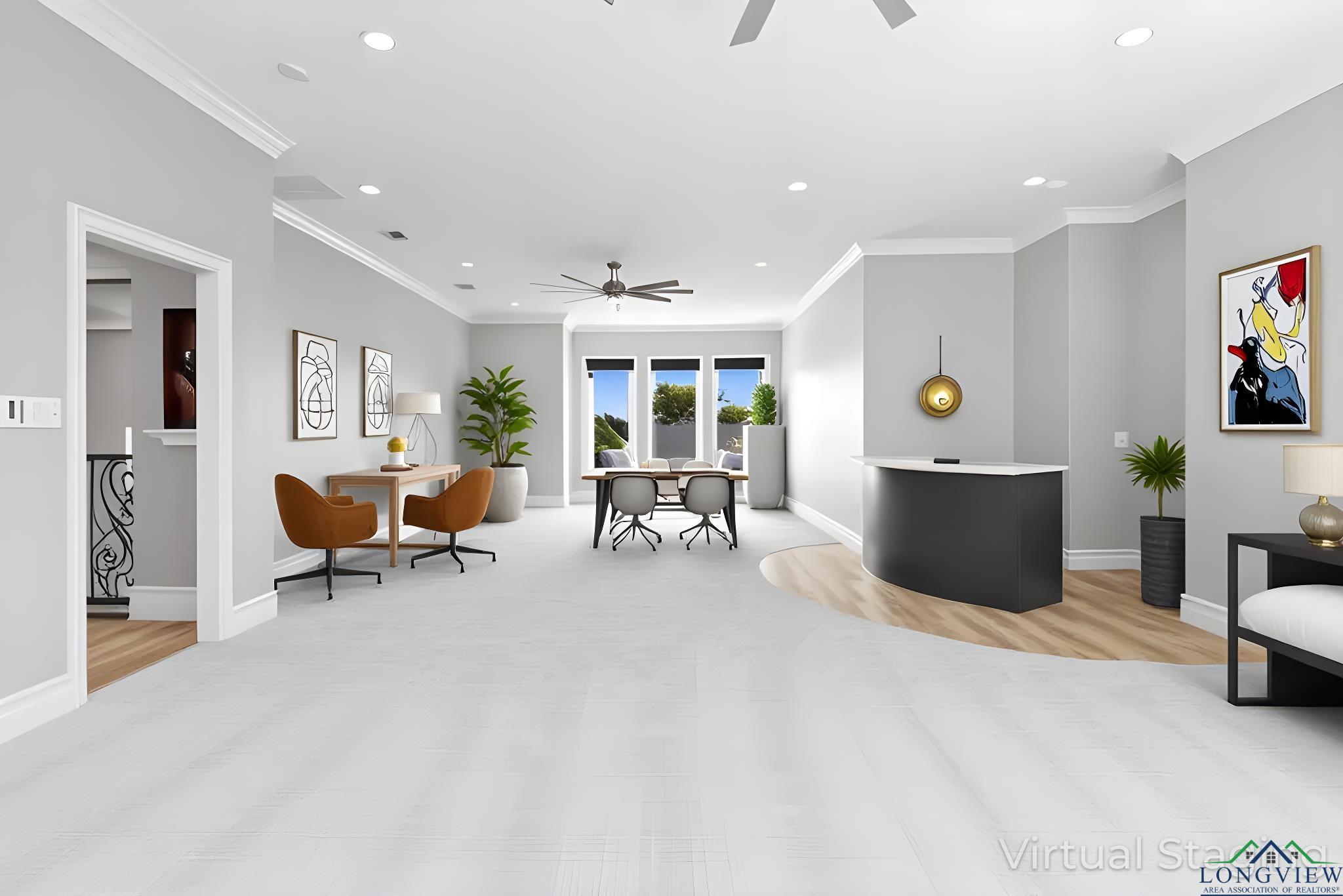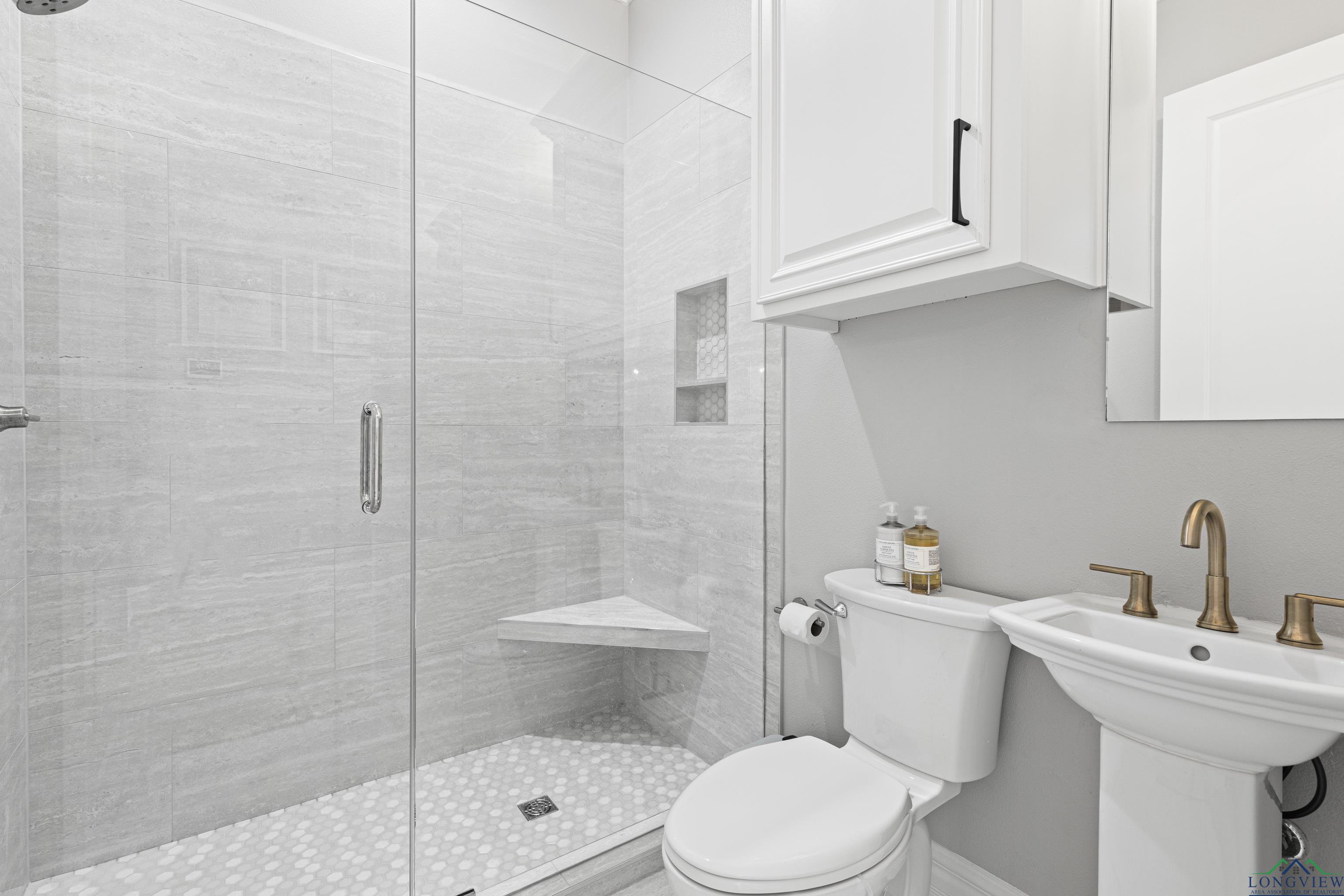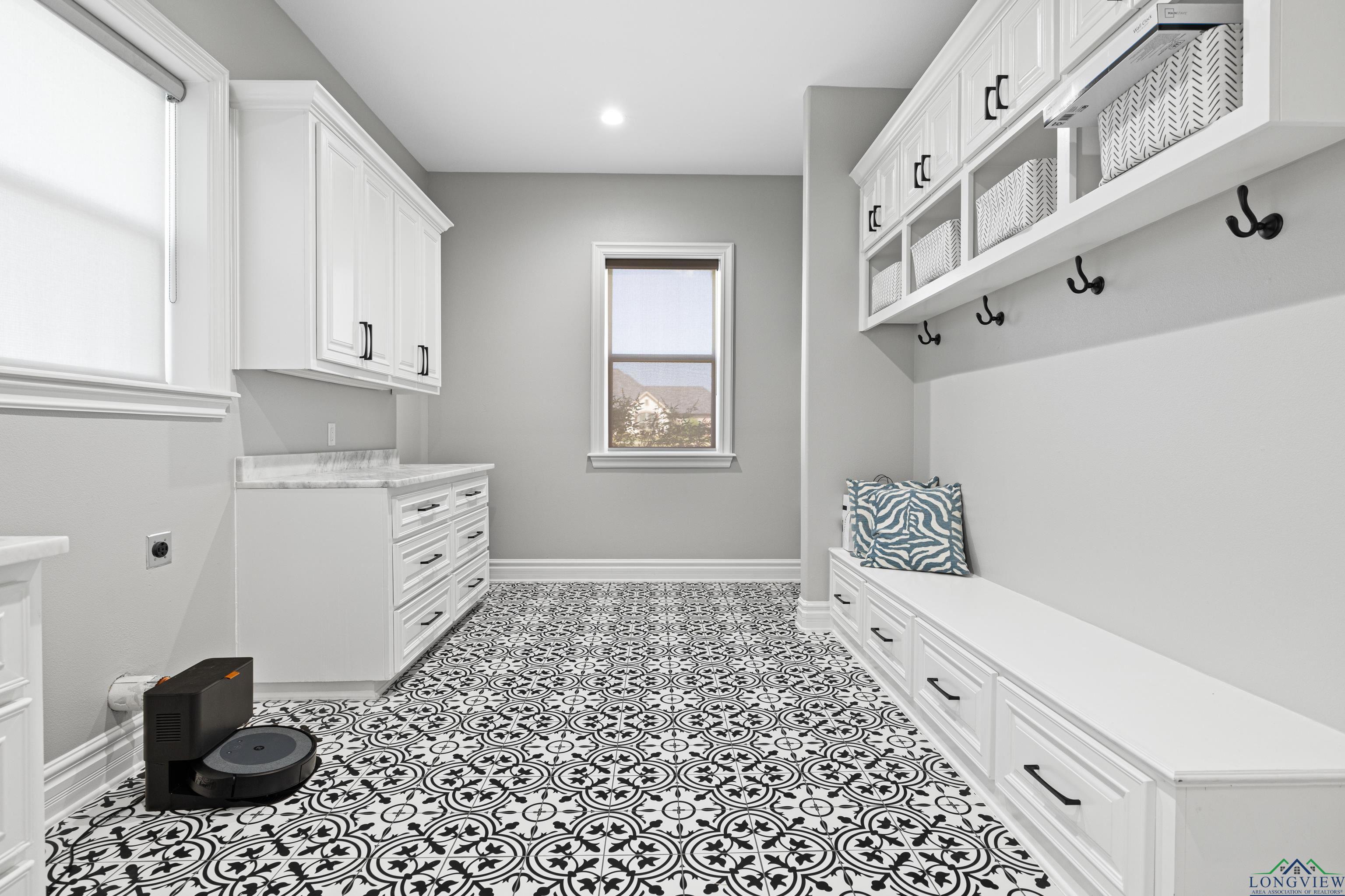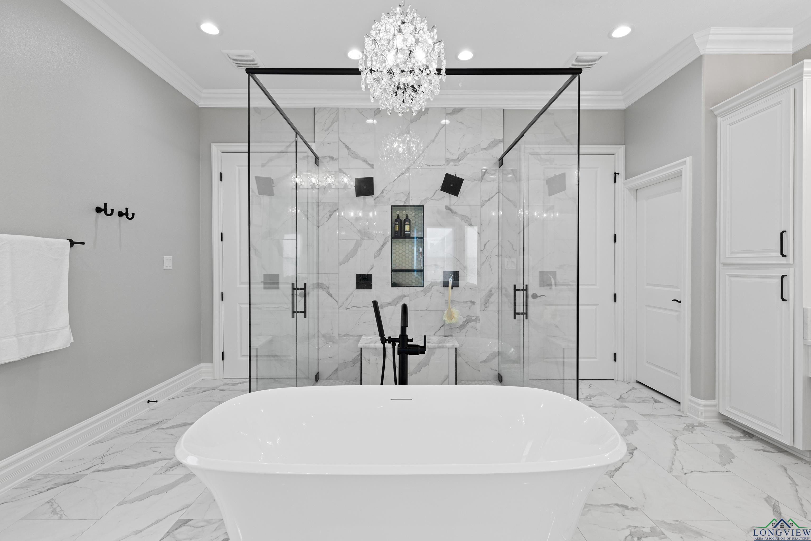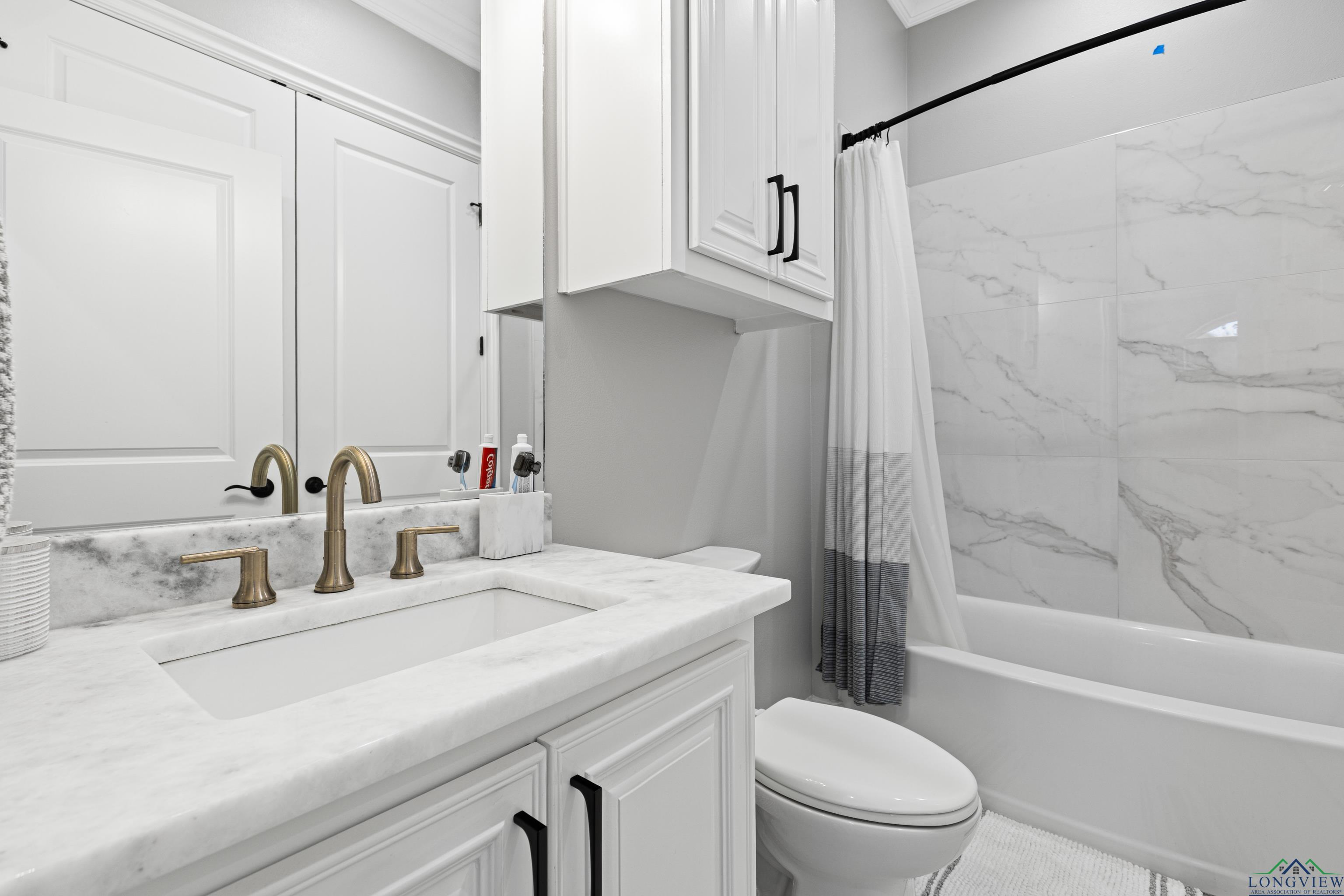 Exquisite custom luxury home with ~25-ft ceilings, custom iron doors, and tall windows flooding the living room with natural light. Features 6 beds (4 up, 2 down), office, media room, game room, and large bonus room with bar and cooler. Living room includes handmade box tray ceilings, gas fireplace, built-in speakers, and remote blinds. Chefs kitchen offers a huge elegant quartz-topped island with a breakfast bar perfect for entertaining, high-end WOLF stainless appliances, 4 burner gas cooktop with pot filler and griddle, BOSCH double ovens, farmhouse sink, herringbone backsplash, oversized pantry, and fridge included. Primary suite has bay window, remote blinds, a massive dual-entry closet with built-ins, and spa bath with soaker tub, 3 sided glass-walled shower (rainfall + dual heads), dual vanities, enclosed toilet. Most beds near baths; one guest bath with tub/shower, others with walk-in showers. Extras: 4 A/C units, spray foam insulation, 2 tankless gas hot water heaters, wide doors, full security system with wired cameras, modern fans & fixtures, elegant quartz and granite surfaces in bathrooms and kitchen, generator-ready, massive laundry/mudroom with storage and beautiful patterned tile, theater room (fits 12+ seats, popcorn machine), and several linen closets. Spacious walk-in closets throughout the home. Upstairs rooms can serve multiple purposes. Grand staircase features elegant black wrought-iron railings with intricate scrollwork and sleek black steps. Its graceful curved design serves as a stunning focal point in the foyer, complementing the open-concept layout and high ceilings. Brick exterior with Austin stone, 3-car garage doors insulated + small vehicle/motorcycle bay, auto sprinklers. Covered back patio has tall stained ceilings, a gas log fireplace, speakers, and capped utilities for future pool. Close to schools, dining, and shopping. 20 mins to Longview, Kilgore, and I-20. Meticulously crafted throughout, even the garage's epoxy-coated floor with decorative flakes reflects the homes high standards. Schedule your showing today!