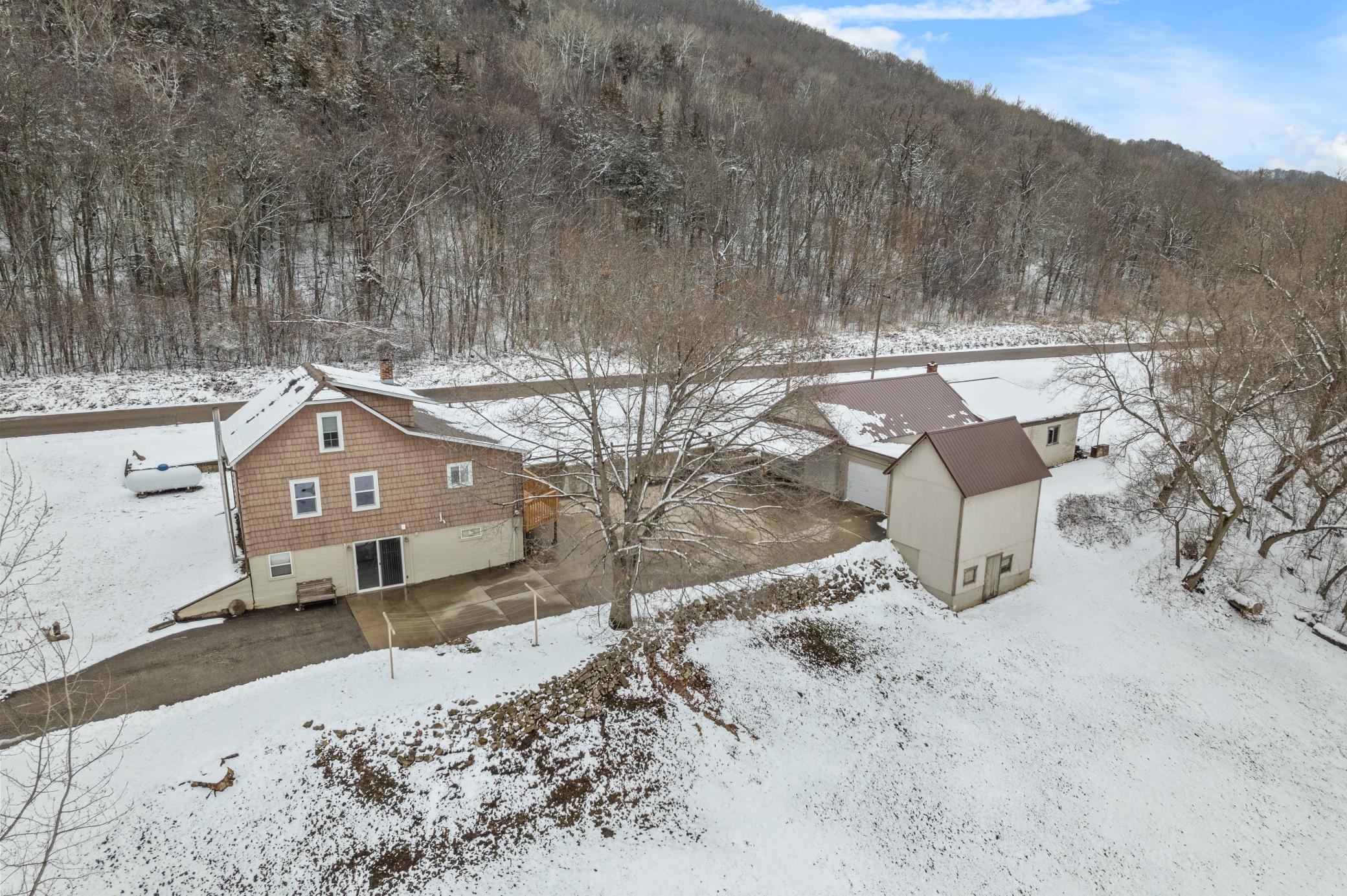 Located on the Wisconsin Great River Road just outside of Alma, this property offers incredible views in every direction. It's rural so the deer, eagles and migratory birds you'll see, and youre just minutesfrom several public boat landings on the Mississippi River. Youll have over 1,600 sq ft of garage and outdoor building space, including a garage you could park 4vehicles in, a small barn, and multiple sheds perfect for projects, animals, or extra storage.The well-maintained home features hardwood floors, abundant natural light, a spacious deck for relaxing,and a lower-level walk-out for added living space. Major updates include: all roofs replaced in 2021 with a 50-year warranty, low-maintenance shake-style vinyl siding, and a brand-new furnace and central air in 2024.With room for gardens, play, and peaceful country living, this one truly has it all.