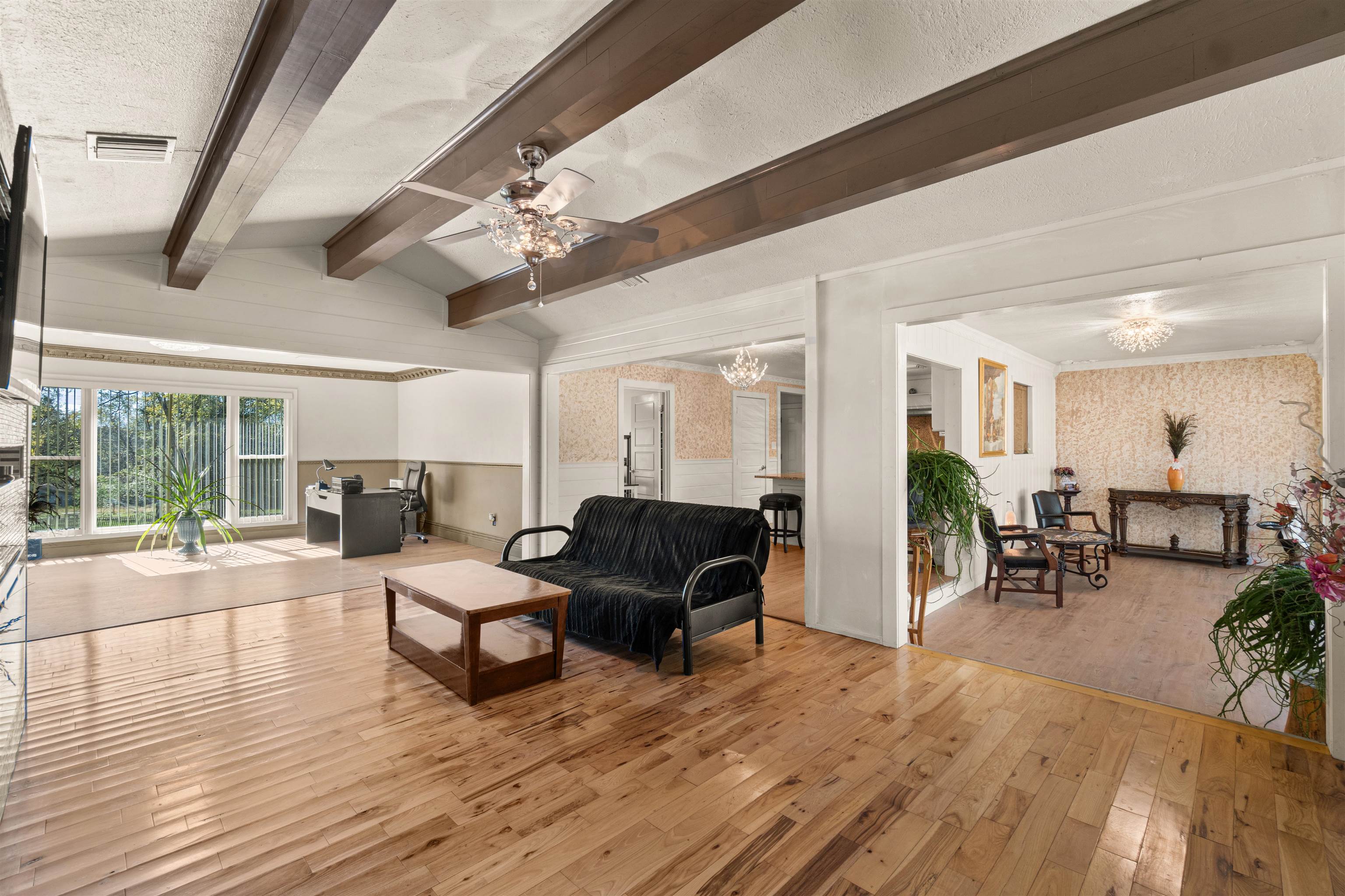 This beautifully remodeled home features three bedrooms and two full bathrooms, spanning just under 2600 sq ft with an open floor plan. Situated on a 3.9-acre property, it's conveniently located just a five-minute walk from downtown Hughes Springs. The updates of this brick beauty, offers a stunning backdrop of woods leading to a vast forest teeming with wildlife. Inside, custom crown molding adorns the home, which has been redesigned for entertainment with two large living rooms. One boasts a custom bar with a granite top for a striking effect, while the other features a custom TV and a color-adjustable electric fireplace for ambiance. The kitchen has been fully updated with granite countertops, new stainless-steel appliances, an oversized Carus sink, and a spacious walk-in pantry, complemented by custom cabinets with a built-in spice rack, lazy susan, and trash compartment. The dining room, or "glass room," presents a wall of laminated bronze glass, offering serene views of the forest. Additionally, the home includes an office with a large window, a separate laundry room with shelving, and double glass French doors that lead to a 500 sq ft enclosed deck with panoramic woodland views that is perfect for entertaining guest and play area. The master bedroom is paired with a sizable walk-in closet, and the covered garage accommodates two vehicles and includes a spacious workroom and storage area. Located near downtown and within the esteemed Hughes Springs school district, this property also features a backyard fire pit for outdoor enjoyment. Check it out for a rare find in a sought-after location.